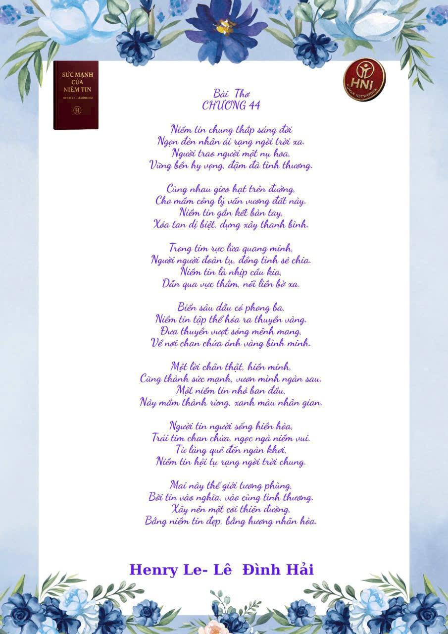 HNI 3-11 - B6 💥💥💥 BÀI THƠ CHƯƠNG 44 NIÊM TIN CHUNG THẮP SÁNG ĐỜI Ngọn đèn nhân ái rạng ngời trời xa. Người trao người một nụ hoa, Vững bền hy vọng, đậm đà tình thương. Cùng nhau gieo hạt trên đường, Cho mầm công lý vấn vương đất này. Niềm tin gắn kết bàn tay, Xóa tan dị biệt, dựng xây thanh bình. Trong tim rực lửa quang minh, Người người đoàn tụ, đồng tình sẻ chia. Niềm tin là nhịp cầu kia, Dẫn qua vực thẳm, nối liền bờ xa. Biển sâu dẫu có phong ba, Niềm tin tập thể hóa ra thuyền vàng. Đưa thuyền vượt sóng mênh mang, Về nơi chan chứa ánh vàng bình minh. Một lời chân thật, hiền minh, Cũng thành sức mạnh, vươn mình ngàn sau. Một niềm tin nhỏ ban đầu, Nảy mầm thành rừng, xanh màu nhân gian. Người tin người sống hiền hòa, Trái tim chan chứa, ngọc ngà niềm vui. Từ làng quê đến ngàn khơi, Niềm tin hội tụ rạng ngời trời chung. Mai này thế giới tương phùng, Bởi tin vào nghĩa, vào cùng tình thương. Xây nên một cõi thiên đường, Bằng niềm tin đẹp, bằng hương nhân hòa.