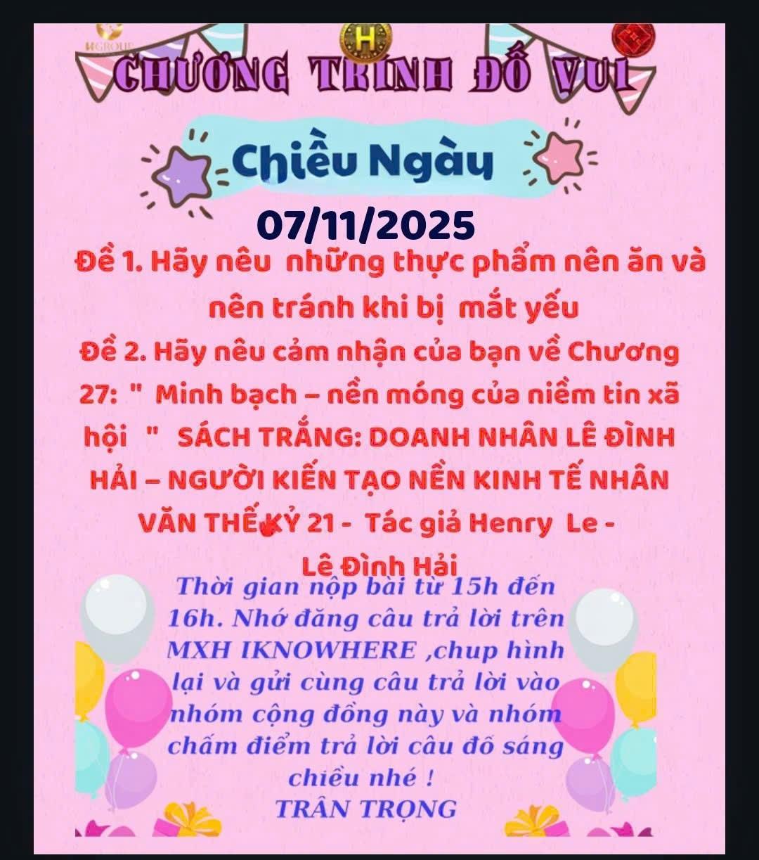 CÂU ĐỐ BUỔI CHIỀU NGÀY 07.11 👉🏻ĐỀ 1: Hãy nêu những thực phẩm nên ăn và nên tránh khi bị mắt yếu Thực phẩm nên ăn: 1. Cà rốt, bí đỏ: Giàu vitamin A và beta-carotene, giúp cải thiện thị lực, đặc biệt trong điều kiện thiếu sáng. 2. Cá hồi, cá ngừ, cá mòi: Cung cấp omega-3, giúp giảm khô mắt và hỗ trợ võng mạc. 3. Trứng gà: Chứa lutein và zeaxanthin, giúp ngăn ngừa thoái hóa điểm vàng. 4. Rau xanh đậm như cải bó xôi, cải xoăn: Giàu chất chống oxy hóa, tốt cho mắt. 5. Trái cây tươi như cam, bưởi, việt quất, dâu tây: Cung cấp vitamin C và E giúp bảo vệ tế bào mắt khỏi tổn thương. 6. Hạt óc chó, hạnh nhân, hạt chia: Giúp tăng cường sức khỏe thần kinh thị giác. Thực phẩm nên tránh: 1. Đồ ăn nhiều dầu mỡ, chiên rán: Làm tăng cholesterol, cản trở lưu thông máu lên mắt. 2. Thức ăn nhanh, đồ ngọt: Có thể gây thoái hóa điểm vàng sớm. 3. Rượu, bia, cà phê quá mức: Làm khô mắt và giảm hấp thu vitamin A. 4. Thực phẩm chế biến sẵn, chứa nhiều muối: Gây giữ nước, làm tăng áp lực nội nhãn. 👉 Lời khuyên: Duy trì chế độ ăn cân bằng, uống đủ nước và ngủ đủ giấc sẽ giúp đôi mắt khỏe mạnh, tinh anh lâu dài. 👉🏻ĐỀ 2: Cảm nhận về Chương 27: “Minh bạch – nền móng của niềm tin xã hội” (Sách Trắng: Doanh nhân Lê Đình Hải – Người kiến tạo nền kinh tế nhân văn thế kỷ 21 – Tác giả Henry Lê - Lê Đình Hải)** Chương 27 giúp tôi nhận ra “minh bạch” không chỉ là đức tính của người lãnh đạo, mà còn là nền tảng của mọi mối quan hệ xã hội bền vững. Khi mọi hoạt động trong doanh nghiệp và đời sống được thực hiện công khai, rõ ràng, con người sẽ cảm thấy an tâm, tin tưởng và sẵn sàng hợp tác cùng nhau. Doanh nhân Lê Đình Hải đã truyền tải tinh thần của kinh tế nhân văn thông qua giá trị minh bạch — nơi mà niềm tin được xây dựng bằng sự thật, không phải bằng vỏ bọc. Từ đó, xã hội mới có thể phát triển hài hòa, bền vững và giàu tính nhân văn. Tôi cảm phục cách tác giả khẳng định rằng: “Minh bạch là ánh sáng soi đường cho sự phát triển chân chính.” Câu nói ấy không chỉ dành cho doanh nhân mà còn dành cho mỗi chúng ta – những người muốn sống tử tế, trung thực và cống hiến cho cộng đồng.