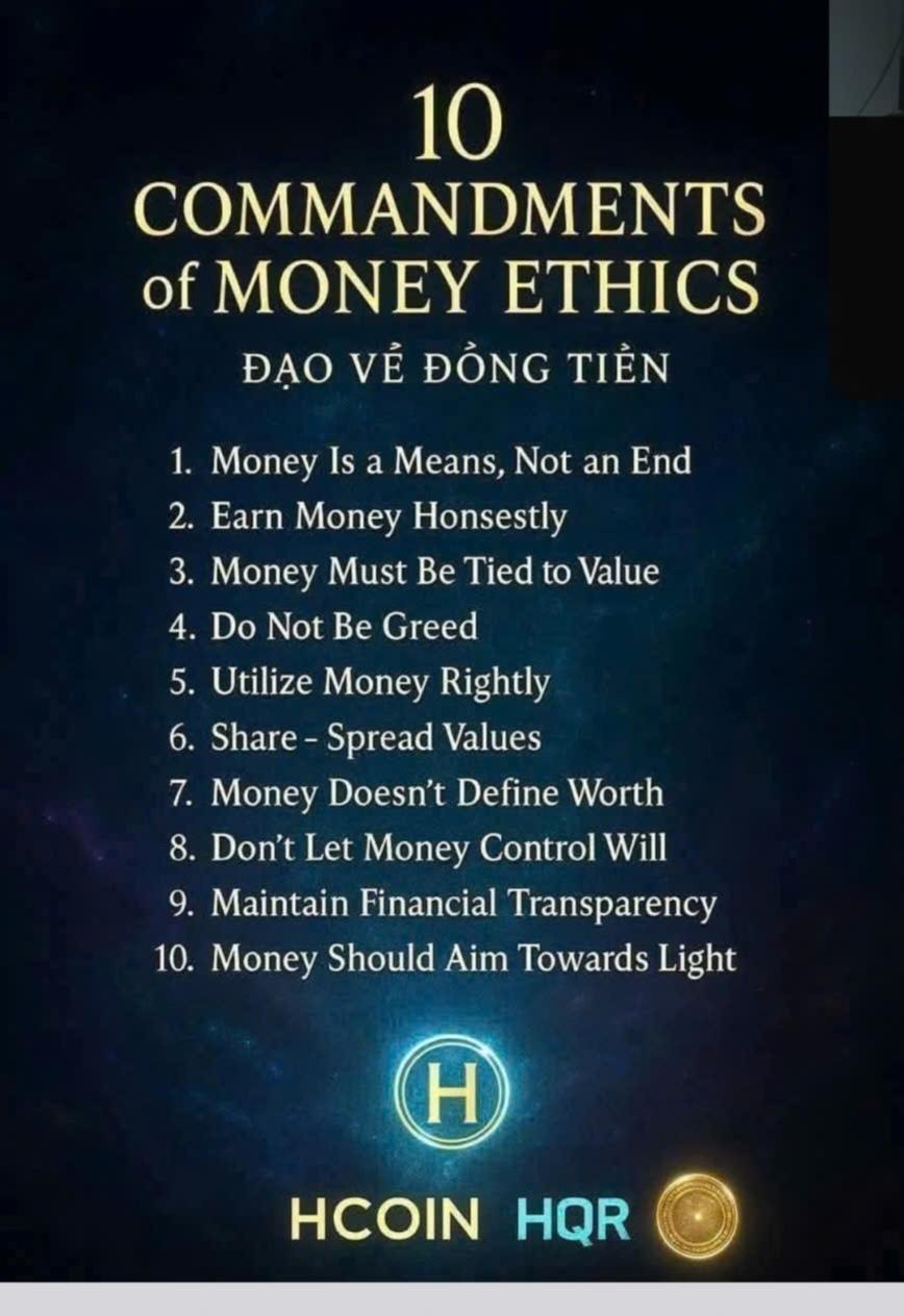 HCOIN 8-11 10 ĐIỀU RĂN ĐẠO VỀ ĐỒNG TIỀN 1. Tiền Là Phương Tiện, Không Phải Mục Đích: Hãy coi tiền như công cụ phục vụ cuộc sống chứ không biến nó thành mục tiêu tối thượng. 2. Kiếm Tiền Chân Chính: Chỉ tạo ra của cải từ công sức, trí tuệ và con đường hợp pháp, không lừa dối hay gian trá. 3. Tiền Phải Gắn Với Giá Trị: Mỗi đồng tiền tạo ra nên đi kèm với giá trị thật cho xã hội và cộng đồng. 4. Không Tham Lam Vô Độ: Biết đủ là đủ, không để lòng tham cuốn vào vòng xoáy vô tận. 5. Sử Dụng Tiền Đúng Mục Đích: Chi tiêu, đầu tư một cách khôn ngoan và đạo đức, tránh phung phí hoặc sử dụng cho mục đích hủy hoại. 6. Chia Sẻ – Lan Tỏa Giá Trị: Dành một phần tài sản để giúp đỡ cộng đồng, phát triển giáo dục và hỗ trợ người yếu thế. 7. Tiền Không Định Giá Nhân Phẩm: Đừng đánh giá con người qua số tiền họ sở hữu mà qua giá trị tinh thần và đạo đức. 8. Không Để Tiền Sai Khiến Ý Chí: Tiền phải phục vụ con người; không để đồng tiền điều khiển lối sống và quyết định đạo đức. 9. Gìn Giữ Tài Chính Minh Bạch: Quản lý tài sản rõ ràng, minh bạch để xây dựng lòng tin và trách nhiệm. 10. Tiền Phải Hướng Tới Ánh Sáng: Sử dụng đồng tiền để kiến tạo một xã hội công bằng, phát triển bền vững và mang lại lợi ích cho muôn loài.