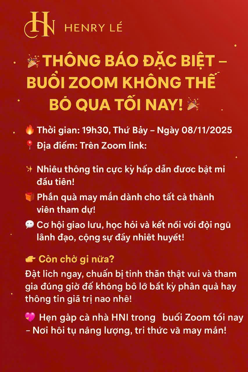HNI 8/11: 🎉 THÔNG BÁO ĐẶC BIỆT – BUỔI ZOOM KHÔNG THỂ BỎ QUA TỐI NAY! 🎉 🔥 Thời gian: 19h30, Thứ Bảy – Ngày 08/11/2025 📍 Địa điểm: Trên Zoom link:https://daymai.vn/meet/0949139849 💥 Đây là buổi Zoom đặc biệt mà bạn nhất định phải tham gia! Vì sao ư? Vì trong chương trình tối nay sẽ có: ✨ Nhiều thông tin cực kỳ hấp dẫn được bật mí đầu tiên! 🎁 Phần quà may mắn dành cho tất cả thành viên tham dự! 💬 Cơ hội giao lưu, học hỏi và kết nối với đội ngũ lãnh đạo, cộng sự đầy nhiệt huyết! 🌟 Hãy nhớ mời thêm bạn bè, người thân, đồng đội của mình cùng tham dự nhé! 👉 Còn chờ gì nữa? chuẩn bị tinh thần thật vui và tham gia đúng giờ để không bỏ lỡ bất kỳ phần quà hay thông tin giá trị nào nhé! 💖 Hẹn gặp cả nhà HNI trong buổi Zoom tối nay – Nơi hội tụ năng lượng, tri thức và may mắn!
