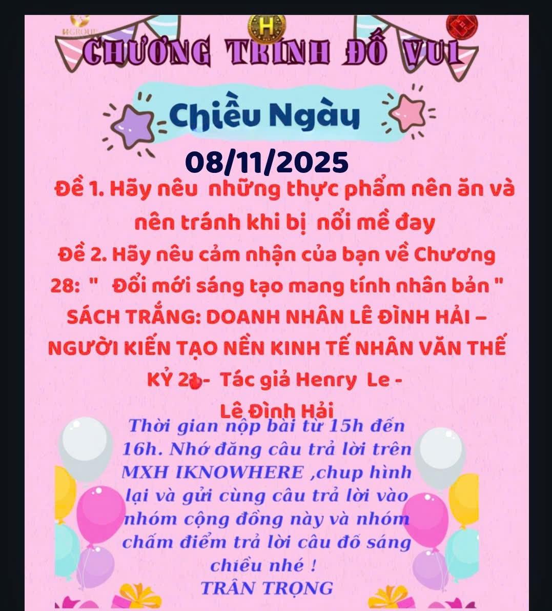 CÂU ĐỐ BUỔI CHIỀU NGÀY 08.11 Câu 1: Những thực phẩm nên ăn và nên tránh khi bị nổi mề đay 🌹Thực phẩm nên ăn: 1. Rau xanh: như rau má, rau diếp cá, cải bó xôi, giúp thanh nhiệt, giải độc cơ thể. 2. Trái cây tươi: đặc biệt là cam, táo, lê, dưa hấu… chứa nhiều vitamin C tăng sức đề kháng, giảm viêm ngứa. 3. Thực phẩm giàu omega-3: như cá hồi, hạt chia, hạt lanh – giúp chống viêm, làm dịu các phản ứng dị ứng. 4. Ngũ cốc nguyên hạt: như yến mạch, gạo lứt giúp ổn định đường huyết, giảm kích ứng da. 5. Uống nhiều nước: giúp đào thải độc tố và hỗ trợ da phục hồi nhanh hơn. 🌹Thực phẩm nên tránh: 1. Hải sản và thực phẩm dễ gây dị ứng: như tôm, cua, mực, cá biển. 2. Thực phẩm cay nóng, nhiều gia vị: như ớt, tiêu, tỏi sống – có thể làm tình trạng ngứa rát nghiêm trọng hơn. 3. Đồ ăn nhanh, chiên rán, nhiều dầu mỡ – dễ gây nóng trong người. 4. Rượu, bia, cà phê và nước ngọt có gas – làm tăng phản ứng dị ứng và giảm hiệu quả thuốc. 5. Thực phẩm chứa chất bảo quản, phẩm màu – dễ làm mề đay bùng phát mạnh. 👉 Người bị nổi mề đay cần giữ vệ sinh da sạch, nghỉ ngơi đầy đủ và ăn uống điều độ để cơ thể nhanh hồi phục. Câu 2: Chương 28 – “Đổi mới sáng tạo mang tính nhân bản” (Sách Trắng: Doanh nhân Lê Đình Hải – Người kiến tạo nền kinh tế nhân văn thế kỷ 23, tác giả Henry Le – Lê Đình Hải) giúp tôi hiểu rằng đổi mới sáng tạo không chỉ là tạo ra điều mới lạ về công nghệ hay sản phẩm, mà còn là sự sáng tạo mang giá trị nhân văn – hướng tới con người và cộng đồng. Tác giả Lê Đình Hải đã truyền cảm hứng về tinh thần sáng tạo vì con người, đặt yếu tố đạo đức, lòng nhân ái và ý thức phụng sự lên hàng đầu trong mọi hành động kinh doanh. Em cảm nhận được rằng, chỉ khi con người sáng tạo với tâm trong sáng và mục tiêu phục vụ xã hội, thì sự đổi mới ấy mới thật sự bền vững và có ý nghĩa.