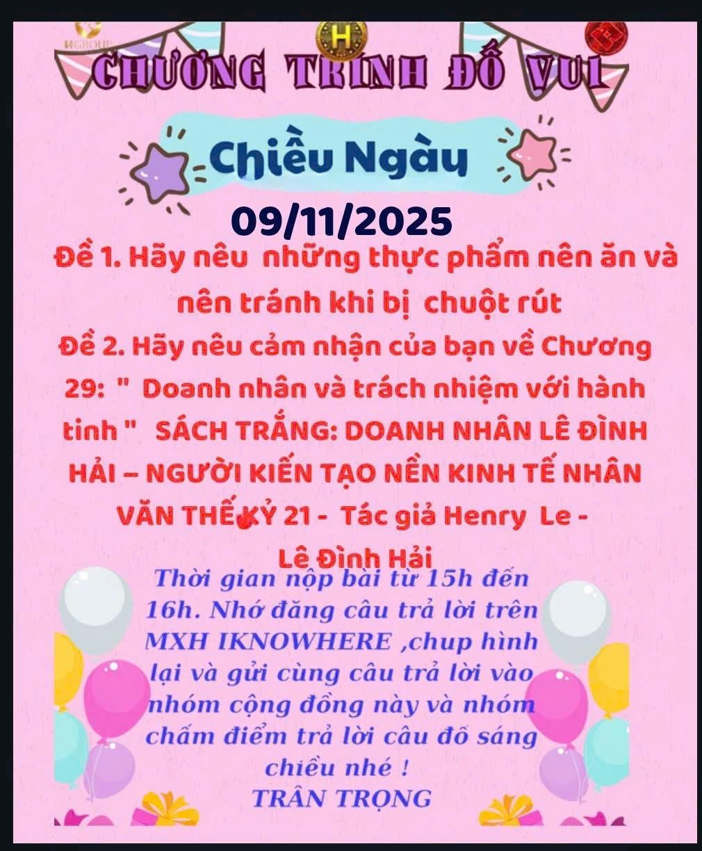 CÂU ĐỐ CHIỀU 09/11: Câu 1: Những thực phẩm nên ăn và nên tránh khi bị chuột rút 1. Thực phẩm nên ăn: Khi bị chuột rút, cơ thể thường thiếu khoáng chất (magie, canxi, kali) hoặc mất nước, nên cần bổ sung:    •   🥬 Thực phẩm giàu magie: rau chân vịt, bơ, hạnh nhân, hạt bí, chuối.    •   🧀 Thực phẩm giàu canxi: sữa, phô mai, sữa chua, cá mòi, đậu phụ.    •   🍊 Thực phẩm giàu kali: chuối, khoai lang, cam, dưa hấu.    •   💧 Uống đủ nước: đặc biệt là nước khoáng có chứa điện giải (Na, K, Mg).    •   🐟 Cá béo (cá hồi, cá thu): chứa omega-3 giúp giảm viêm cơ. 2. Thực phẩm nên tránh:    •   Thức ăn quá mặn: làm mất cân bằng điện giải, dễ gây co cơ.    •   Đồ uống có cồn, cà phê, nước ngọt có ga: gây mất nước, tăng nguy cơ chuột rút.    •   Thức ăn nhanh, nhiều dầu mỡ: khiến tuần hoàn kém, máu khó lưu thông đến cơ bắp.    •   Thực phẩm nhiều đường tinh luyện: làm tăng acid trong cơ, gây mỏi và co cơ. 👉 Lời khuyên: Ngoài ăn uống, nên vận động nhẹ, giãn cơ thường xuyên và ngủ đủ giấc để cơ bắp được phục hồi, tránh chuột rút tái phát. Câu 2: Cảm nhận Chương 29 – “Doanh nhân và trách nhiệm với hành tinh” (Trích từ SÁCH TRẮNG: DOANH NHÂN LÊ ĐÌNH HẢI – NGƯỜI KIẾN TẠO NỀN KINH TẾ NHÂN VĂN THẾ KỶ 21 – Tác giả Henry Le) Chương 29 mang đến một thông điệp sâu sắc về mối quan hệ giữa doanh nhân và Trái Đất – ngôi nhà chung của nhân loại. Tác giả Henry Lê – Lê Đình Hải không chỉ nói về kinh doanh vì lợi nhuận, mà còn nhấn mạnh trách nhiệm đạo đức, sinh thái và nhân văn của người lãnh đạo trong kỷ nguyên mới. Tôi cảm nhận được tinh thần phụng sự hành tinh, nơi mỗi doanh nhân được xem như người bảo vệ sự sống, chứ không chỉ là người tạo ra sản phẩm. Tư tưởng “doanh nhân xanh” mà tác giả truyền tải là lời kêu gọi mỗi cá nhân kinh doanh bền vững, hài hòa giữa phát triển kinh tế – bảo vệ môi trường – nâng cao ý thức con người. Điều tôi ấn tượng nhất là cách tác giả gắn trách nhiệm xã hội với trách nhiệm hành tinh: “Một doanh nhân nhân văn là người không chỉ tạo giá trị cho con người hôm nay, mà còn để lại di sản cho thế hệ mai sau.”