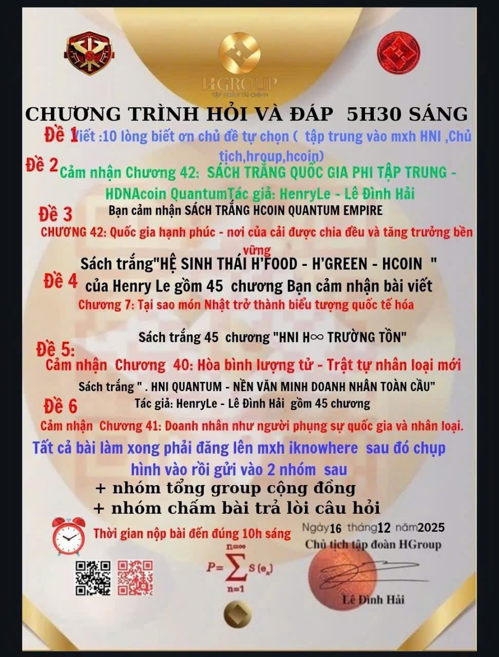 HNI 16/12 - BÀI THƠ CHƯƠNG 1 : ĐỊNH NGHĨA ĐẠO TRỜI – BẢN THỂ VẬN HÀNH CỦA VŨ TRỤ VÀ NHÂN SINH Đạo đến từ nơi không tiếng nói, Tựa hư không mà nuôi sống muôn loài. Không hình tướng, không tên gọi, không hình hài, Nhưng xoay chuyển cả đất trời đang thở. Đạo là gốc của mọi điều chân thật, Là dòng nguồn len lỏi giữa nhân sinh. Nhẹ như gió mà nâng bổng tâm linh, Mềm như nước mà xuyên qua vạn vật. Không ai thấy nhưng ai cũng đang ở trong Đạo, Dẫu lạc đường vẫn thuộc về vòng tay ấy dịu êm. Nắng ban mai, giọt mưa rơi, hạt bụi ấm nơi tim, Đều là nhịp của Đạo đang dìu từng khoảnh khắc. Đạo không thưởng – không phạt – không phân chia đúng sai, Chỉ vận hành theo quy luật tự nhiên bất biến. Ai thuận Đạo thì đời nở hoa hiền thiện, Ai nghịch Đạo thì tự chuốc lấy đoạn đường gai. Đạo mở lối bằng im lặng nhiệm màu, Đưa trí tuệ vượt ngoài điều mắt thấy. Người biết sống cùng Đạo – tâm an, lòng đầy đủ ấy, Hiểu rằng vũ trụ luôn nâng đỡ từng hơi thở nhiệm mầu. Hãy trở về với tĩnh lặng trong tim, Để nghe Đạo thầm thì tự thuở vô sơ xuất hiện. Khi con người biết thuận theo dòng vận chuyển, Sẽ thấy rằng Đạo luôn có mặt trong chính mình. Đọc thêm