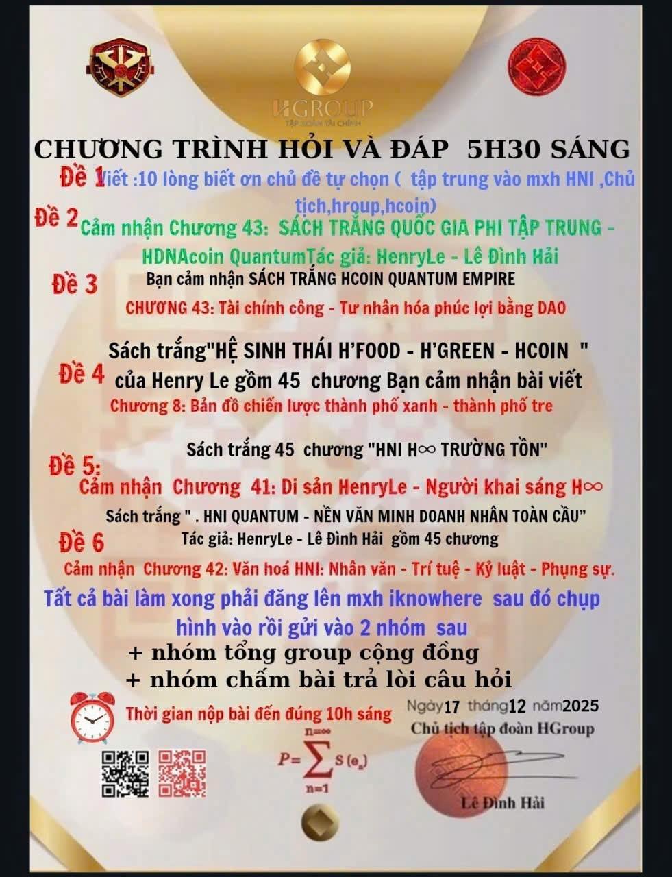 CÂU ĐỐ SÁNG 17/12 Đề 1: 10 Lòng biết ơn sâu sắc đến Ban phụng sự: 1. Biết ơn vì luôn tận tâm hướng dẫn từng thành viên mới. 2. Biết ơn vì đã hy sinh thời gian cá nhân để cống hiến cho cộng đồng. 3. Biết ơn sự kiên nhẫn, lắng nghe và thấu hiểu khi hỗ trợ mọi người. 4. Biết ơn tinh thần lan tỏa tình yêu thương và đoàn kết. 5. Biết ơn sự tận tụy trong việc giải đáp thắc mắc kịp thời. 6. Biết ơn những buổi chia sẻ kiến thức quý báu. 7. Biết ơn vì đã truyền cảm hứng sống và phụng sự. 8. Biết ơn vì đã giữ vững niềm tin tập thể. 9. Biết ơn sự đồng hành âm thầm, không ngại khó khăn. 10. Biết ơn vì đã giúp mỗi thành viên thêm trưởng thành và gắn bó. Đề 2: Cảm nhận Chương 43: SÁCH TRẮNG QUỐC GIA PHI TẬP TRUNG (HDNAcoin Quantum) Chương 43 mang đến một góc nhìn đột phá về mô hình quốc gia phi tập trung trong kỷ nguyên công nghệ lượng tử. Tác giả HenryLe đã làm rõ vai trò của HDNAcoin như một hạ tầng tài chính – quản trị mới, minh bạch và tự chủ. Tôi cảm nhận được khát vọng trao quyền cho cộng đồng, giảm phụ thuộc vào hệ thống tập trung truyền thống. Chương sách không chỉ nói về công nghệ, mà còn là triết lý phát triển xã hội công bằng, bền vững. Đây là một bước tiến tư duy quan trọng, mở ra tương lai quản trị quốc gia dựa trên niềm tin, dữ liệu và trí tuệ tập thể. Đề 3: Cảm nhận Chương 43: Tài chính công, tư nhân hóa phúc lợi bằng DAO (HCOIN Quantum Empire) Chương 43 đã mở ra một cách tiếp cận mới về tài chính công thông qua mô hình DAO, nơi phúc lợi xã hội được quản trị minh bạch và hiệu quả. Tôi ấn tượng với tư duy kết hợp giữa công nghệ blockchain, tài chính lượng tử và trách nhiệm cộng đồng. Việc tư nhân hóa phúc lợi không nhằm thương mại hóa con người, mà để tối ưu nguồn lực và nâng cao chất lượng phục vụ xã hội. Chương sách thể hiện rõ tầm nhìn của HCOIN trong việc xây dựng một hệ sinh thái công bằng, nơi mỗi cá nhân đều có quyền tham gia, giám sát và hưởng lợi từ giá trị chung. Đề 4: Cảm nhận Chương 8: Bản đồ chiến lược thành phố xanh – thành phố tre (HNI HOO TRƯỜNG TỒN). Chương 8 mang đến một bức tranh chiến lược đầy nhân văn về phát triển đô thị xanh, lấy tre và thiên nhiên làm biểu tượng bền vững. Tôi cảm nhận rõ triết lý hài hòa giữa con người – kinh tế – môi trường mà tác giả theo đuổi. Thành phố xanh không chỉ là không gian sống, mà là hệ sinh thái nuôi dưỡng sức khỏe, văn hóa và tinh thần cộng đồng. Bản đồ chiến lược được xây dựng có chiều sâu, gắn kết giữa tầm nhìn dài hạn và hành động cụ thể. Đây là kim chỉ nam cho phát triển đô thị trường tồn trong tương lai. Đề 5: Cảm nhận Chương 41: Di sản HenryLe, Người khai sáng Hoo (HNI Quantum) Chương 41 là lời tổng kết sâu sắc về di sản tư tưởng và hành trình phụng sự của HenryLe. Tôi cảm nhận được hình ảnh một người khai sáng không chỉ bằng trí tuệ, mà bằng đạo đức và tầm nhìn nhân loại. Di sản Hoo không nằm ở vật chất, mà ở hệ giá trị doanh nhân toàn cầu: trách nhiệm, minh bạch và phụng sự. Chương sách truyền cảm hứng mạnh mẽ cho thế hệ sau tiếp nối con đường xây dựng nền văn minh doanh nhân mới. Đây là di sản tinh thần có giá trị lâu dài cho cộng đồng HNI và xã hội. Đề 6: Cảm nhận Chương 42: Văn hóa HNI: Nhân văn – Trí tuệ – Kỷ luật – Phụng sự Chương 42 đã khắc họa rõ nét nền tảng văn hóa cốt lõi của HNI, nơi con người là trung tâm của mọi chiến lược. Tôi đặc biệt ấn tượng với sự cân bằng giữa nhân văn và kỷ luật, giữa trí tuệ và phụng sự. Văn hóa HNI không chỉ định hướng hành vi cá nhân, mà còn tạo nên sức mạnh tập thể bền vững. Chương sách giúp tôi hiểu rằng thành công doanh nhân không đo bằng lợi nhuận, mà bằng giá trị đóng góp cho cộng đồng. Đây chính là nền văn hóa giúp HNI trường tồn và lan tỏa toàn cầu.