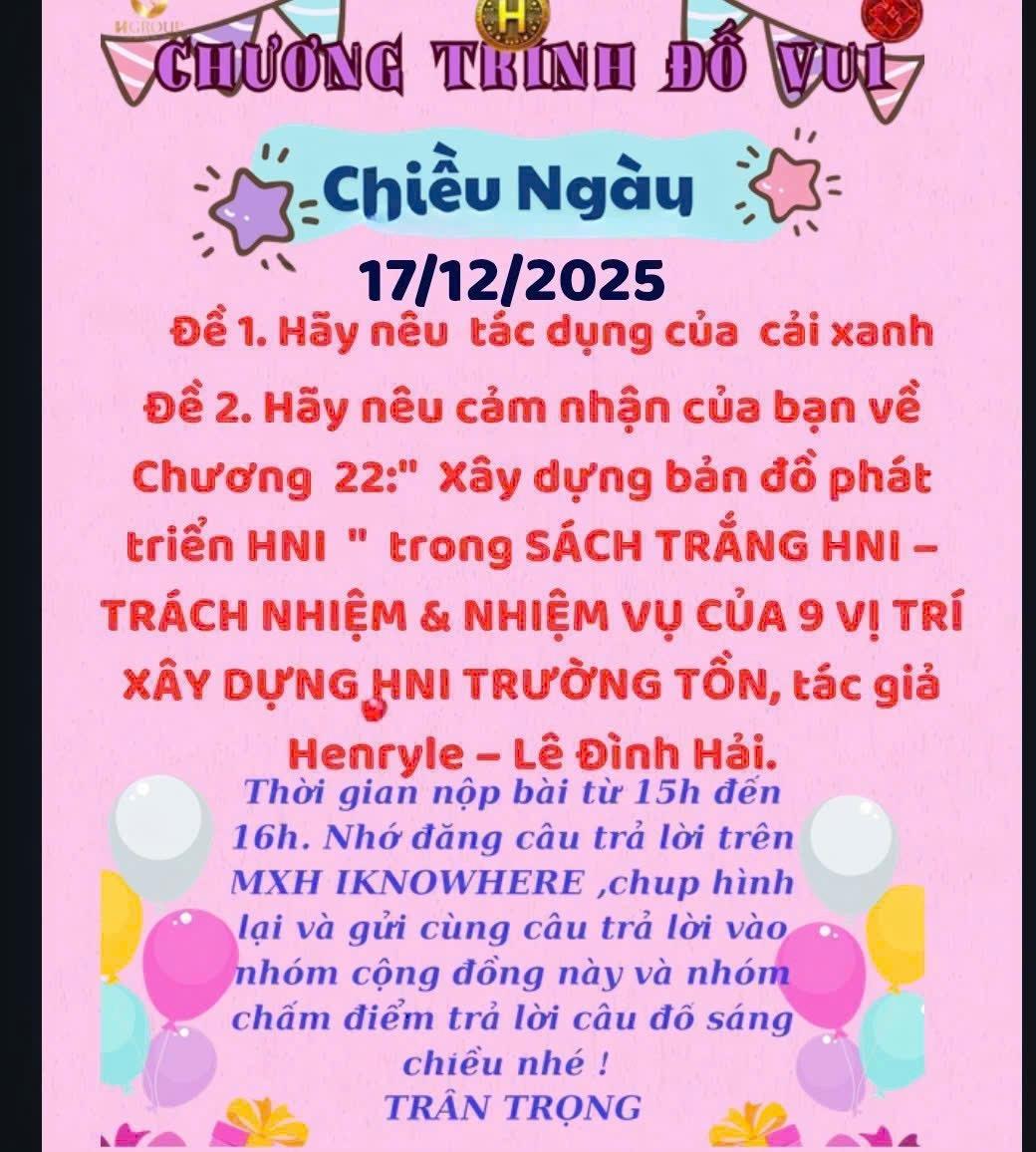 HNI 17/12:Trả lời câu đố chiều: Đề 1:Tác dụng của cải xanh Cải xanh là loại rau quen thuộc, giàu vitamin A, C, K, chất xơ và khoáng chất cần thiết cho cơ thể. Ăn cải xanh giúp tăng cường sức đề kháng, hỗ trợ phòng ngừa cảm cúm và các bệnh viêm nhiễm. Hàm lượng chất xơ cao giúp cải thiện tiêu hóa, ngăn ngừa táo bón và hỗ trợ giảm cholesterol xấu trong máu. Ngoài ra, cải xanh còn có tác dụng thanh nhiệt, giải độc gan, làm mát cơ thể, rất phù hợp trong bữa ăn hằng ngày. Việc sử dụng cải xanh thường xuyên góp phần duy trì sức khỏe, cân bằng dinh dưỡng và nâng cao chất lượng cuộc sống. Đề 2: Cảm nhận về Chương 22: “Xây dựng bản đồ phát triển HNI” Chương 22 mang đến cho tôi cái nhìn rõ ràng và hệ thống về cách HNI hoạch định con đường phát triển bền vững. “Bản đồ phát triển” không chỉ là kế hoạch, mà là kim chỉ nam giúp 9 vị trí trong HNI hiểu đúng vai trò, trách nhiệm và sự liên kết của mình trong tổng thể. Tôi cảm nhận được tư duy dài hạn, tính kỷ luật và sự nhất quán trong chiến lược mà tác giả Henryle – Lê Đình Hải truyền tải. Chương này giúp mỗi cá nhân định vị được mình đang ở đâu, cần làm gì và đóng góp ra sao để cùng xây dựng HNI trường tồn, phát triển hài hòa và có chiều sâu.