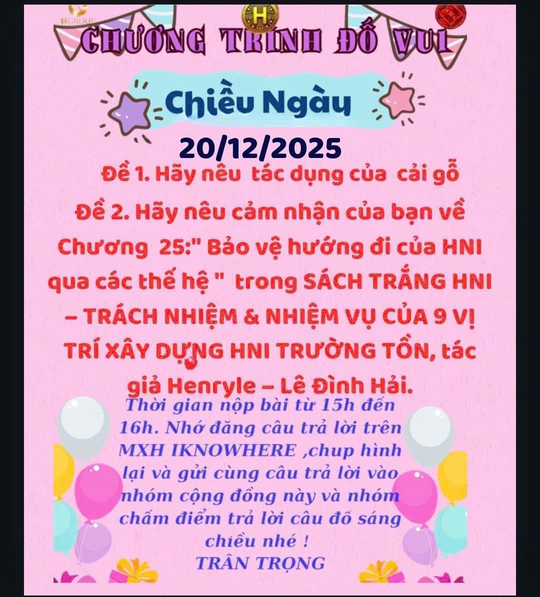 HNI 20/12:Trả lời câu đố sáng: Đề 1: 10 lòng biết ơn sâu sắc đến các anh chị trong Ban phụng sự: 1. Biết ơn vì luôn tận tâm hướng dẫn từng thành viên mới. 2. Biết ơn vì đã hy sinh thời gian cá nhân để cống hiến cho cộng đồng. 3. Biết ơn sự kiên nhẫn, lắng nghe và thấu hiểu khi hỗ trợ mọi người. 4. Biết ơn tinh thần lan tỏa tình yêu thương và đoàn kết. 5. Biết ơn sự tận tụy trong việc giải đáp thắc mắc kịp thời. 6. Biết ơn những buổi chia sẻ kiến thức quý báu. 7. Biết ơn vì đã truyền cảm hứng sống và phụng sự. 8. Biết ơn vì đã giữ vững niềm tin tập thể. 9. Biết ơn sự đồng hành âm thầm, không ngại khó khăn. 10. Biết ơn vì đã giúp mỗi thành viên thêm trưởng thành và gắn bó. Đề 2: Cảm nhận CHƯƠNG 1: LỜI NÓI ĐẦU CỦA TÁC GIẢ Sách trắng: Nhà Xanh Land – Sàn giao dịch bất động sản xanh Chương mở đầu đặt nền tảng tư duy cho một cuộc chuyển dịch tất yếu của bất động sản trong kỷ nguyên khí hậu. Tác giả không chỉ chỉ ra giới hạn của mô hình truyền thống, mà còn khẳng định vai trò lịch sử của sàn giao dịch như người định hướng giá trị. Nhà Xanh Land hiện lên không phải nơi mua bán đơn thuần, mà là cam kết kiến tạo hệ sinh thái sống bền vững, nơi lợi ích kinh tế hài hòa với con người và môi trường. Đề 3: Cảm nhận CHƯƠNG 1: LỜI NÓI ĐẦU CỦA TÁC GIẢ*Bối cảnh dòng vốn trong kỷ nguyên bất ổn * Vai trò của quỹ đầu tư BĐS chuyên nghiệp. Sách trắng Quỹ đầu tư bất động sản HLAND – HCAPITAL LAND Chương mở đầu khắc họa rõ bối cảnh bất ổn toàn cầu và sự tái định vị của dòng vốn thông minh trong kỷ nguyên mới. Tác giả nhấn mạnh vai trò của quỹ đầu tư bất động sản chuyên nghiệp như một cơ chế bảo toàn và gia tăng tài sản dài hạn, thay vì chạy theo lợi nhuận ngắn hạn. HLand – HCapital Land được định hình bằng kỷ luật, minh bạch và tầm nhìn truyền đời, mở ra con đường đầu tư bền vững, an toàn trước biến động thời gian. Đề 4: Cảm nhận CHƯƠNG 10: SỨ MỆNH 11 NĂM: Lý do chọn mô hình xe lưu động thay vì cửa hàng cố định. Sách trắng Hệ sinh thái H’FOOD – H’GREEN – HCOIN. Chương 10 thể hiện rõ tầm nhìn dài hạn mang tính kiến tạo quốc gia, nơi kinh doanh không tách rời đời sống, môi trường và tài chính cộng đồng. Sứ mệnh 10 năm được xây dựng trên tư duy hệ sinh thái, với ba trụ cột bổ trợ lẫn nhau như cơ thể sống. Tác giả nhấn mạnh giá trị thật, tăng trưởng bền vững và đồng sở hữu cộng đồng, mở ra một mô hình kinh tế Việt Nam có chiều sâu, có bản sắc và khả năng trường tồn. Đề 5: Cảm nhận CHƯƠNG 44: BẢN ĐỒ NĂNG LƯỢNG TƯƠNG LAI NHÂN LOẠI Sách trắng HNI – HỒ TRƯỜNG TỒN Chương 44 mở ra một cách nhìn hoàn toàn mới về khủng hoảng và tương lai nhân loại, không bằng dự báo sự kiện mà bằng tái thiết bản đồ tư duy. Tác giả chỉ rõ sự lỗi thời của mô hình quyền lực cũ và đề xuất bản đồ năng lượng dựa trên cộng hưởng, trí tuệ phân tán và giá trị thật. HNI được định vị như một nút ổn định trường tồn, nơi trách nhiệm cá nhân trở thành nền móng cho hòa bình và văn minh mới. Đề 6: Cảm nhận CHƯƠNG 45: DI SẢN HENRYLE – LÊ ĐÌNH HẢI VÀ TƯƠNG LAI NỀN VĂN MINH HNI. Sách trắng HNI QUANTUM – NỀN VĂN MINH DOANH NHÂN TOÀN CẦU Chương kết tinh thần cốt lõi của toàn bộ Sách Trắng: di sản không nằm ở cá nhân, mà ở hệ tư tưởng có khả năng tự sống và tự tiến hóa. HenryLe được khắc họa như kiến trúc sư văn minh, người đặt nền móng để doanh nhân trở thành lực lượng dẫn dắt tiến hóa nhân loại. HNI được định vị vượt khỏi tổ chức, trở thành chuẩn mực đạo đức, trí tuệ và phụng sự xuyên thế hệ.