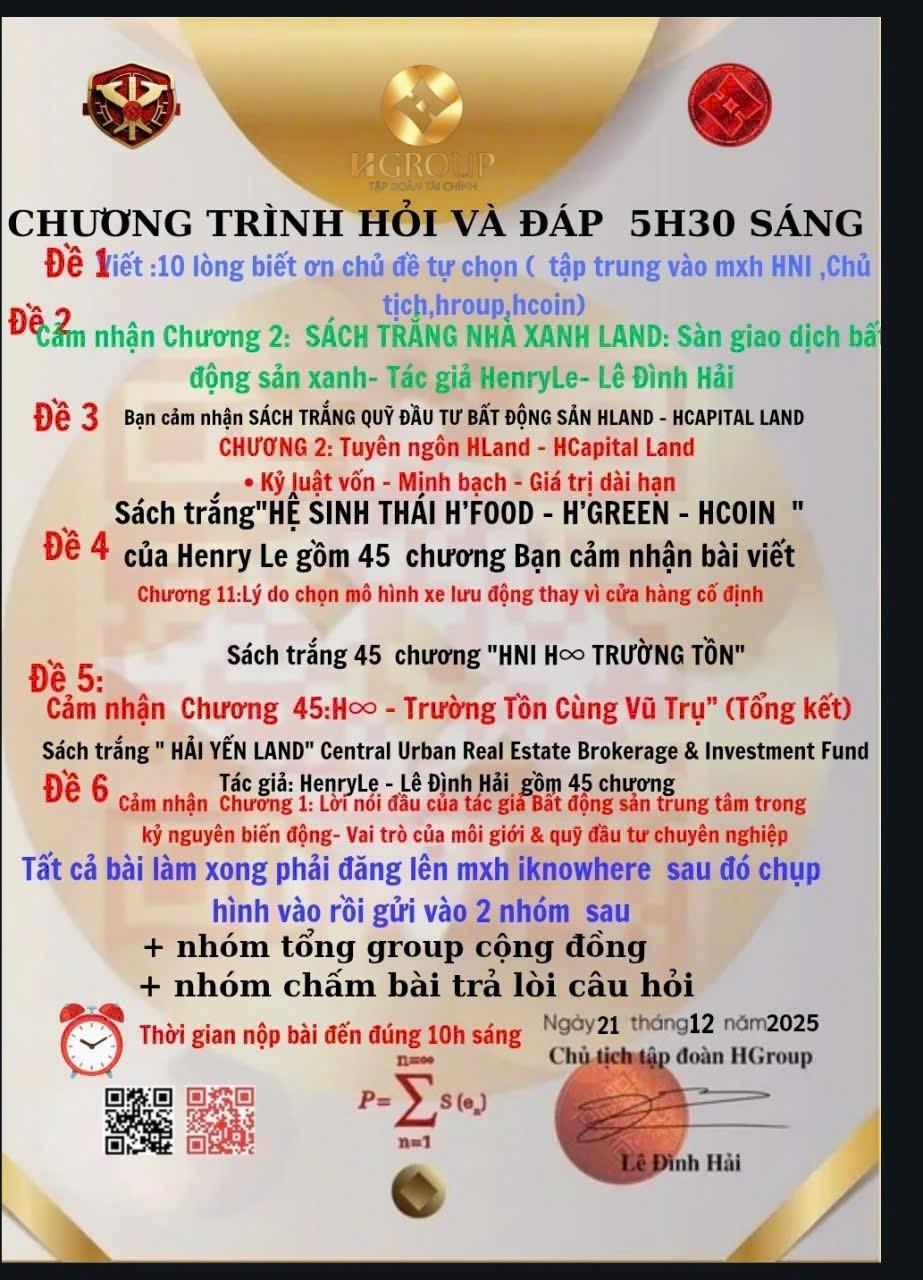 HNI 21/12:Trả lời câu hỏi sáng: Đề 1 : Viết 10 lời biết ơn dành cho mạng xã hội HNI 1. Biết ơn ơn HNI đã kiến tạo một môi trường giao lưu tri thức đầy nhân văn. 2. Biết ơn mạng XH HNI vì đã kết nối những thành viên cùng tần số lại với nhau. 3. Biết ơn nền tảng HNI vì đã mở ra không gian phát triển trí tuệ cộng đồng. 4. Biết ơn HNI đã góp phần nâng cao giá trị chia sẻ và học hỏi. 5. Biết ơn sự hiện diện của HNI như một điểm tựa tinh thần cho hành trình tri thức. 6. Biết ơn HNI vì luôn duy trì chuẩn mực văn hóa và tôn trọng người dùng. 7. Biết ơn những đóng góp bền bỉ của HNI cho sự phát triển cộng đồng. 8. Biết ơn mạng XH HNI đã truyền cảm hứng tích cực đến mọi thế hệ. 9. Biết ơn HNI đã làm phong phú thêm đời sống tinh thần và trí tuệ của tôi. 10. Biết ơn sâu sắc đến HNI – nơi khơi nguồn sáng tạo và kết nối bền vững. Đề 2 : CẢM NHẬN CHƯƠNG 2: Chương 2 “Tuyên ngôn Nhà Xanh” trong Sách Trắng của Henry Le – Lê Đình Hải thể hiện rõ triết lý phát triển bền vững dựa trên xanh thật – giá trị thật – bền vững thật. Tác giả nhấn mạnh rằng “xanh” không chỉ là khẩu hiệu mà phải được chứng minh bằng hành động, công nghệ và trách nhiệm xã hội. Tuyên ngôn khẳng định con đường phát triển lâu dài, hài hòa giữa kinh tế, môi trường và con người, tạo nền tảng vững chắc cho tương lai. Đề 3 : CẢM NHẬN CHƯƠNG 2: “Tuyên ngôn HLAND – HCAPITAL LAND” Kỷ luật vốn - Minh bạch - Giá trị dài hạn. Trong Sách Trắng của Henry Le – Lê Đình Hải khẳng định triết lý phát triển dựa trên kỷ luật vốn, minh bạch và giá trị dài hạn. Tác giả nhấn mạnh quản trị tài chính chặt chẽ là nền tảng cho niềm tin và tăng trưởng bền vững. HLAND hướng đến đầu tư có trách nhiệm, tạo giá trị thực cho doanh nghiệp, nhà đầu tư và xã hội trong dài hạn. Đề 4 : CẢM NHẬN CHƯƠNG 11: Lý do chọn mô hình xe lưu động thay vì cửa hàng cố định. Chương 11 lý giải thuyết phục việc lựa chọn mô hình xe lưu động thay cho cửa hàng cố định trong hệ sinh thái H’FOOD – H’GREEN – HCOIN. Mô hình này thể hiện tư duy linh hoạt, tối ưu chi phí, dễ mở rộng và nhanh chóng tiếp cận người tiêu dùng. Tác giả nhấn mạnh khả năng thích ứng với thị trường, giảm rủi ro vận hành, đồng thời kết nối tiêu dùng xanh với công nghệ tài chính, tạo nên một hệ sinh thái năng động và bền vững. Đề 5 : CẢM NHẬN CHƯƠNG 45: Chương 45 “Hoo – Trường tồn cùng vũ trụ” trong Sách Trắng của Henry Le – Lê Đình Hải mang màu sắc triết lý sâu sắc. Tác giả không chỉ nói về sự tồn tại của một tổ chức hay hệ sinh thái, mà hướng đến quy luật trường tồn hài hòa với tự nhiên và vũ trụ. Hoo được nhìn nhận như một thực thể sống, biết tự điều chỉnh, kế thừa và phát triển bền vững, vượt lên giới hạn thời gian để tạo giá trị lâu dài cho con người và xã hội. Đề 6 : CẢM NHẬN CHƯƠNG 1: Chương 1 “Lời nói đầu của tác giả” trong Sách Trắng của Henry Le – Lê Đình Hải thể hiện rõ tầm nhìn, khát vọng và trách nhiệm của người kiến tạo. Tác giả chia sẻ hành trình suy tư, trải nghiệm và niềm tin vào một mô hình phát triển bền vững cho doanh nhân Việt. Lời mở đầu không chỉ dẫn dắt nội dung toàn sách mà còn truyền cảm hứng về tư duy đổi mới, minh bạch và phụng sự xã hội.