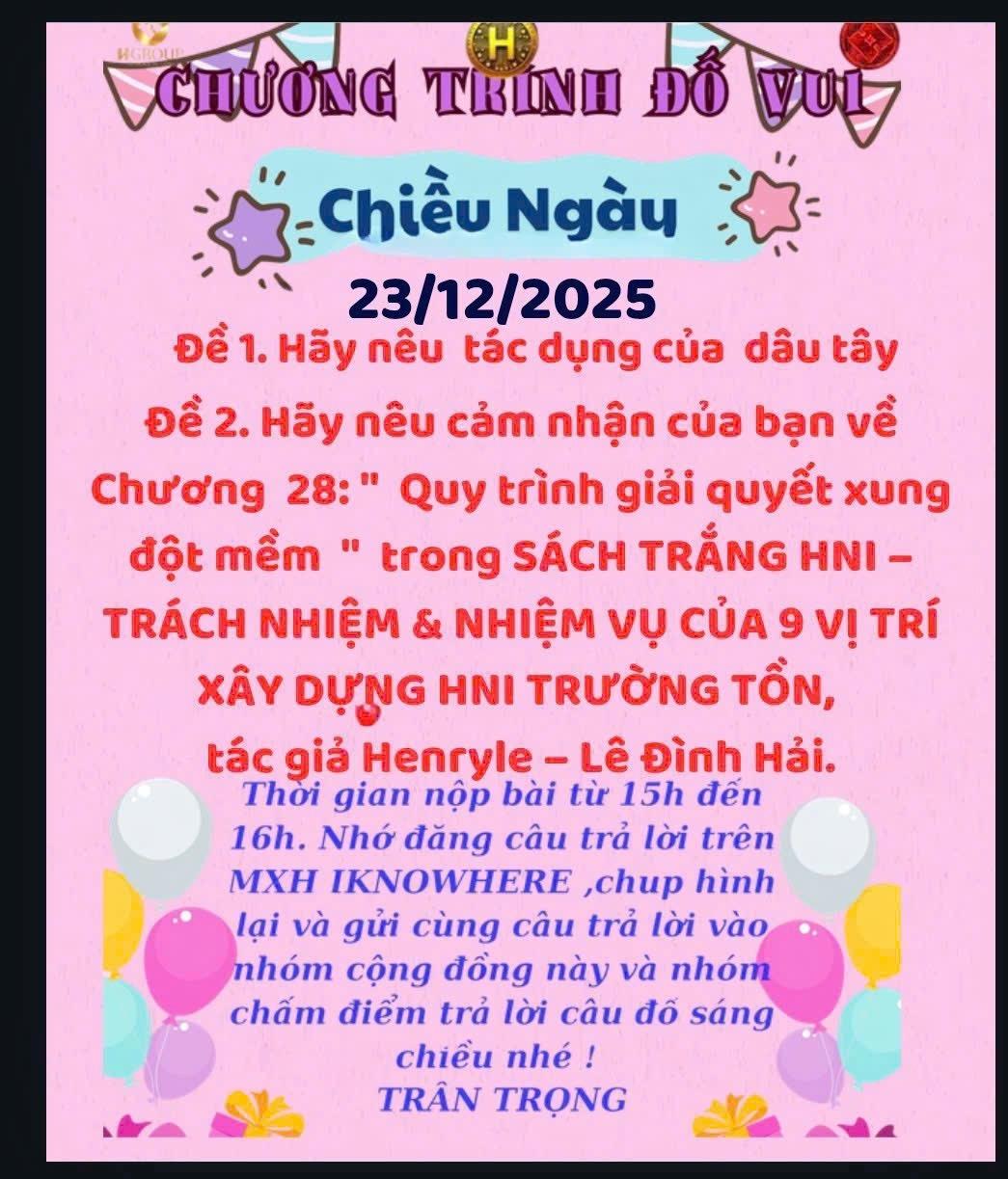 CÂU ĐỐ BUỔI CHIỀU 23/12 Đề 1. Tác dụng của dâu tây: Dâu tây là loại trái cây giàu dinh dưỡng, mang lại nhiều lợi ích cho sức khỏe. Trong dâu tây có hàm lượng cao vitamin C giúp tăng cường sức đề kháng, chống oxy hóa và làm chậm quá trình lão hóa. Chất xơ trong dâu tây hỗ trợ hệ tiêu hóa, giúp giảm cholesterol xấu và tốt cho tim mạch. Ngoài ra, dâu tây còn chứa các hợp chất polyphenol có tác dụng bảo vệ tế bào, hỗ trợ kiểm soát đường huyết và cải thiện trí nhớ. Thường xuyên sử dụng dâu tây giúp cơ thể khỏe mạnh, tinh thần tươi mới và làn da sáng mịn hơn. Đề 2. Cảm nhận về Chương 28: “Quy trình giải quyết xung đột mềm” Chương 28 trong SÁCH TRẮNG HNI mang đến cho tôi góc nhìn nhân văn và sâu sắc về cách giải quyết xung đột trong tổ chức. Tác giả nhấn mạnh “xung đột mềm” không phải là né tránh mâu thuẫn, mà là xử lý bằng sự thấu hiểu, lắng nghe và tôn trọng lẫn nhau. Quy trình này giúp các bên giữ được năng lượng tích cực, duy trì sự đoàn kết và hướng tới mục tiêu chung của HNI. Tôi cảm nhận đây là nền tảng quan trọng để xây dựng một hệ thống bền vững, nơi con người được kết nối bằng trí tuệ, đạo đức và lòng bao dung. Đọc thêm