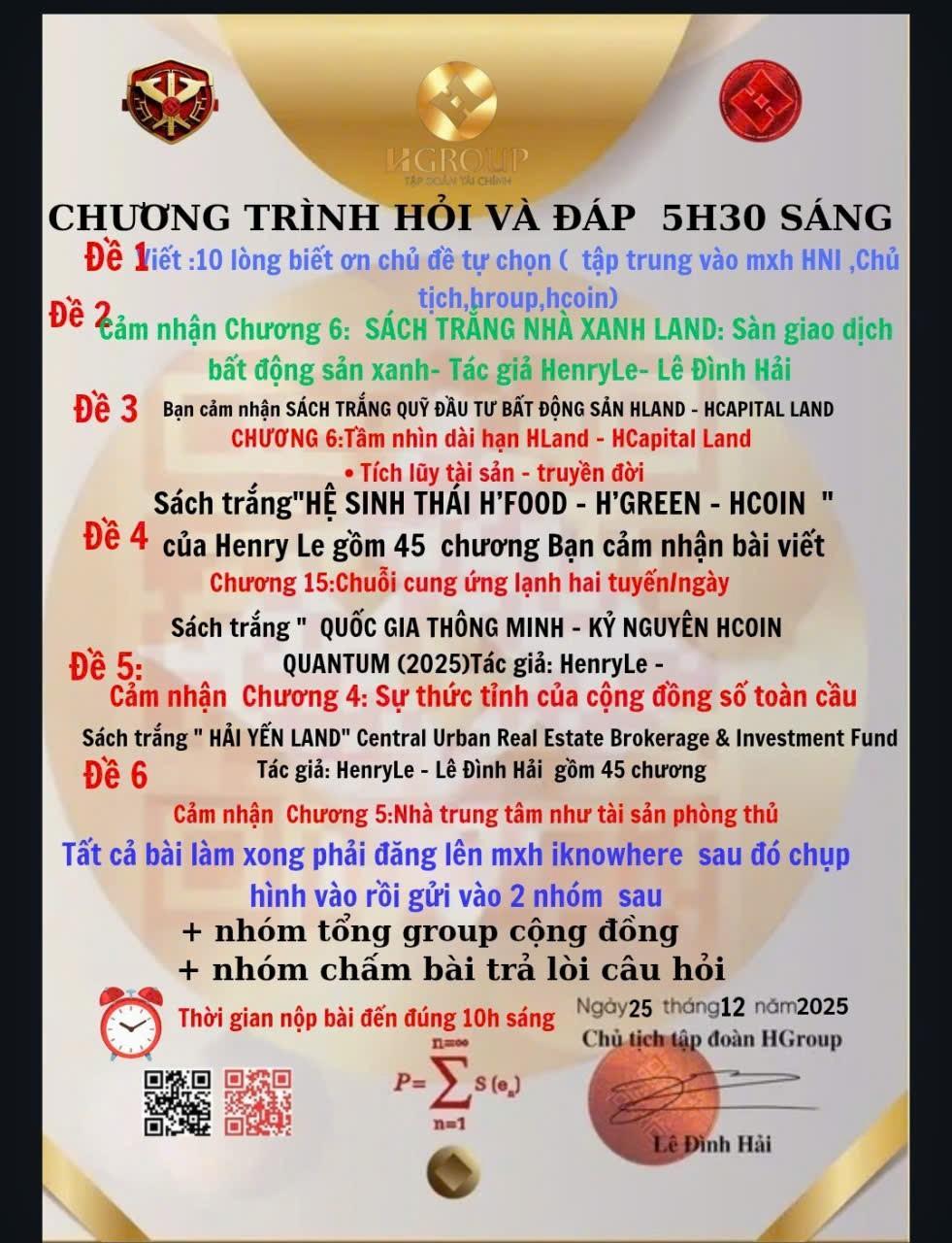 CÂU ĐỐ BUỔI SÁNG NGÀY 25.12 🏻Đề 1: 10 lòng biết ơn Ban Phụng Sự Tập đoàn HGroup Tôi xin bày tỏ 10 lòng biết ơn sâu sắc đến Ban Phụng Sự Tập đoàn HGroup. Biết ơn vì tinh thần phụng sự vô điều kiện, đặt lợi ích cộng đồng lên trên lợi ích cá nhân. Biết ơn sự tận tâm, kỷ luật và nhất quán trong từng hành động. Biết ơn tầm nhìn dài hạn giúp tập đoàn phát triển bền vững. Biết ơn sự dẫn dắt bằng giá trị đạo đức và nhân văn. Biết ơn môi trường học tập tích cực. Biết ơn năng lượng tích cực lan tỏa. Biết ơn sự đoàn kết nội bộ. Biết ơn tinh thần trách nhiệm. Và biết ơn vì đã truyền cảm hứng phụng sự 🏻Đề 2: Cảm nhận Chương 6 – SÁCH TRẮNG NHÀ XANH LAND Chương 6 trong Sách Trắng Nhà Xanh Land thể hiện rõ định hướng phát triển sàn giao dịch bất động sản xanh, lấy giá trị bền vững làm cốt lõi. Tác giả Henry Le – Lê Đình Hải đã làm nổi bật vai trò của bất động sản xanh trong việc cân bằng giữa lợi ích kinh tế và trách nhiệm môi trường. Chương sách mang đến góc nhìn chiến lược, không chạy theo lợi nhuận ngắn hạn mà chú trọng giá trị lâu dài cho xã hội. Đây là kim chỉ nam giúp đội ngũ Nhà Xanh Land xây dựng uy tín, niềm tin và hệ sinh thái phát triển bền vững. 🏻Đề 3: Cảm nhận Chương 6 – SÁCH TRẮNG QUỸ ĐẦU TƯ BĐS HAND – HCAPITAL LAND Chương 6 với chủ đề “Tầm nhìn dài hạn – Tích lũy tài sản truyền đời” cho thấy chiến lược đầu tư sâu sắc của HLand – HCapital Land. Tác giả nhấn mạnh việc đầu tư bất động sản không chỉ để sinh lời mà còn để gìn giữ và truyền giá trị cho các thế hệ tương lai. Tư duy tích lũy bền vững giúp nhà đầu tư tránh rủi ro ngắn hạn, xây dựng nền tảng tài chính ổn định. Chương sách mang tính định hướng cao, phù hợp với những người tìm kiếm sự an toàn, minh bạch và phát triển lâu dài trong hệ sinh thái đầu tư. 🏻Đề 4: Cảm nhận Chương 15 – SÁCH TRẮNG HỆ SINH THÁI H’FOOD – H’GREEN – HCOINChương 15 nói về chuỗi cung ứng lạnh hai tuyến/ngày thể hiện tư duy vận hành hiện đại và khoa học của hệ sinh thái H’FOOD – H’GREEN – HCOIN. Tác giả Henry Le cho thấy tầm quan trọng của logistics lạnh trong việc bảo toàn chất lượng nông sản và thực phẩm xanh. Mô hình này không chỉ nâng cao hiệu quả kinh tế mà còn giảm lãng phí, bảo vệ sức khỏe người tiêu dùng. Chương viết phản ánh rõ định hướng phát triển bền vững, kết nối công nghệ, nông nghiệp xanh và tài chính số trong một hệ sinh thái đồng bộ. 🏻Đề 5: Cảm nhận Chương 4 – QUANTUM (2025): Sự thức tỉnh của cộng đồng số toàn cầu Chương 4 trong sách trắng QUANTUM (2025) mở ra bức tranh về sự thức tỉnh của cộng đồng số toàn cầu trong kỷ nguyên HCOIN. Tác giả Henry Le phân tích rõ vai trò của công nghệ blockchain và tài chính số trong việc trao quyền cho cộng đồng. Sự thức tỉnh không chỉ là thay đổi công cụ, mà là thay đổi nhận thức, tư duy và trách nhiệm xã hội. Chương sách truyền cảm hứng mạnh mẽ về một thế giới số minh bạch, công bằng và kết nối, nơi mỗi cá nhân đều có cơ hội tham gia kiến tạo giá trị chung cho tương lai. 🏻Đề 6 Chương 5. Nhà trung tâm như tài sản phòng thủ 5.1. Khái niệm “tài sản phòng thủ” trong bất động sản Trong đầu tư tài chính, tài sản phòng thủ là những tài sản có khả năng: Giữ giá trị khi thị trường biến động Hạn chế sụt giảm trong khủng hoảng Phục hồi nhanh hơn sau chu kỳ suy thoái Áp dụng vào bất động sản, nhà ở khu vực trung tâm đô thị chính là hình thái tài sản phòng thủ rõ nét nhất. Không phải vì nó tăng giá nhanh, mà vì nó rất khó mất giá. Hải Yến Land lựa chọn bất động sản trung tâm không phải để đầu cơ, mà để bảo toàn vốn và tích lũy giá trị dài hạn cho khách hàng và nhà đầu tư. 5.2. Khan hiếm lõi trung tâm – nền tảng của phòng thủ Khác với các khu vực phát triển mới, lõi trung tâm đô thị có tính hữu hạn tuyệt đối: Quỹ đất không thể mở rộng Hạ tầng đã hoàn chỉnh Mật độ dân cư – kinh tế – dịch vụ cao Khi dân số đô thị tiếp tục tăng, nhu cầu ở – kinh doanh – cho thuê tại trung tâm luôn tồn tại, bất chấp chu kỳ thị trường. Chính sự khan hiếm tự nhiên và không thể nhân bản này tạo nên “lớp giáp phòng thủ” cho bất động sản trung tâm. 5.3. Hành vi thị trường trong khủng hoảng Thực tế qua nhiều chu kỳ cho thấy: Bất động sản vùng xa, pháp lý yếu giảm mạnh và thanh khoản thấp Bất động sản trung tâm giảm ít hơn, giao dịch chậm lại nhưng không mất thị trường Khi thị trường phục hồi, khu trung tâm luôn hồi phục sớm nhất Nhà trung tâm không chạy theo sóng đầu cơ, nhưng được giữ lại khi nhà đầu tư cần trú ẩn. 5.4. Dòng tiền ổn định – trụ cột phòng thủ thứ hai Ngoài giá trị đất, bất động sản trung tâm còn sở hữu dòng tiền khai thác ổn định: Nhu cầu thuê cao Dễ chuyển đổi công năng (ở – văn phòng 