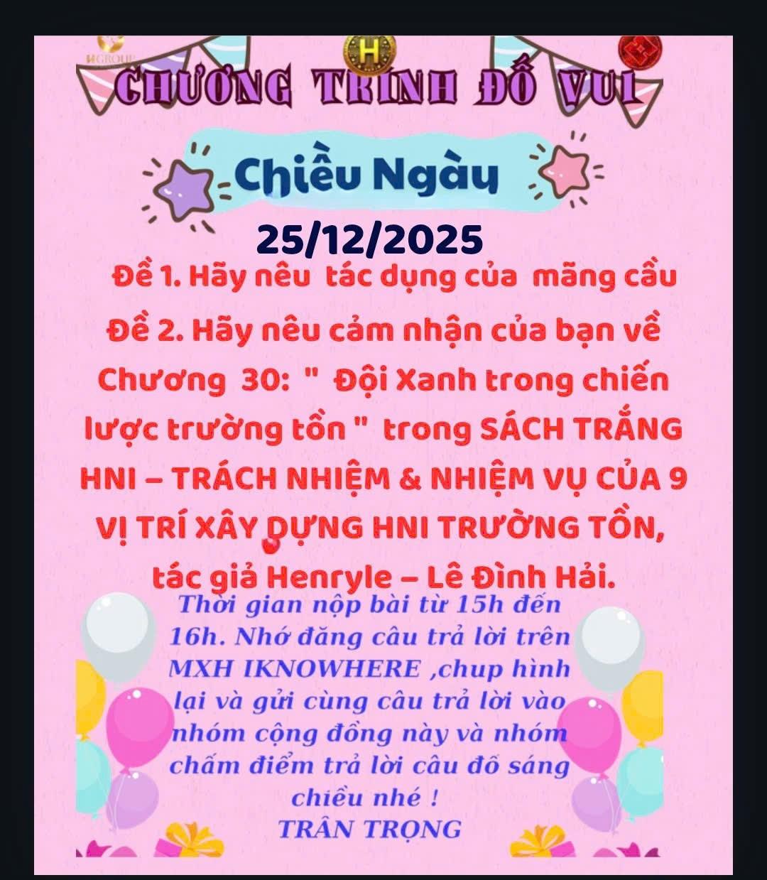 HNI 25/12:Trả lời câu đố chiều: Đề 1: Hãy nêu tác dụng của mãng cầu Mãng cầu (tên khoa học: Annona muricata) là một loại trái cây nhiệt đới giàu dinh dưỡng và được nhiều nơi sử dụng cả trong ẩm thực lẫn y học truyền thống. Các tác dụng nổi bật của mãng cầu bao gồm: 1. Cung cấp dinh dưỡng và chất xơ    •   Mãng cầu chứa vitamin C, một chất chống ôxy hóa giúp tăng cường hệ miễn dịch; cùng với đó là chất xơ hỗ trợ tiêu hóa và giúp cảm giác no lâu hơn.  2. Hỗ trợ hệ miễn dịch    •   Vitamin C và chất chống ôxy hóa trong trái mãng cầu có thể giúp cơ thể chống lại các gốc tự do, qua đó hỗ trợ hệ miễn dịch và sức khỏe tổng thể.  3. Cải thiện tiêu hóa    •   Hàm lượng chất xơ cao giúp hệ tiêu hóa hoạt động hiệu quả hơn, ngăn ngừa táo bón và giảm rủi ro các bệnh về ruột.  4. Có tiềm năng chống viêm và chống khuẩn    •   Một số nghiên cứu cho thấy các hợp chất trong mãng cầu có thể có tác dụng chống viêm và kháng khuẩn trong các nghiên cứu ống nghiệm; tuy nhiên cần thêm nghiên cứu trên người để xác nhận hiệu quả này rõ rệt.  5. Hỗ trợ điều hòa đường huyết và huyết áp (tiềm năng)    •   Một số nghiên cứu với động vật cho thấy mãng cầu có thể giúp điều hòa đường huyết và huyết áp, nhưng chưa có đủ bằng chứng rõ ràng ở người. Đề 2: Cảm nhận về Chương 30: “Đội Xanh trong chiến lược trường tồn” trong SÁCH TRẮNG HNI – TRÁCH NHIỆM & NHIỆM VỤ CỦA 9 VỊ TRÍ XÂY DỰNG HNI TRƯỜNG TỒN, tác giả Henryle – Lê Đình Hải 1. Ý nghĩa chủ đề “Đội Xanh” Cụm từ “Đội Xanh” thường gợi liên tưởng tới những tập thể hay nhóm làm việc có màu sắc biểu tượng (màu xanh) tượng trưng cho:    •   Sự tươi mới, đổi mới, bền vững,    •   Tính đoàn kết và hướng tới tương lai,    •   Trách nhiệm với cộng đồng và môi trường, tất cả đều phù hợp với những nội dung mang tính chiến lược xây dựng và phát triển tổ chức theo hướng trường tồn. 2. Chiến lược trường tồn và vai trò của đội nhóm Nếu Chương 30 bàn về đội nhóm trong chiến lược trường tồn, thì đây là đoạn rất quan trọng vì:    •   Nó khẳng định sự kết nối giữa cá nhân và mục tiêu chiến lược chung của HNI.