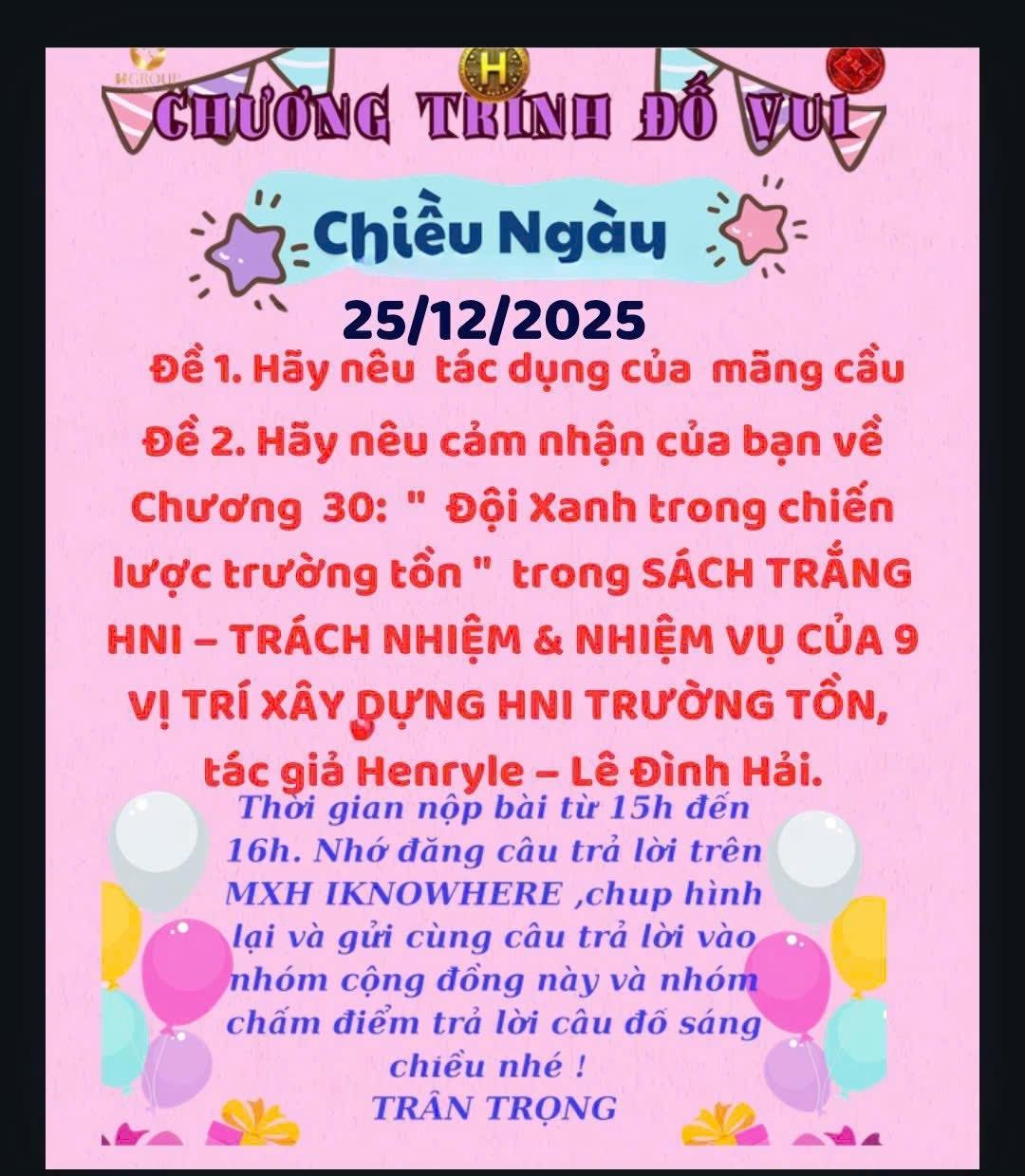 CÂU ĐỐ CHIỀU 25/12 Câu 1: Tác dụng của mãng cầu : Mãng cầu (tên khoa học: Annona muricata) là một loại trái cây nhiệt đới giàu dinh dưỡng và được nhiều nơi sử dụng cả trong ẩm thực lẫn y học truyền thống. Các tác dụng nổi bật của mãng cầu bao gồm: 1. Cung cấp dinh dưỡng và chất xơ    •   Mãng cầu chứa vitamin C, một chất chống ôxy hóa giúp tăng cường hệ miễn dịch; cùng với đó là chất xơ hỗ trợ tiêu hóa và giúp cảm giác no lâu hơn.  2. Hỗ trợ hệ miễn dịch    •   Vitamin C và chất chống ôxy hóa trong trái mãng cầu có thể giúp cơ thể chống lại các gốc tự do, qua đó hỗ trợ hệ miễn dịch và sức khỏe tổng thể.  3. Cải thiện tiêu hóa    •   Hàm lượng chất xơ cao giúp hệ tiêu hóa hoạt động hiệu quả hơn, ngăn ngừa táo bón và giảm rủi ro các bệnh về ruột.  4. Có tiềm năng chống viêm và chống khuẩn    •   Một số nghiên cứu cho thấy các hợp chất trong mãng cầu có thể có tác dụng chống viêm và kháng khuẩn trong các nghiên cứu ống nghiệm; tuy nhiên cần thêm nghiên cứu trên người để xác nhận hiệu quả này rõ rệt.  5. Hỗ trợ điều hòa đường huyết và huyết áp (tiềm năng)    •   Một số nghiên cứu với động vật cho thấy mãng cầu có thể giúp điều hòa đường huyết và huyết áp, nhưng chưa có đủ bằng chứng rõ ràng ở người. Đề 2: Cảm nhận về Chương 30: “Đội Xanh trong chiến lược trường tồn” trong SÁCH TRẮNG HNI – TRÁCH NHIỆM & NHIỆM VỤ CỦA 9 VỊ TRÍ XÂY DỰNG HNI TRƯỜNG TỒN, tác giả Henryle – Lê Đình Hải 1. Ý nghĩa chủ đề “Đội Xanh” Cụm từ “Đội Xanh” thường gợi liên tưởng tới những tập thể hay nhóm làm việc có màu sắc biểu tượng (màu xanh) tượng trưng cho:    •   Sự tươi mới, đổi mới, bền vững,    •   Tính đoàn kết và hướng tới tương lai,    •   Trách nhiệm với cộng đồng và môi trường, tất cả đều phù hợp với những nội dung mang tính chiến lược xây dựng và phát triển tổ chức theo hướng trường tồn. 2. Chiến lược trường tồn và vai trò của đội nhóm Nếu Chương 30 bàn về đội nhóm trong chiến lược trường tồn, thì đây là đoạn rất quan trọng vì:    •   Nó khẳng định sự kết nối giữa cá nhân và mục tiêu chiến lược chung của HNI.