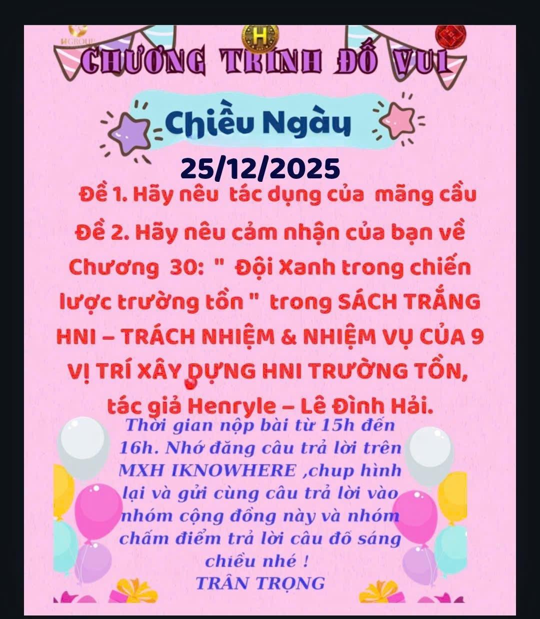 CÂU ĐỐ CHIỀU 25/12 Câu 1: Tác dụng của mãng cầu : Mãng cầu (tên khoa học: Annona muricata) là một loại trái cây nhiệt đới giàu dinh dưỡng và được nhiều nơi sử dụng cả trong ẩm thực lẫn y học truyền thống. Các tác dụng nổi bật của mãng cầu bao gồm: 1. Cung cấp dinh dưỡng và chất xơ    •   Mãng cầu chứa vitamin C, một chất chống ôxy hóa giúp tăng cường hệ miễn dịch; cùng với đó là chất xơ hỗ trợ tiêu hóa và giúp cảm giác no lâu hơn.  2. Hỗ trợ hệ miễn dịch    •   Vitamin C và chất chống ôxy hóa trong trái mãng cầu có thể giúp cơ thể chống lại các gốc tự do, qua đó hỗ trợ hệ miễn dịch và sức khỏe tổng thể.  3. Cải thiện tiêu hóa    •   Hàm lượng chất xơ cao giúp hệ tiêu hóa hoạt động hiệu quả hơn, ngăn ngừa táo bón và giảm rủi ro các bệnh về ruột.  4. Có tiềm năng chống viêm và chống khuẩn    •   Một số nghiên cứu cho thấy các hợp chất trong mãng cầu có thể có tác dụng chống viêm và kháng khuẩn trong các nghiên cứu ống nghiệm; tuy nhiên cần thêm nghiên cứu trên người để xác nhận hiệu quả này rõ rệt.  5. Hỗ trợ điều hòa đường huyết và huyết áp (tiềm năng)    •   Một số nghiên cứu với động vật cho thấy mãng cầu có thể giúp điều hòa đường huyết và huyết áp, nhưng chưa có đủ bằng chứng rõ ràng ở người. Đề 2: Cảm nhận về Chương 30: “Đội Xanh trong chiến lược trường tồn” trong SÁCH TRẮNG HNI – TRÁCH NHIỆM & NHIỆM VỤ CỦA 9 VỊ TRÍ XÂY DỰNG HNI TRƯỜNG TỒN, tác giả Henryle – Lê Đình Hải 1. Ý nghĩa chủ đề “Đội Xanh” Cụm từ “Đội Xanh” thường gợi liên tưởng tới những tập thể hay nhóm làm việc có màu sắc biểu tượng (màu xanh) tượng trưng cho:    •   Sự tươi mới, đổi mới, bền vững,    •   Tính đoàn kết và hướng tới tương lai,    •   Trách nhiệm với cộng đồng và môi trường, tất cả đều phù hợp với những nội dung mang tính chiến lược xây dựng và phát triển tổ chức theo hướng trường tồn. 2. Chiến lược trường tồn và vai trò của đội nhóm Nếu Chương 30 bàn về đội nhóm trong chiến lược trường tồn, thì đây là đoạn rất quan trọng vì:    •   Nó khẳng định sự kết nối giữa cá nhân và mục tiêu chiến lược chung của HNI. Đọc thêm