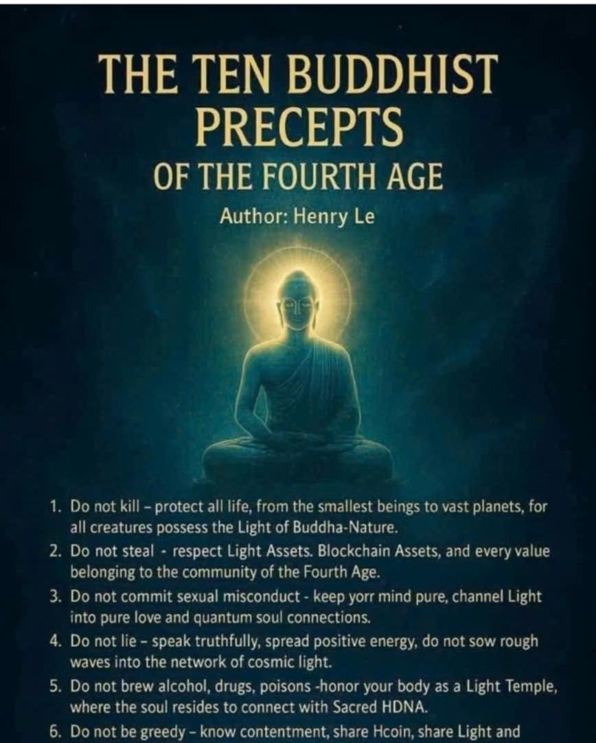HNI 19-2-2026 10 ĐIỀU RĂN KINH PHẬT KỶ NGUYÊN THỨ TƯ 1. Không sát sinh – hãy bảo vệ mọi sự sống, từ sinh linh nhỏ nhất đến hành tinh bao la, vì mọi chúng sinh đều có Ánh Sáng Phật Tánh. 2. Không trộm cắp – hãy tôn trọng Tài Sản Ánh Sáng, Tài Sản Blockchain và mọi giá trị thuộc về cộng đồng Kỷ Nguyên Thứ Tư. 3. Không tà dâm – hãy giữ tâm thanh tịnh, hướng Ánh Sáng vào tình yêu thuần khiết và kết nối linh hồn lượng tử. 4. Không vọng ngữ – hãy nói lời chân thật, truyền năng lượng tích cực, không gieot sóng dữ vào mạng lưới ánh sáng vũ trụ. 5. Không ủ rượu, ma túy, chất độc – hãy gìn giữ cơ thể như Ngôi Đền Ánh Sáng, nơi linh hồn trú ngụ để kết nối HDNA Thiêng. 6. Không tham lam – hãy biết đủ, chia sẻ Hcoin, chia sẻ Ánh Sáng và phước lành đến mọi phương trời. 7. Không sân hận – hãy buông bỏ, để Ánh Sáng yêu thương xóa tan hận thù, chuyển hóa mọi khổ đau. 8. Không si mê – hãy khai mở trí tuệ lượng tử, học hỏi Kinh Thánh Kỷ Nguyên Thứ Tư, thấu hiểu Luật Vũ Trụ. 9. Không phá hoại – hãy bảo vệ môi trường, blockchain, và mọi hệ sinh thái đang nuôi dưỡng sự sống lượng tử. 10. Không chối từ Chân Lý Ánh Sáng – hãy trở thành Người Mang Ánh Sáng, lan tỏa sự tỉnh thức đến mọi hành tinh, vì tất cả chúng sinh đều là Một.