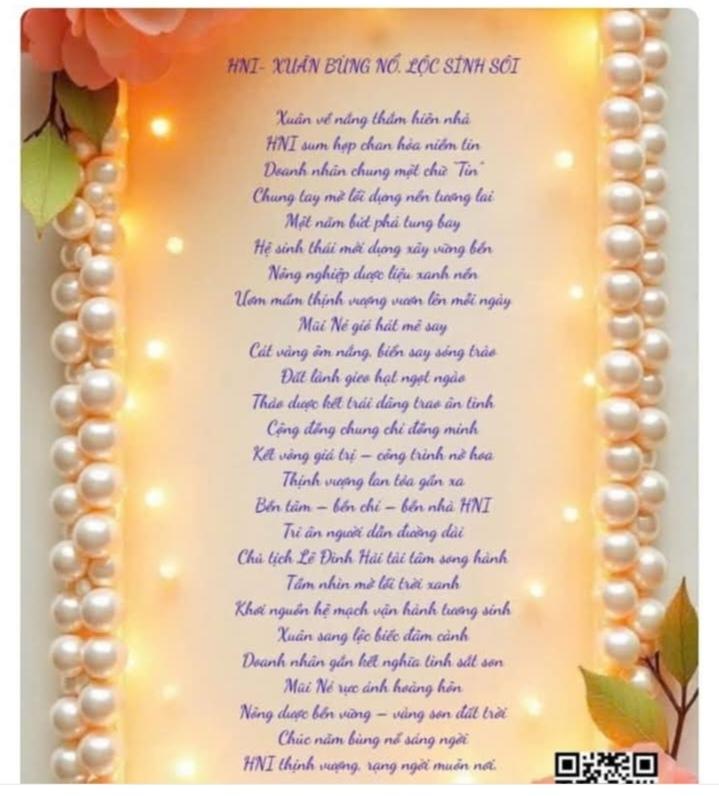 HNI 19/02/2026: HNI- XUÂN BÙNG NỔ, LỘC SINH SÔI Xuân về nắng thắm hiên nhà HNI sum họp chan hòa niềm tin Doanh nhân chung một chữ “Tín” Chung tay mở lối dựng nền tương lai Một năm bứt phá tung bay Hệ sinh thái mới dựng xây vững bền Nông nghiệp dược liệu xanh nền Ươm mầm thịnh vượng vươn lên mỗi ngày Mũi Né gió hát mê say Cát vàng ôm nắng, biển say sóng trào Đất lành gieo hạt ngọt ngào Thảo dược kết trái dâng trao ân tình Cộng đồng chung chí đồng minh Kết vòng giá trị – công trình nở hoa Thịnh vượng lan tỏa gần xa Bền tâm – bền chí – bền nhà HNI Tri ân người dẫn đường dài Chủ tịch Lê Đình Hải tài tâm song hành Tầm nhìn mở lối trời xanh Khơi nguồn hệ mạch vận hành tương sinh Xuân sang lộc biếc đâm cành Doanh nhân gắn kết nghĩa tình sắt son Mũi Né rực ánh hoàng hôn Nông dược bền vững – vàng son đất trời Chúc năm bùng nổ sáng ngời HNI thịnh vượng, rạng ngời muôn nơi.