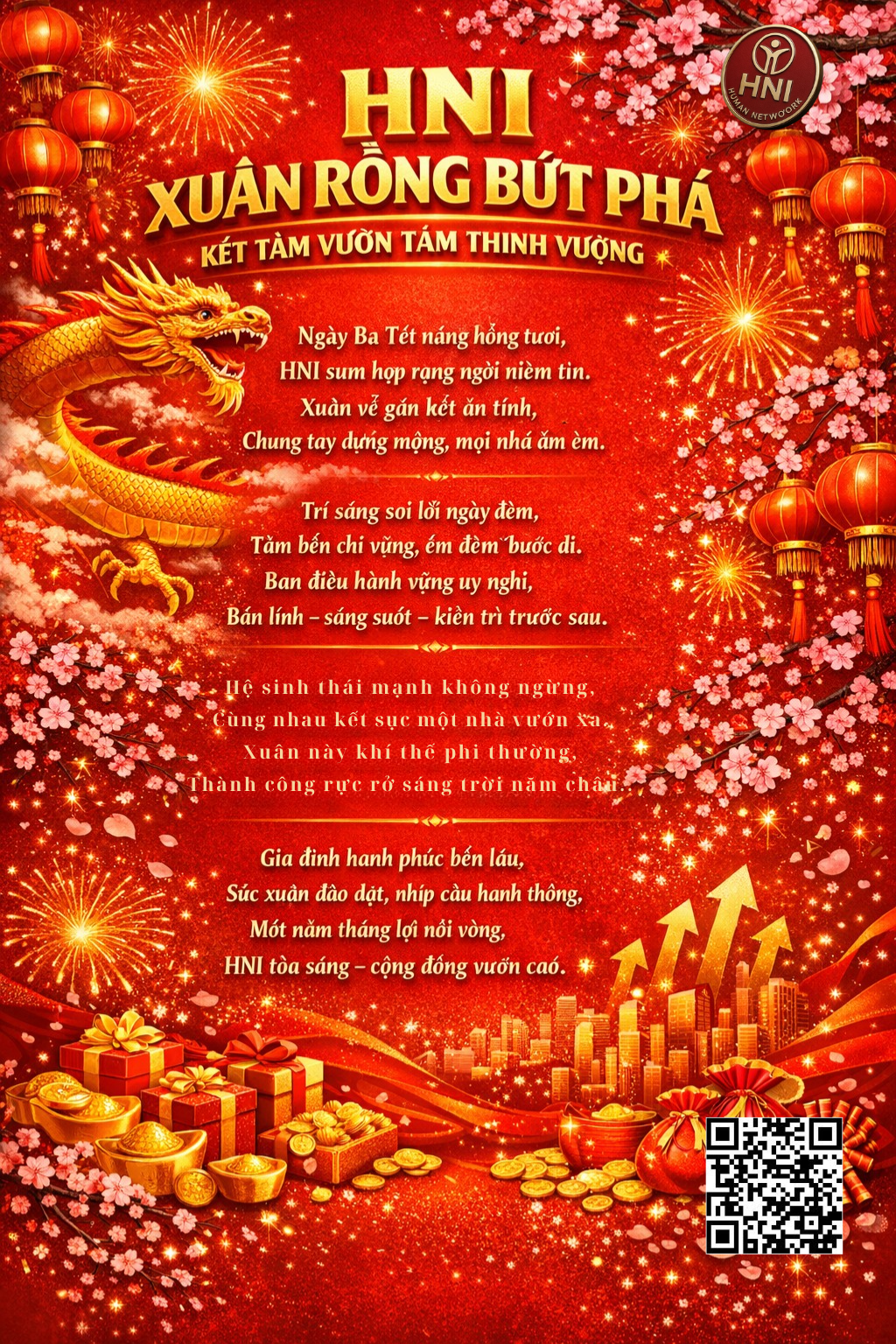 🔥 HNI XUÂN RỒNG BỨT PHÁ – KẾT TÂM VƯƠN TẦM THỊNH VƯỢNG 🔥 Ngày Ba Tết nắng hồng tươi, HNI sum họp rạng ngời niềm tin. Xuân về kết chặt ân tình, Chung tay dựng mộng, hành trình mở ra. Chúc nhau phúc lộc chan hòa, An khang thịnh vượng, mọi nhà ấm êm. Trí sáng soi lối ngày đêm, Tâm bền chí vững, êm đềm bước đi. Ban điều hành vững uy nghi, Bản lĩnh – sáng suốt – kiên trì trước sau. Dẫn đường chiến lược bắc cầu, Mở trang phát triển dài lâu bền vững. Hệ sinh thái mạnh không ngừng, Kết nguồn giá trị, tưng bừng nở hoa. Cùng nhau kết sức một nhà, Vượt bao thử thách, vươn xa thị trường. Xuân này khí thế phi thường, Đơn hàng bứt phá, muôn phương gọi mời. Thành công rực rỡ sáng ngời, Danh thương HNI sáng trời năm châu. Gia đình hạnh phúc bền lâu, Sức xuân dào dạt, nhịp cầu hanh thông. Một năm thắng lợi nối vòng, HNI tỏa sáng – cộng đồng vươn cao. 🌸✨