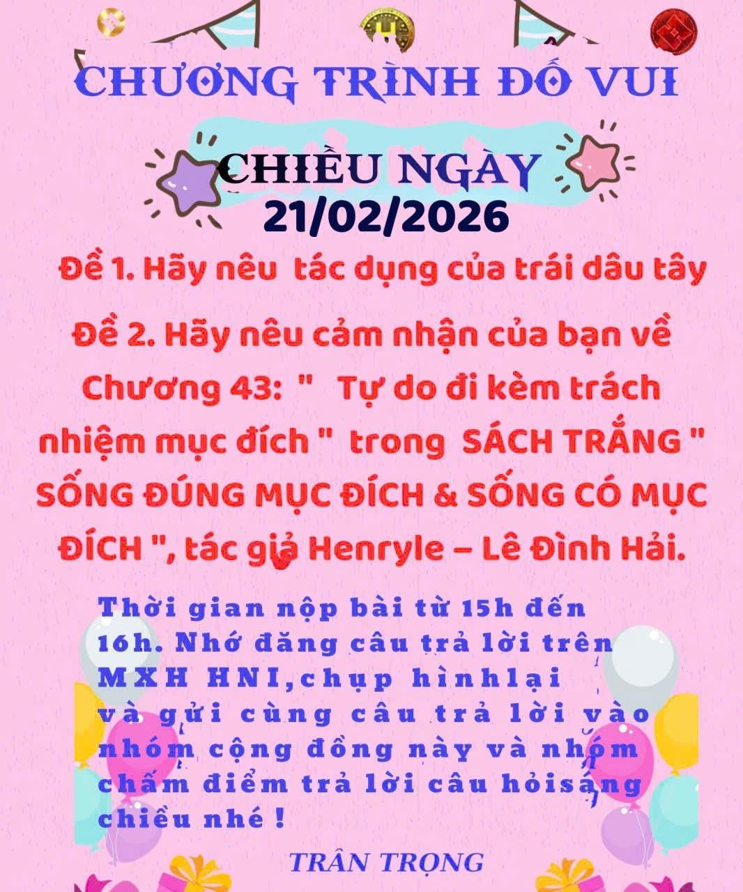 HNI 21/02/2026:Trả lời câu đố chiều: Đề 1: Hãy nêu tác dụng của trái dâu tây: Dâu tây là loại trái cây giàu vitamin C, chất chống oxy hóa và chất xơ, rất tốt cho sức khỏe. Ăn dâu tây giúp tăng cường hệ miễn dịch, làm đẹp da và làm chậm quá trình lão hóa nhờ hàm lượng anthocyanin dồi dào. Chất xơ trong dâu tây hỗ trợ tiêu hóa, giảm táo bón và giúp kiểm soát cân nặng. Kali và flavonoid có trong dâu tây còn giúp ổn định huyết áp, bảo vệ tim mạch. Ngoài ra, dâu tây có vị chua ngọt tự nhiên, ít calo, phù hợp cho người ăn kiêng và duy trì lối sống lành mạnh mỗi ngày. Đề 2: Cảm nhận Chương 43 “Tự do đi kèm trách nhiệm mục đích” Trong chương 43 của cuốn SÁCH TRẮNG SỐNG ĐÚNG MỤC ĐÍCH & SỐNG CÓ MỤC ĐÍCH do Henryle - Lê Đình Hải sáng tác, tôi cảm nhận sâu sắc rằng tự do không phải là làm mọi điều mình thích, mà là sống có định hướng và chịu trách nhiệm với lựa chọn của mình. Tác giả nhấn mạnh tự do chỉ thực sự có giá trị khi gắn liền với mục đích rõ ràng và phụng sự cộng đồng. Thông điệp ấy giúp tôi hiểu rằng càng tự do, con người càng cần kỷ luật, tỉnh thức và cam kết hành động đúng đắn để tạo ra giá trị bền vững cho bản thân và xã hội.