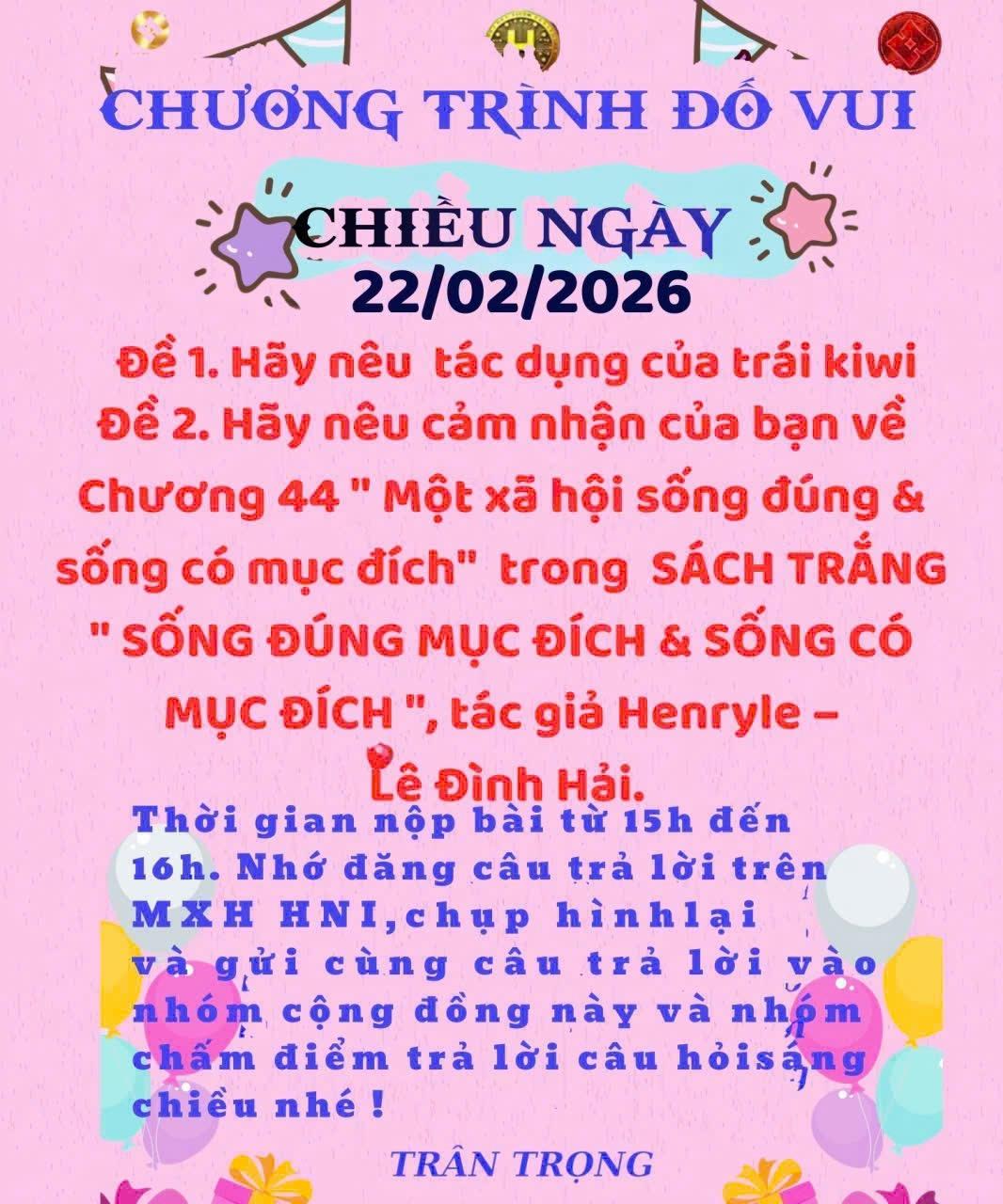 CÂU ĐỐ CHIỀU 22/2 Đề 1: Tác dụng của trái kiwi: Nạp năng lượng, kích hoạt sức mạnh bên trong! Kiwi không chỉ là trái cây. Kiwi là nguồn năng lượng xanh cho cơ thể và tinh thần!  Vitamin C dồi dào – kích hoạt hệ miễn dịch, giúp bạn mạnh mẽ hơn mỗi ngày.  Chất xơ tự nhiên – làm sạch cơ thể, giải phóng sự nặng nề, để bạn nhẹ nhàng bứt phá.  Chống oxy hóa mạnh mẽ – giữ cho làn da rạng rỡ, thần thái tự tin.  Tốt cho tim mạch – mỗi nhịp tim là một nhịp sống tràn đầy yêu thương.  Hỗ trợ giấc ngủ sâu – ngủ đủ để mai thức dậy với phiên bản xuất sắc hơn!  Một trái kiwi nhỏ bé, nhưng mang thông điệp lớn: Hãy chăm sóc bản thân để có đủ năng lượng chinh phục ước mơ!  Đề 2: Cảm nhận về Chương 44 trong sách trắng “Một xã hội sống đúng & sống có mục đích” Chương 44 giống như một cú chạm đánh thức tâm thức. Nó nhắc tôi rằng:  Khi một người sống đúng – họ sống với sự chính trực.  Khi một người sống có mục đích – họ sống để tạo giá trị. Và khi hàng triệu người cùng làm điều đó? Xã hội sẽ chuyển mình. Tôi cảm nhận được nguồn năng lượng mạnh mẽ từ chương sách này: Không chờ đợi ai thay đổi thế giới. Chính mình thay đổi trước. Sống đúng là nền tảng. Sống có mục đích là động lực. Kết hợp lại – đó là sức mạnh kiến tạo tương lai. Chương 44 truyền cho tôi niềm tin rằng mỗi người đều là một “hạt nhân ánh sáng”. Khi từng cá nhân tỏa sáng bằng giá trị thật của mình, cả cộng đồng sẽ bừng sáng.  Xã hội tốt đẹp không phải là điều viển vông. Nó bắt đầu từ lựa chọn của tôi và bạn – ngay hôm nay. Đọc thêm