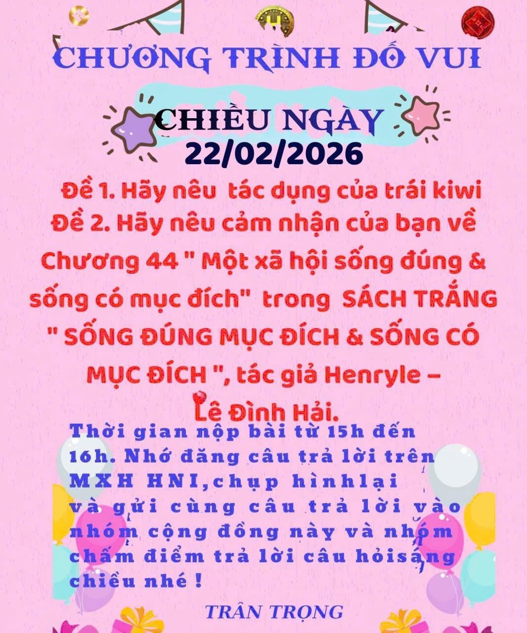HNI 22/02 - CÂU ĐỐ CHIỀU Đề 1: Tác dụng của trái kiwi: Nạp năng lượng, kích hoạt sức mạnh bên trong! Kiwi không chỉ là trái cây. Kiwi là nguồn năng lượng xanh cho cơ thể và tinh thần!  Vitamin C dồi dào – kích hoạt hệ miễn dịch, giúp bạn mạnh mẽ hơn mỗi ngày.  Chất xơ tự nhiên – làm sạch cơ thể, giải phóng sự nặng nề, để bạn nhẹ nhàng bứt phá.  Chống oxy hóa mạnh mẽ – giữ cho làn da rạng rỡ, thần thái tự tin.  Tốt cho tim mạch – mỗi nhịp tim là một nhịp sống tràn đầy yêu thương.  Hỗ trợ giấc ngủ sâu – ngủ đủ để mai thức dậy với phiên bản xuất sắc hơn!  Một trái kiwi nhỏ bé, nhưng mang thông điệp lớn: Hãy chăm sóc bản thân để có đủ năng lượng chinh phục ước mơ!  Đề 2: Cảm nhận về Chương 44 trong sách trắng “Một xã hội sống đúng & sống có mục đích” Chương 44 giống như một cú chạm đánh thức tâm thức. Nó nhắc tôi rằng:  Khi một người sống đúng – họ sống với sự chính trực.  Khi một người sống có mục đích – họ sống để tạo giá trị. Và khi hàng triệu người cùng làm điều đó? Xã hội sẽ chuyển mình. Tôi cảm nhận được nguồn năng lượng mạnh mẽ từ chương sách này: Không chờ đợi ai thay đổi thế giới. Chính mình thay đổi trước. Sống đúng là nền tảng. Sống có mục đích là động lực. Kết hợp lại – đó là sức mạnh kiến tạo tương lai. Chương 44 truyền cho tôi niềm tin rằng mỗi người đều là một “hạt nhân ánh sáng”. Khi từng cá nhân tỏa sáng bằng giá trị thật của mình, cả cộng đồng sẽ bừng sáng.  Xã hội tốt đẹp không phải là điều viển vông. Nó bắt đầu từ lựa chọn của tôi và bạn – ngay hôm nay