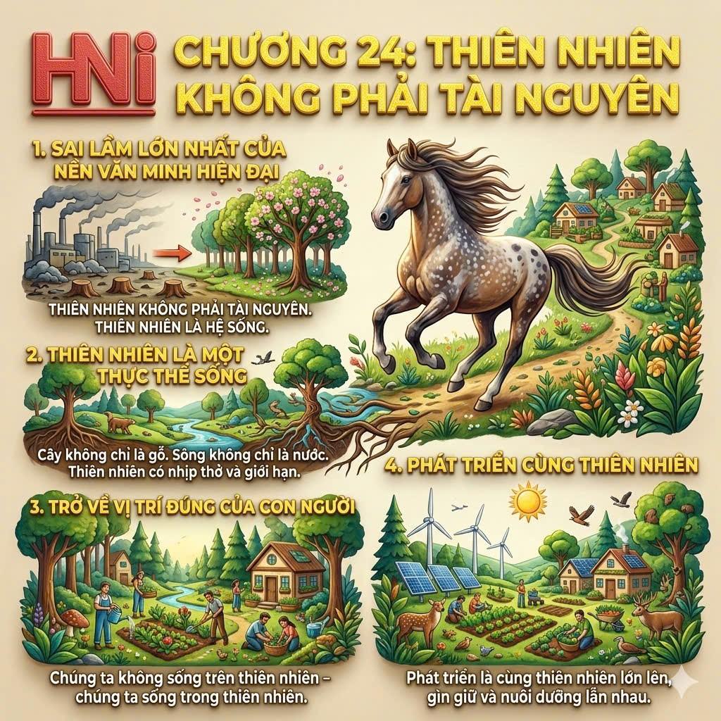 HNI 01/03/2026 - B10 🌺 CHƯƠNG 24: THIÊN NHIÊN KHÔNG PHẢI TÀI NGUYÊN 1. Sai lầm lớn nhất của nền văn minh hiện đại Trong nhiều thế kỷ, con người quen gọi thiên nhiên là “tài nguyên”. Rừng là tài nguyên gỗ, sông là tài nguyên nước, đất là tài nguyên canh tác, biển là tài nguyên khai thác. Khi bị gắn nhãn “tài nguyên”, thiên nhiên lập tức trở thành đối tượng để sử dụng và tối ưu hóa lợi ích kinh tế. Từ đó, con người tự cho mình quyền lấy nhiều hơn trả, khai thác nhanh hơn khả năng phục hồi. Ngôi Làng Trong Mơ bắt đầu bằng một nhận thức khác: 👉 Thiên nhiên không phải tài nguyên. Thiên nhiên là hệ sống. 2. Thiên nhiên là một thực thể sống Một cái cây không chỉ là khối gỗ. Một con sông không chỉ là dòng nước. Một ngọn núi không chỉ là khoáng sản. Thiên nhiên có nhịp thở, có chu kỳ tái sinh, có khả năng tự chữa lành – nhưng cũng có giới hạn chịu đựng. Khai thác mà không hiểu nhịp sống ấy không còn là phát triển, mà là xâm phạm. Giống như rút máu một cơ thể mà không quan tâm nó còn đủ sức sống hay không. 3. Trở về vị trí đúng của con người Bi kịch của thời hiện đại là con người tưởng mình đứng ngoài tự nhiên. Nhưng chúng ta không sống trên thiên nhiên – chúng ta sống trong thiên nhiên. Rừng suy yếu thì không khí suy yếu. Đất chết thì thực phẩm mất sinh lực. Ngôi Làng Trong Mơ không tách con người khỏi tự nhiên, mà đặt con người trở lại vị trí đúng trong hệ sinh thái. 4. Phát triển cùng thiên nhiên Phát triển không đồng nghĩa với tàn phá. Phát triển thật sự là cùng thiên nhiên lớn lên, gìn giữ và nuôi dưỡng lẫn nhau – để sự thịnh vượng không phải là cái giá của sự hủy diệt.