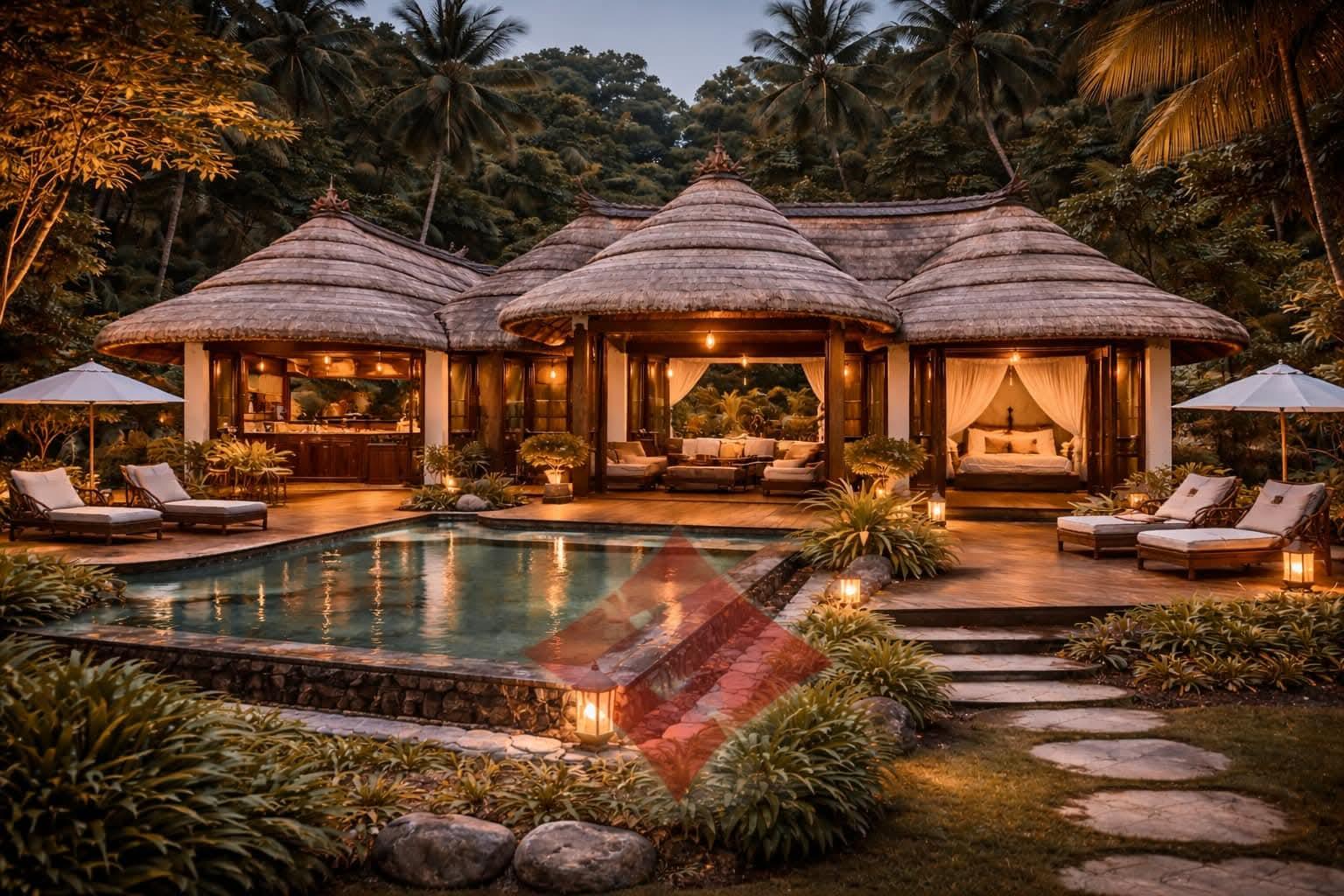 • Thiết kế: Nhà 4 cột – 4 mái lợp rơm nhân tạo – nhà sàn sinh thái
