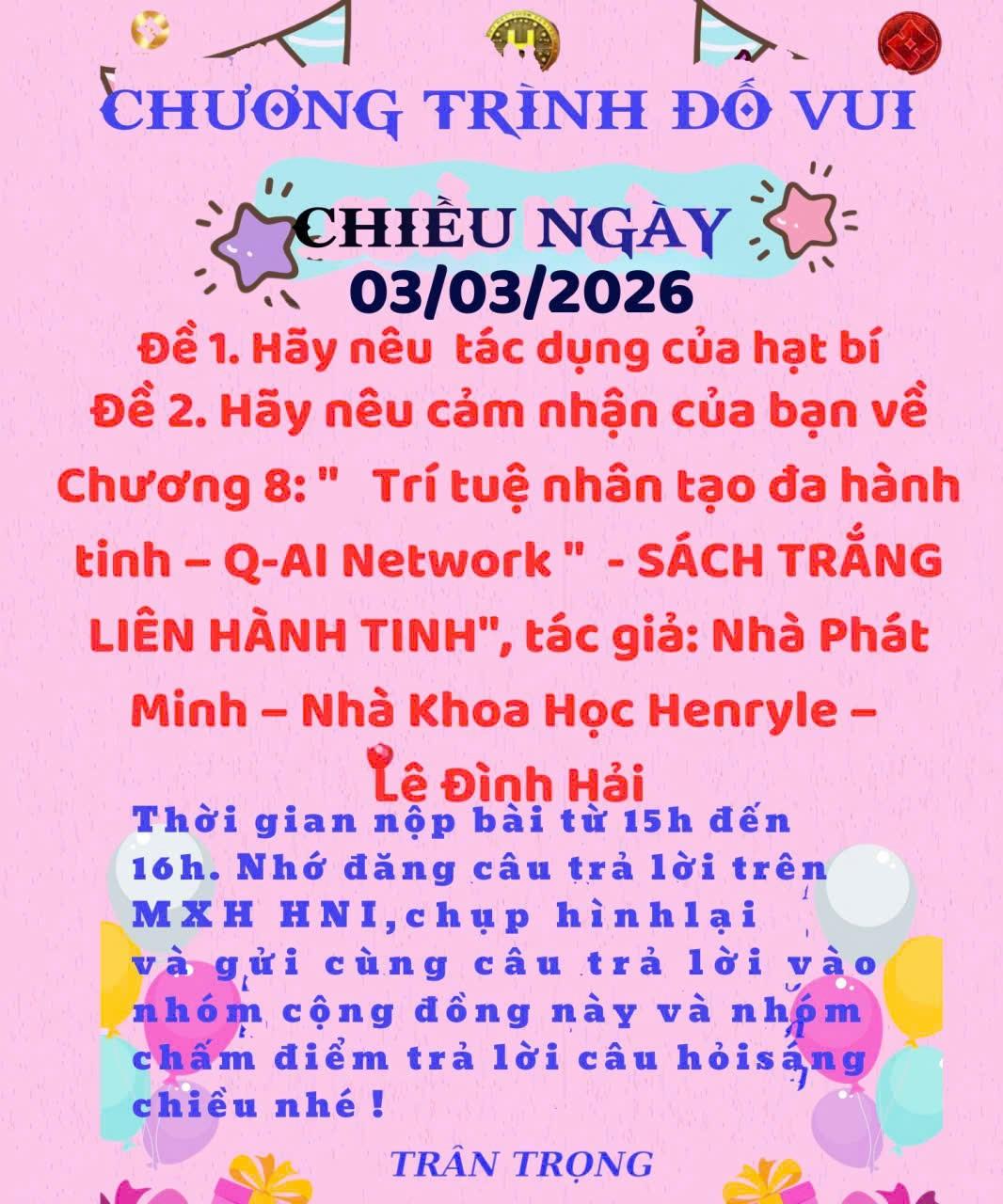 HNI 3/3/2026: Trả lời câu đố chiều: Đề 1: Tác dung của hạt bí: Hạt bí là nguồn dinh dưỡng giàu protein, chất béo lành mạnh và chất xơ. Trong hạt bí có nhiều kẽm giúp tăng cường miễn dịch, hỗ trợ sức khỏe sinh lý và làm đẹp da. Magie trong hạt bí giúp ổn định huyết áp, tốt cho tim mạch và cải thiện giấc ngủ. Ngoài ra, hạt bí chứa chất chống oxy hóa giúp giảm viêm, làm chậm quá trình lão hóa. Ăn hạt bí thường xuyên còn hỗ trợ tiêu hóa và tốt cho tuyến tiền liệt ở nam giới. Đây là món ăn vặt bổ dưỡng, tiện lợi và an toàn. Đề 2: Cảm nhận Chương 8: “Trí tuệ nhân tạo đa hành tinh - Q-AI Network” Chương 8 trong SÁCH TRẮNG LIÊN HÀNH TINH của tác giả Henryle – Lê Đình Hải mở ra tầm nhìn mới về mạng lưới trí tuệ nhân tạo kết nối đa hành tinh. Tôi cảm nhận đây là tư duy đột phá, đặt nền tảng cho sự giao thoa giữa công nghệ, con người và vũ trụ. Q-AI Network không chỉ là hệ thống công nghệ mà còn là biểu tượng của khát vọng phát triển bền vững và hợp tác toàn cầu. Chương sách truyền cảm hứng mạnh mẽ về tương lai nhân loại trong kỷ nguyên số hóa.