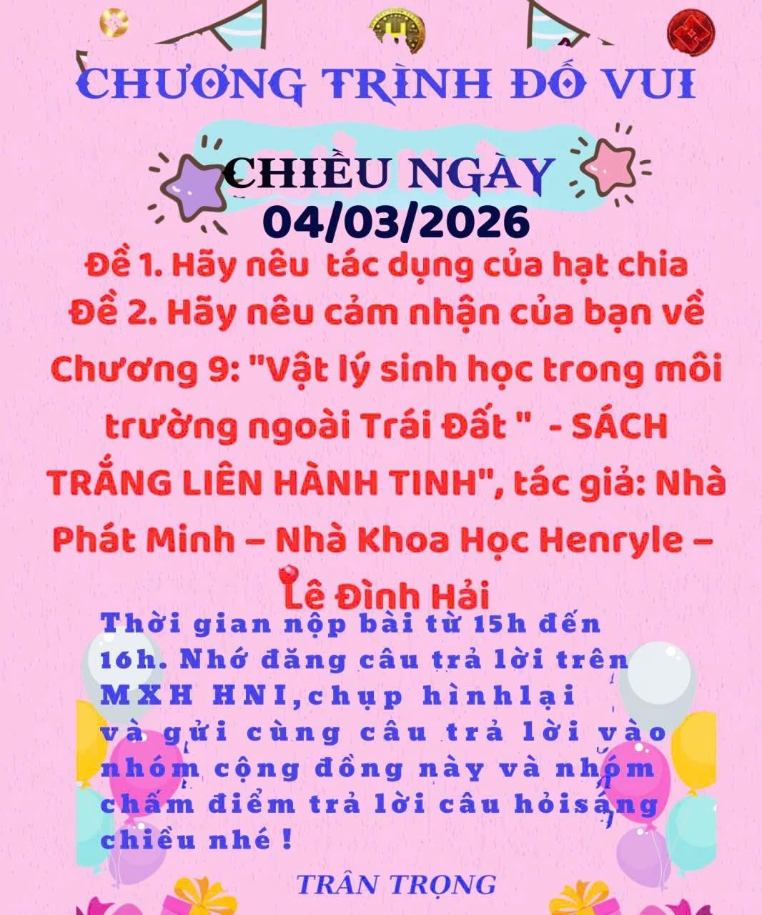 HNI 4/3/2026:Trả lời câu đố chiều: Đề 1: Tác dụng của hạt chia: Hạt chia là một loại hạt nhỏ nhưng chứa hàm lượng dinh dưỡng rất cao, được nhiều người ưa chuộng trong chế độ ăn uống lành mạnh.  Tốt cho tim mạch  Giàu Omega-3 giúp giảm cholesterol xấu (LDL). Hỗ trợ ổn định huyết áp. Giảm nguy cơ mắc bệnh tim mạch.  Hỗ trợ tiêu hóa  Chứa nhiều chất xơ hòa tan. Khi ngâm nước, hạt chia tạo lớp gel giúp: Nhuận tràng tự nhiên Cải thiện táo bón Nuôi lợi khuẩn đường ruột  Giúp kiểm soát cân nặng  Tạo cảm giác no lâu. Hạn chế thèm ăn. Phù hợp cho người ăn kiêng hoặc muốn giảm cân lành mạnh.  Ổn định đường huyết  Làm chậm quá trình hấp thu đường. Phù hợp cho người cần kiểm soát đường huyết.  Tốt cho xương  Giàu canxi, magie, photpho. Hỗ trợ chắc khỏe xương và răng.  Làm đẹp da & tóc  Chất chống oxy hóa giúp: Làm chậm lão hóa Bảo vệ da khỏi tác hại môi trường Hỗ trợ tóc chắc khỏe.  Cách sử dụng hạt chia Ngâm 1–2 muỗng cà phê với 250ml nước trong 10–15 phút. Trộn vào sữa chua, sinh tố, nước ép. Làm pudding hạt chia với trái cây. Uống đủ nước khi dùng Đề 2: Cảm Nhận Chương 9: Vật Lý Sinh Học Trong Môi Trường Ngoài Trái Đất trong sách trắng Liên hành tinh. Chương 9 của Sách trắng liên hành tinh mở ra một góc nhìn mới mẻ và đầy thách thức về cách mà sự sống có thể tồn tại, thích nghi và phát triển trong những môi trường xa lạ ngoài hành tinh. Tác giả không chỉ trình bày các lý thuyết vật lý và sinh học một cách hệ thống mà còn dẫn dắt người đọc vào những suy ngẫm sâu sắc về giới hạn của sinh thể và tư duy khoa học của con người.  Tác phẩm kết nối hai lĩnh vực tưởng như khác biệt Điểm làm tôi ấn tượng nhất là cách Henry Lê liên kết vật lý và sinh học — hai ngành khoa học thường được xem là riêng rẽ — thành một thể liền mạch khi xét về điều kiện sống ngoài Trái Đất. Vật lý giúp ta hiểu những quy luật môi trường như trọng lực, bức xạ, nhiệt độ cực đoan, áp suất khác biệt. Sinh học trả lời câu hỏi: sống là gì, và sống cần gì?Chương này giải thích rằng mọi biểu hiện sống đều có “điểm neo” trong các quy luật vật lý nền tảng chạy xuyên suốt vũ trụ. Mỗi thay đổi dù nhỏ trong các điều kiện vật lý đều có thể tạo ra khác biệt to lớn trong cấu trúc và phản ứng của các hệ sinh học.