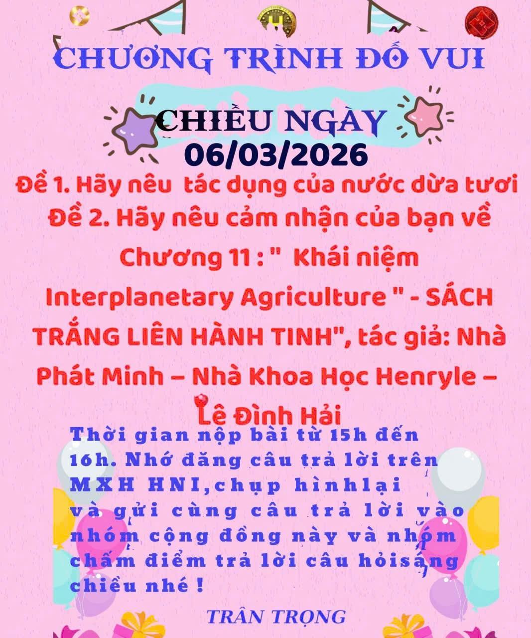 HNI 6/3/2026:Trả lời câu đố chiều: Đề1:Tác dụng của nước dừa tươi: Nước dừa tươi là một loại thức uống tự nhiên rất tốt cho sức khỏe, đặc biệt phổ biến ở các vùng nhiệt đới như Việt Nam. Trong nước dừa chứa nhiều khoáng chất, vitamin và chất điện giải giúp cơ thể hoạt động tốt hơn. Dưới đây là những tác dụng nổi bật của nước dừa tươi: 1. Bù nước và điện giải cho cơ thể Nước dừa chứa các chất điện giải như: Kali, Natri,Magi,Canxi Nhờ vậy, nước dừa giúp bù nước nhanh, rất tốt khi: Trời nóng Sau khi vận động Cơ thể mệt mỏi hoặc mất nước. 2. Tốt cho tim mạch Nước dừa có hàm lượng kali cao, giúp: Điều hòa huyết áp Giảm nguy cơ cao huyết áp Hỗ trợ sức khỏe tim mạch. 3. Hỗ trợ tiêu hóa Uống nước dừa giúp: Làm dịu dạ dày Giảm đầy bụng, khó tiêu Hỗ trợ đường ruột hoạt động tốt hơn. 4. Làm đẹp da Trong nước dừa có các chất chống oxy hóa giúp: Giữ da ẩm và mịn hơn Giảm khô da Hỗ trợ làm chậm quá trình lão hóa. 5. Tăng năng lượng tự nhiên Nước dừa cung cấp: Đường tự nhiên Vitamin nhóm B Giúp cơ thể tỉnh táo và có năng lượng mà không cần dùng đồ uống có ga hay nước tăng lực. 6. Tốt cho hệ thần kinh và cơ bắp Nhờ chứa kali và magie, nước dừa giúp: Giảm chuột rút Hỗ trợ hoạt động của cơ và thần kinh. 7. Hỗ trợ thải độc cơ thể Nước dừa có tính mát, giúp: Thanh lọc cơ thể Hỗ trợ hoạt động của thận Giúp tiểu tiện dễ hơn. Lưu ý khi uống nước dừa: Không nên uống quá nhiều (1–2 trái/ngày là hợp lý). Người huyết áp thấp nên uống vừa phải. Không nên uống vào buổi tối quá muộn. Đề 2: Cảm nhận Chương 11: Khái niệm Interplanetary Agriculture (Nông nghiệp liên hành tinh) Trong Sách trắng Liên Hành Tinh – Tác giả Henry Lê Chương 11 mở ra một tầm nhìn rất lớn: nông nghiệp không còn bị giới hạn trên Trái Đất, mà trở thành hệ thống sản xuất sự sống cho nhiều hành tinh. Nếu nông nghiệp truyền thống là nghệ thuật trồng cây trên đất, thì interplanetary agriculture là khoa học nuôi dưỡng sự sống trong toàn bộ không gian vũ trụ nơi con người sinh sống. 1. Từ nông nghiệp Trái Đất đến nông nghiệp vũ trụ Trong lịch sử nhân loại, nông nghiệp luôn gắn liền với đất, nước, khí hậu và mùa vụ. Nhưng khi con người bước vào kỷ nguyên khám phá không gian, các thuộc địa trên Mặt Trăng, Sao Hỏa hay các trạm vũ trụ sẽ cần nguồn thực phẩm tự chủ.