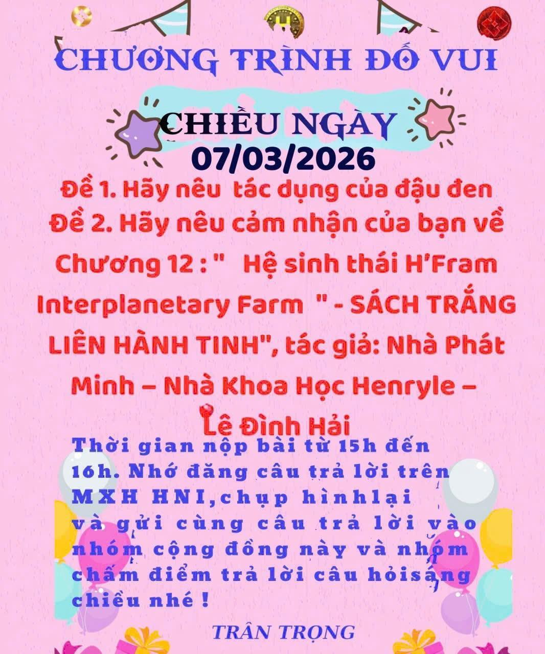 CÂU ĐỐ BUỔI CHIỀU NGÀY 07-3 Đề 1: Tác dụng của đậu đen: Đậu đen là một loại thực phẩm giàu dinh dưỡng và mang lại nhiều lợi ích cho sức khỏe. Trong đậu đen có nhiều chất đạm, chất xơ, vitamin nhóm B, sắt, magie và chất chống oxy hóa. Ăn đậu đen giúp thanh nhiệt, giải độc cơ thể và hỗ trợ tốt cho gan, thận. Nước đậu đen rang còn giúp giảm nóng trong, làm đẹp da và hỗ trợ giảm cân nhờ tạo cảm giác no lâu. Ngoài ra, đậu đen còn giúp ổn định đường huyết, tốt cho tim mạch và hệ tiêu hóa. Vì vậy, đậu đen là thực phẩm đơn giản nhưng rất tốt cho sức khỏe con người. Đề 2: Cảm nhận về Chương 12 “Hệ sinh thái H’Fram Interplanetary Farm” Chương 12 trong Sách Trắng Liên Hành Tinh của tác giả Henryle – Lê Đình Hải mang đến một góc nhìn rất mới về mô hình nông nghiệp trong tương lai. Khái niệm H’Fram Interplanetary Farm thể hiện tầm nhìn xây dựng hệ sinh thái nông nghiệp có thể thích nghi ở nhiều môi trường, kể cả ngoài Trái Đất. Điều này cho thấy sự kết hợp giữa khoa học, công nghệ và tư duy sinh thái bền vững. Tôi cảm nhận rằng chương này khơi gợi trí tưởng tượng và niềm tin vào tương lai nông nghiệp thông minh, nơi con người có thể chủ động tạo ra nguồn sống trong mọi điều kiện môi trường. Đây là một ý tưởng rất tiên phong và đầy cảm hứng. Đọc thêm