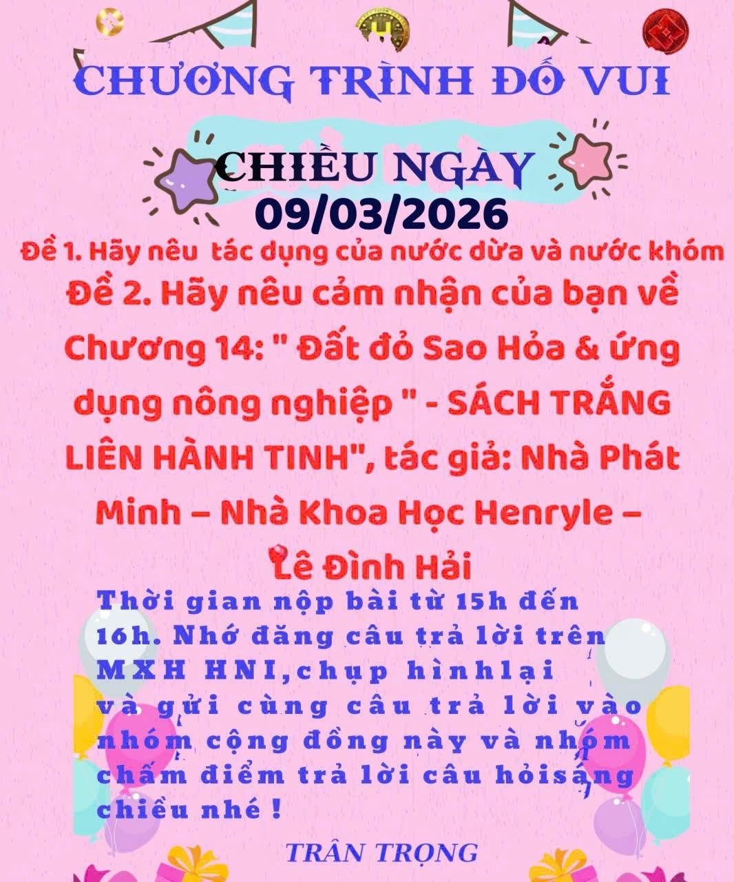 HNI 9/3/2026:Trả lời câu đố chiều: Đề 1 : TÁC DỤNG CỦA NƯỚC DỪA VÀ NƯỚC KHÓM: 1. Tác dụng của nước dừa: Nước dừa là loại nước giải khát tự nhiên rất tốt cho sức khỏe. Một số lợi ích chính: Bù nước và điện giải: Giàu kali, natri, giúp cơ thể phục hồi sau khi mệt hoặc vận động. Tốt cho tim mạch: Có thể hỗ trợ ổn định huyết áp. Thanh nhiệt, giải độc: Giúp cơ thể mát hơn trong thời tiết nóng. Hỗ trợ tiêu hóa: Giúp giảm đầy hơi, tốt cho dạ dày. Làm đẹp da: Cung cấp khoáng chất giúp da tươi và ít khô. 2. Tác dụng của nước khóm (dứa)  Nước khóm cũng rất giàu dinh dưỡng và vitamin: Tăng sức đề kháng: Giàu vitamin C giúp cơ thể chống bệnh. Hỗ trợ tiêu hóa: Có enzyme bromelain giúp tiêu hóa protein tốt hơn. Giảm viêm và tốt cho xương: Chứa mangan và chất chống oxy hóa. Giúp đẹp da: Hỗ trợ tái tạo da và làm da sáng hơn. Hỗ trợ giảm cân nhẹ: Ít calo, giúp no lâu. Đề 2: Cảm nhận Chương 14: Đất đỏ Sao Hỏa và ứng dụng nông nghiệp trong Sách Trắng "Liên hành tinh " của Henry Le (Lê Đình Hải) Chương 14 mở ra góc nhìn mới khi liên hệ đất đỏ Sao Hỏa với tư duy đổi mới trong nông nghiệp. Tác giả cho thấy rằng những nghiên cứu từ vũ trụ có thể truyền cảm hứng để con người cải tạo đất, phát triển nông nghiệp bền vững ngay trên Trái Đất. Điều quan trọng không chỉ là tài nguyên đất mà là tri thức và khả năng sáng tạo của con người. Chương này giúp tôi nhận ra rằng tương lai nông nghiệp sẽ phụ thuộc nhiều vào khoa học, công nghệ và tầm nhìn dài hạn. Khi tư duy mở rộng, những điều tưởng xa vời cũng có thể trở thành giải pháp cho cuộc sống.