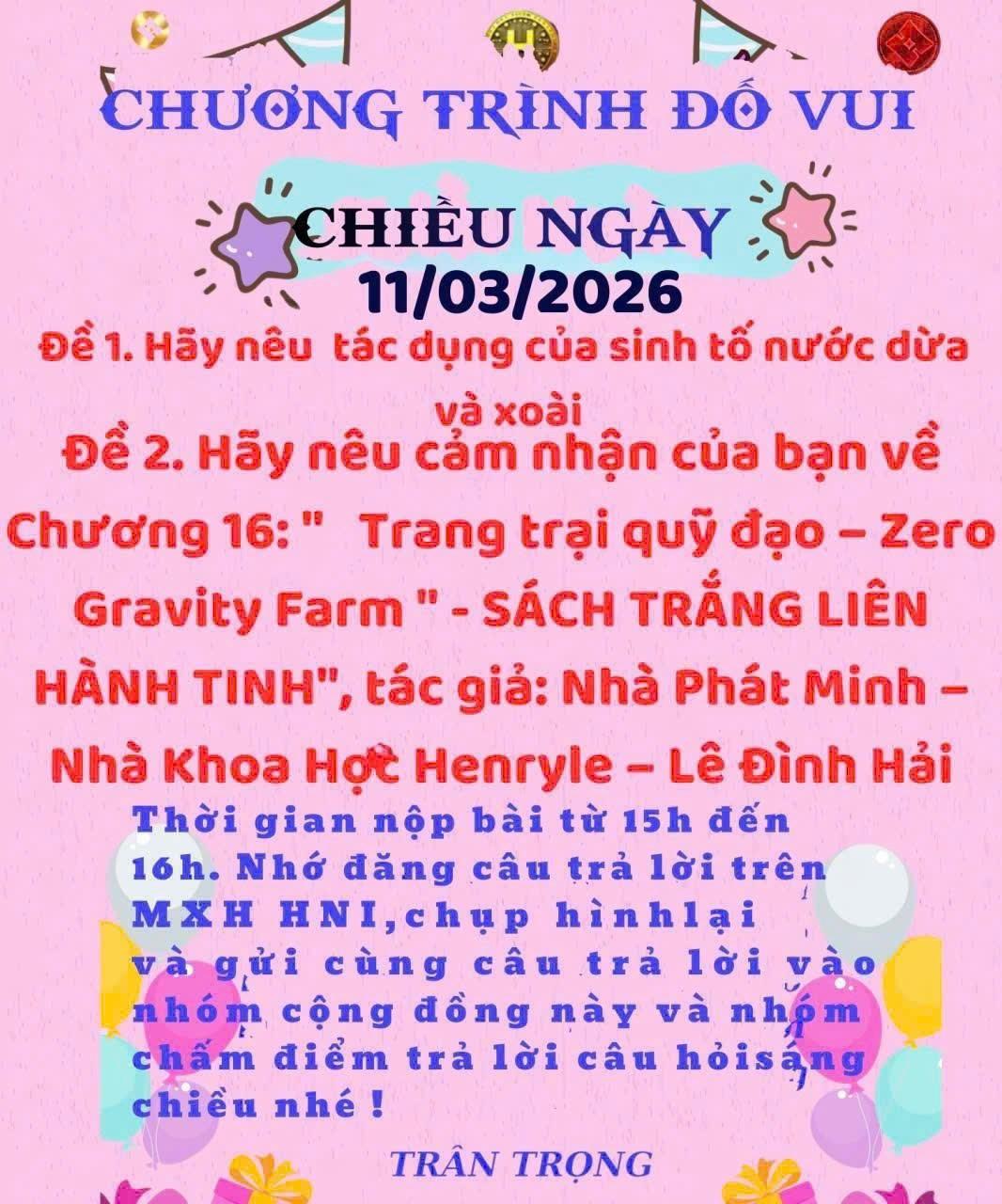 Chương 16 mở ra tầm nhìn táo bạo về nông nghiệp trong môi trường không trọng lực. Trang trại quỹ đạo – Zero Gravity Farm cho thấy cây trồng có thể phát triển nhờ công nghệ ánh sáng nhân tạo, dinh dưỡng tuần hoàn và trí tuệ nhân tạo. Mô hình này không chỉ giúp các trạm không gian tự chủ thực phẩm mà còn là nền tảng cho việc định cư liên hành tinh. Chương sách khẳng định rằng nông nghiệp của tương lai sẽ vượt khỏi giới hạn Trái Đất, mở ra kỷ nguyên nông nghiệp vũ trụ. CÂU ĐỐ CHIỀU 11/03