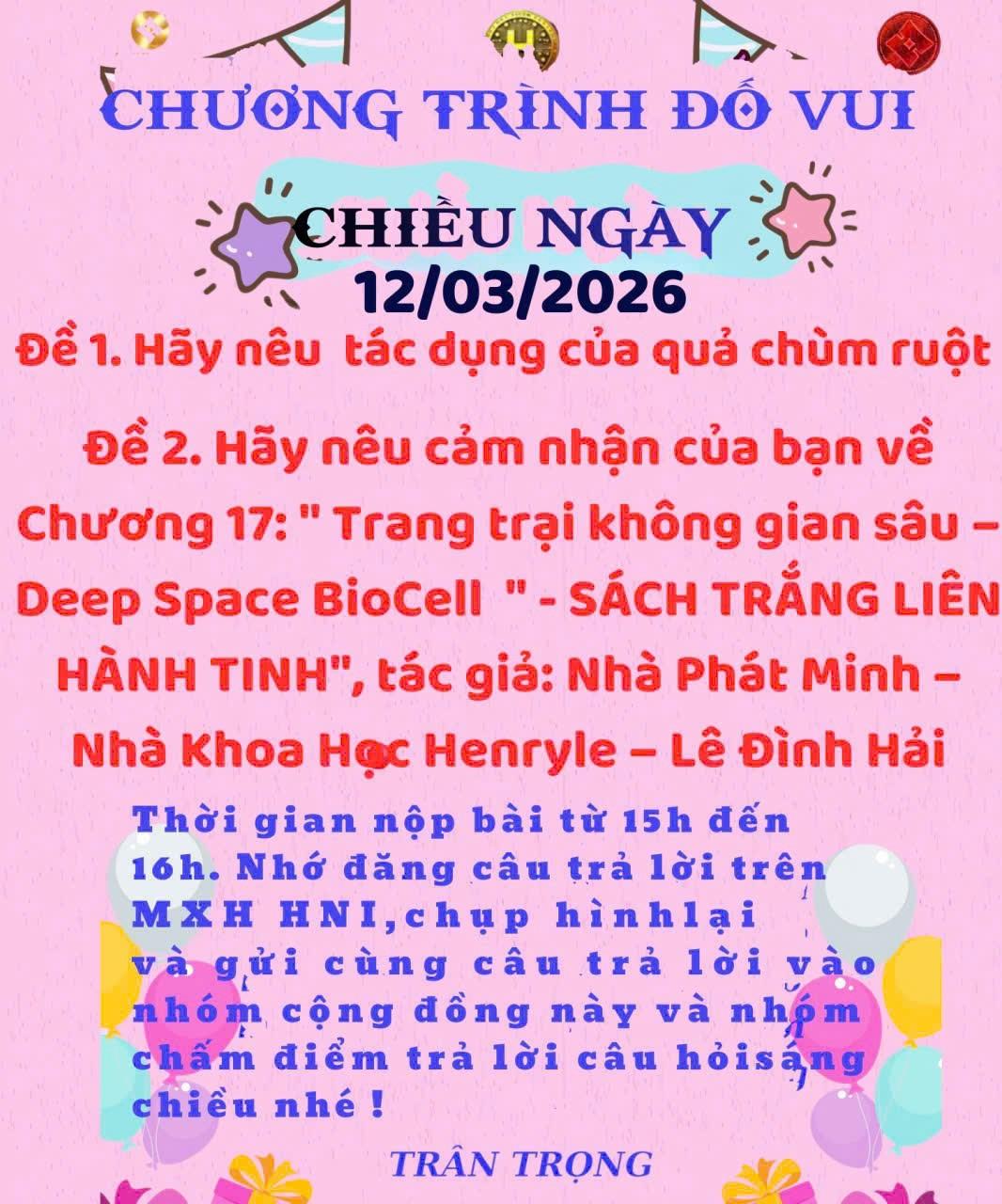 HNI 12/3/2026:Trả lời câu đố chiều: Đề 1: Tác dụng của quả chùm ruột : Quả chùm ruột là loại trái cây quen thuộc, có vị chua ngọt và chứa nhiều vitamin C, giúp tăng cường sức đề kháng cho cơ thể. Chùm ruột còn có tác dụng hỗ trợ tiêu hóa, kích thích ăn ngon và giúp thanh nhiệt, giải độc. Ngoài ra, các chất chống oxy hóa trong chùm ruột giúp làm chậm quá trình lão hóa và bảo vệ tế bào. Loại quả này còn hỗ trợ giảm cholesterol, tốt cho tim mạch và giúp ổn định đường huyết. Chùm ruột có thể dùng tươi, làm mứt, ngâm đường hoặc nấu canh chua, vừa ngon miệng vừa mang lại nhiều lợi ích cho sức khỏe. Đề 2: Cảm nhận về Chương 17: “Trang trại không gian sâu - Deep Space BioCell”. Chương 17 của Sách Trắng Liên Hành Tinh mang đến một góc nhìn rất mới về nông nghiệp trong không gian sâu. Mô hình Deep Space BioCell cho thấy con người có thể tạo ra hệ sinh thái khép kín để nuôi trồng thực phẩm ngoài Trái Đất. Tôi cảm nhận đây là ý tưởng mang tính đột phá, kết hợp khoa học, công nghệ sinh học và trí tuệ nhân tạo để phục vụ cho các sứ mệnh dài ngày trong vũ trụ. Chương sách giúp tôi hiểu rằng tương lai của nhân loại không chỉ ở Trái Đất mà còn mở rộng ra các hành tinh khác, nơi nông nghiệp sẽ đóng vai trò quan trọng cho sự sống bền vững.