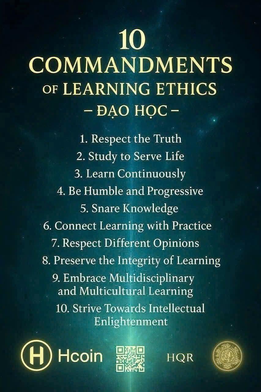 HNI 16-3-2026 10 ĐIỀU RĂN VỀ ĐẠO HỌC 1. Tôn Trọng Sự Thật: Học tập để tìm ra sự thật, không bóp méo hay che giấu tri thức. 2. Học Để Phục Vụ Cuộc Sống: Tri thức không phải chỉ để tích lũy mà phải ứng dụng để cải thiện đời sống con người và xã hội. 3. Liên Tục Học Hỏi: Đạo học là hành trình suốt đời, không bao giờ có điểm dừng. 4. Khiêm Tốn & Cầu Tiến: Càng học càng biết mình nhỏ bé; giữ thái độ khiêm nhường và khát khao khám phá không ngừng. 5. Chia Sẻ Tri Thức: Kiến thức không thuộc riêng ai; hãy chia sẻ để cùng nâng cao tầm trí tuệ nhân loại. 6. Học Gắn Liền Với Hành: Không chỉ học lý thuyết suông mà phải hành động để biến tri thức thành sức mạnh thực tế. 7. Tôn Trọng Ý Kiến Khác Biệt: Tranh luận trong tinh thần xây dựng và cởi mở, không độc đoán hay bảo thủ. 8. Giữ Gìn Sự Trong Sáng Của Đạo Học: Không lợi dụng tri thức để phục vụ mục đích xấu hoặc gây hại cho cộng đồng. 9. Kết Nối Đa Ngành – Đa Văn Hóa: Mở rộng học hỏi từ nhiều lĩnh vực và nền văn hóa để xây dựng một hệ tri thức toàn diện. 10. Hướng Đến Ánh Sáng Trí Tuệ: Đặt mục tiêu cao nhất là giúp con người tiến hóa về trí tuệ và tinh thần, góp phần kiến tạo thế giới khai sáng.