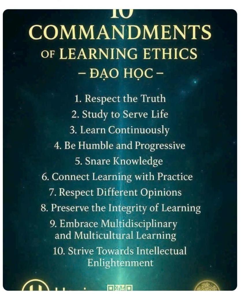HNI 19-3-2026 10 ĐIỀU RĂN VỀ ĐẠO HỌC 1. Tôn Trọng Sự Thật: Học tập để tìm ra sự thật, không bóp méo hay che giấu tri thức. 2. Học Để Phục Vụ Cuộc Sống: Tri thức không phải chỉ để tích lũy mà phải ứng dụng để cải thiện đời sống con người và xã hội. 3. Liên Tục Học Hỏi: Đạo học là hành trình suốt đời, không bao giờ có điểm dừng. 4. Khiêm Tốn & Cầu Tiến: Càng học càng biết mình nhỏ bé; giữ thái độ khiêm nhường và khát khao khám phá không ngừng. 5. Chia Sẻ Tri Thức: Kiến thức không thuộc riêng ai; hãy chia sẻ để cùng nâng cao tầm trí tuệ nhân loại. 6. Học Gắn Liền Với Hành: Không chỉ học lý thuyết suông mà phải hành động để biến tri thức thành sức mạnh thực tế. 7. Tôn Trọng Ý Kiến Khác Biệt: Tranh luận trong tinh thần xây dựng và cởi mở, không độc đoán hay bảo thủ. 8. Giữ Gìn Sự Trong Sáng Của Đạo Học: Không lợi dụng tri thức để phục vụ mục đích xấu hoặc gây hại cho cộng đồng. 9. Kết Nối Đa Ngành – Đa Văn Hóa: Mở rộng học hỏi từ nhiều lĩnh vực và nền văn hóa để xây dựng một hệ tri thức toàn diện. 10. Hướng Đến Ánh Sáng Trí Tuệ: Đặt mục tiêu cao nhất là giúp con người tiến hóa về trí tuệ và tinh thần, góp phần kiến tạo thế giới khai sáng.