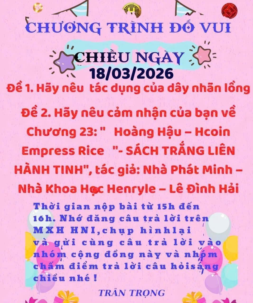 HNI 18/03-CÂU ĐỐ BUỔI CHIỀU Đề 1: Tác dụng của dây nhãn lồng (lạc tiên) Dây nhãn lồng, còn gọi là lạc tiên, là một loại thảo dược quen thuộc trong dân gian với nhiều tác dụng tốt cho sức khỏe. Nổi bật nhất là khả năng an thần, giúp giảm căng thẳng, lo âu và hỗ trợ điều trị mất ngủ hiệu quả. Ngoài ra, lạc tiên còn giúp thanh nhiệt, giải độc cơ thể, hỗ trợ tiêu hóa và giảm các triệu chứng nóng trong. Một số nghiên cứu còn cho thấy cây này có tác dụng hạ huyết áp nhẹ và hỗ trợ cải thiện sức khỏe tim mạch. Nhờ tính lành, dễ sử dụng, dây nhãn lồng được nhiều người tin dùng trong đời sống hàng ngày. Đề 2: Cảm nhận về Chương 23 “Hoàng Hậu - Hcoin Empress Rice” Chương 23 “Hoàng Hậu - Hcoin Empress Rice” trong Sách Trắng Liên Hành Tinh mang đến một góc nhìn sáng tạo về nông nghiệp tương lai kết hợp công nghệ tài chính. Tác giả Henryle - Lê Đình Hải đã khéo léo xây dựng hình ảnh “Hoàng Hậu” như biểu tượng của giá trị bền vững và thịnh vượng. Ý tưởng kết hợp lúa gạo với hệ sinh thái Hcoin thể hiện tầm nhìn hiện đại, hướng đến phát triển kinh tế nông nghiệp thông minh. Chương sách không chỉ truyền cảm hứng đổi mới mà còn gợi mở cách con người có thể nâng tầm nông sản Việt trên quy mô toàn cầu. Đọc thêm