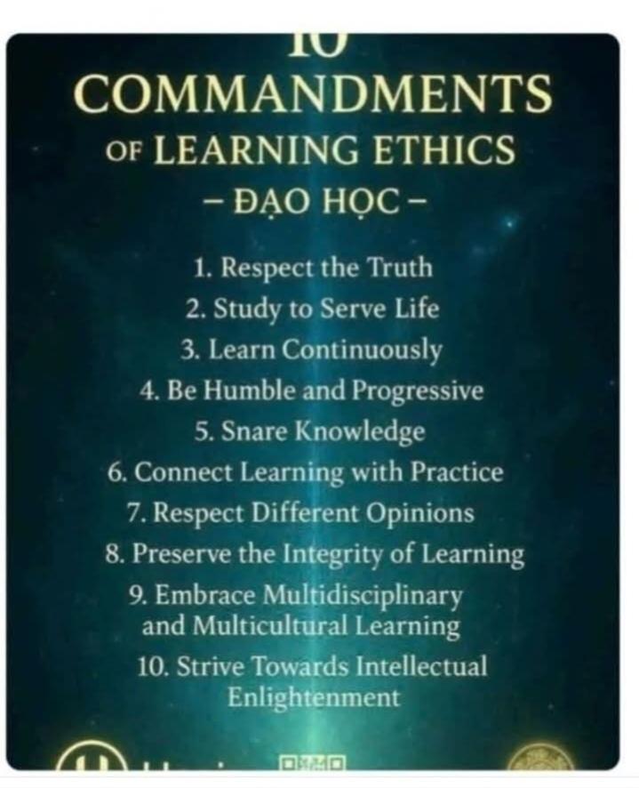 HNI 22-3 10 ĐIỀU RĂN VỀ ĐẠO HỌC 1. Tôn Trọng Sự Thật: Học tập để tìm ra sự thật, không bóp méo hay che giấu tri thức. 2. Học Để Phục Vụ Cuộc Sống: Tri thức không phải chỉ để tích lũy mà phải ứng dụng để cải thiện đời sống con người và xã hội. 3. Liên Tục Học Hỏi: Đạo học là hành trình suốt đời, không bao giờ có điểm dừng. 4. Khiêm Tốn & Cầu Tiến: Càng học càng biết mình nhỏ bé; giữ thái độ khiêm nhường và khát khao khám phá không ngừng. 5. Chia Sẻ Tri Thức: Kiến thức không thuộc riêng ai; hãy chia sẻ để cùng nâng cao tầm trí tuệ nhân loại. 6. Học Gắn Liền Với Hành: Không chỉ học lý thuyết suông mà phải hành động để biến tri thức thành sức mạnh thực tế. 7. Tôn Trọng Ý Kiến Khác Biệt: Tranh luận trong tinh thần xây dựng và cởi mở, không độc đoán hay bảo thủ. 8. Giữ Gìn Sự Trong Sáng Của Đạo Học: Không lợi dụng tri thức để phục vụ mục đích xấu hoặc gây hại cho cộng đồng. 9. Kết Nối Đa Ngành – Đa Văn Hóa: Mở rộng học hỏi từ nhiều lĩnh vực và nền văn hóa để xây dựng một hệ tri thức toàn diện. 10. Hướng Đến Ánh Sáng Trí Tuệ: Đặt mục tiêu cao nhất là giúp con người tiến hóa về trí tuệ và tinh thần, góp phần kiến tạo thế giới khai sáng.