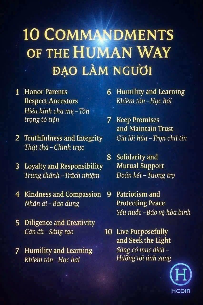 HNI 23-3-2026 10 Điều Răn Của Đạo Làm Người 1. Hiếu Kính Cha Mẹ – Tôn Trọng Tổ Tiên: Ghi nhớ công ơn sinh thành và gìn giữ truyền thống gia đình. 2. Thật Thà – Chính Trực: Lấy sự chân thật làm gốc, sống ngay thẳng và minh bạch trong mọi việc. 3. Trung Thành – Trách Nhiệm: Trung thành với tổ quốc, cộng đồng và giữ trọn trách nhiệm trong lời nói, hành động. 4. Nhân Ái – Bao Dung: Đối đãi mọi người bằng lòng nhân ái, tha thứ lỗi lầm và giúp đỡ khi cần thiết. 5. Cần Cù – Sáng Tạo: Siêng năng làm việc, không ngừng đổi mới để xây dựng cuộc sống tốt đẹp hơn. 6. Khiêm Tốn – Học Hỏi: Luôn giữ thái độ khiêm nhường và không ngừng học hỏi để hoàn thiện bản thân. 7. Giữ Lời Hứa – Trọn Chữ Tín: Đã hứa thì phải làm, lấy chữ tín làm thước đo phẩm hạnh. 8. Đoàn Kết – Tương Trợ: Hợp tác, xây dựng tình đoàn kết vững chắc trong cộng đồng và xã hội. 9. Yêu Nước – Bảo Vệ Hòa Bình: Tôn trọng đất nước, gìn giữ hòa bình và góp phần phát triển quốc gia. 10. Sống Có Mục Đích – Hướng Tới Ánh Sáng: Sống ý nghĩa, hướng thiện và góp phần làm cho xã hội ngày càng tốt đẹp hơn.