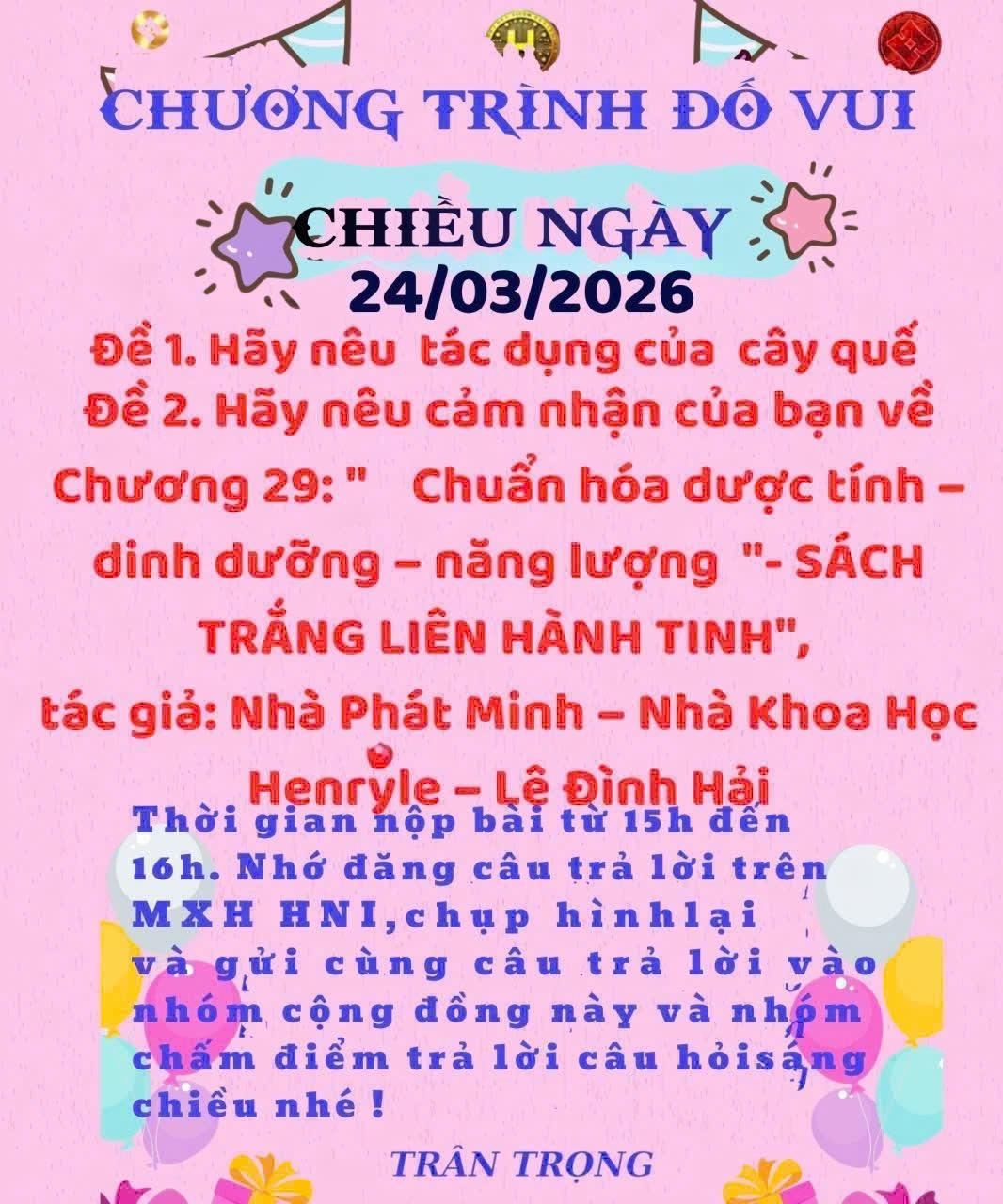 HNI 24/3/2026: Trả lời câu đố chiều: Đề 1: Tác dụng của cây quế: Cây quế là một dược liệu và gia vị rất quý, được sử dụng rộng rãi trong y học cổ truyền lẫn đời sống hằng ngày. Dưới đây là những tác dụng chính của cây quế: 1. Tác dụng đối với sức khỏe: -Làm ấm cơ thể, kích thích tuần hoàn -Quế có tính nóng, giúp làm ấm bụng, tay chân -Hỗ trợ lưu thông máu, giảm lạnh, đặc biệt tốt cho người hay bị lạnh bụng 2. Hỗ trợ tiêu hóa: * Kích thích tiết dịch tiêu hóa * Giảm đầy hơi, chướng bụng, khó tiêu 3.Kháng khuẩn, kháng viêm: * Tinh dầu quế có khả năng tiêu diệt vi khuẩn, nấm * Dùng trong các bài thuốc trị cảm cúm, viêm họng 4.Hỗ trợ kiểm soát đường huyết: * Một số nghiên cứu cho thấy quế giúp giảm lượng đường trong máu * Có lợi cho người bị tiền tiểu đường hoặc tiểu đường (dùng đúng liều) 5.Tăng cường miễn dịch: * Nhờ đặc tính chống oxy hóa mạnh * Giúp cơ thể chống lại bệnh tật 6. Tác dụng trong làm đẹp: * Giúp làm sạch da, giảm mụn (do kháng khuẩn) * Kích thích mọc tóc (khi dùng tinh dầu quế đúng cách) * Làm ấm da, tăng tuần hoàn dưới da 7.Tác dụng trong ẩm thực: * Là gia vị quen thuộc trong các món: * Phở, bò kho, cà ri * Trà quế, bánh ngọt * Tạo mùi thơm đặc trưng, giúp món ăn hấp dẫn hơn 8.Tác dụng trong kinh tế: * Là cây trồng có giá trị cao * Vỏ quế, tinh dầu quế đều có thể xuất khẩu * Phù hợp phát triển ở nhiều vùng đồi núi Việt Nam Lưu ý khi sử dụng: * Không nên dùng quá nhiều (có thể gây nóng, hại gan nếu lạm dụng) * Phụ nữ mang thai nên hạn chế * Tinh dầu quế cần pha loãng trước khi dùng ngoài. Đề 2: Cảm nhận Chương 29 “Chuẩn hóa dược tính – dinh dưỡng – năng lượng” trong " Sách trắng liên hành tinh". Nội dung Chương 29 mở ra một tư duy rất tiên phong và giàu tính “khai mở”. Ý tưởng H-Bio Index không chỉ là một thước đo, mà giống như một “ngôn ngữ mới” để con người hiểu sâu hơn về thực phẩm. Điểm đặc biệt là sự kết hợp giữa khoa học dinh dưỡng, dược học và yếu tố năng lượng – vốn trước đây ít được lượng hóa. Điều này tạo cảm giác vừa táo bạo, vừa mang tính định hướng tương lai. Tuy nhiên, để thuyết phục rộng rãi, hệ thống này sẽ cần được kiểm chứng thực nghiệm và chuẩn hóa khoa học rõ ràng hơn.