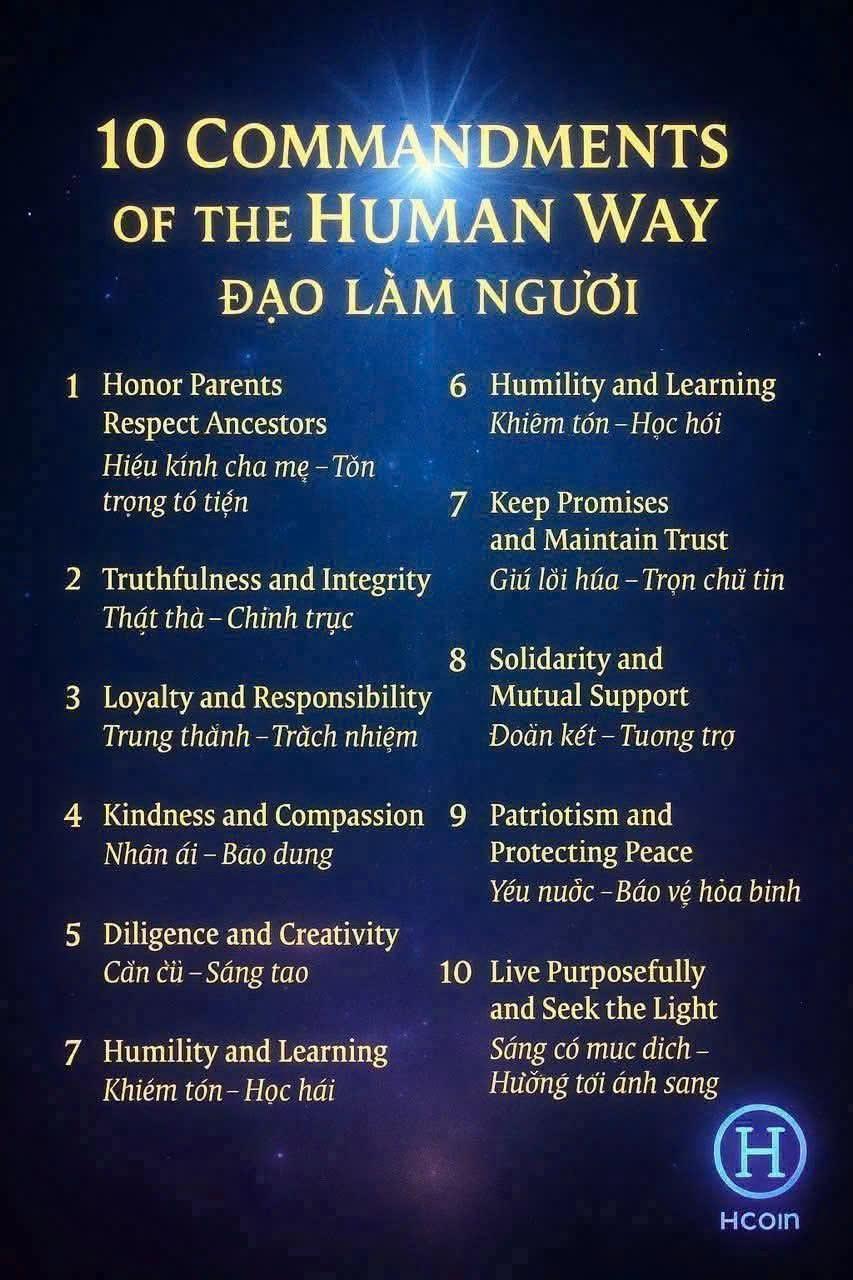 HNI 01-4-2026: 10 Điều Răn Của Đạo Làm Người 1. Hiếu Kính Cha Mẹ – Tôn Trọng Tổ Tiên: Ghi nhớ công ơn sinh thành và gìn giữ truyền thống gia đình. 2. Thật Thà – Chính Trực: Lấy sự chân thật làm gốc, sống ngay thẳng và minh bạch trong mọi việc. 3. Trung Thành – Trách Nhiệm: Trung thành với tổ quốc, cộng đồng và giữ trọn trách nhiệm trong lời nói, hành động. 4. Nhân Ái – Bao Dung: Đối đãi mọi người bằng lòng nhân ái, tha thứ lỗi lầm và giúp đỡ khi cần thiết. 5. Cần Cù – Sáng Tạo: Siêng năng làm việc, không ngừng đổi mới để xây dựng cuộc sống tốt đẹp hơn. 6. Khiêm Tốn – Học Hỏi: Luôn giữ thái độ khiêm nhường và không ngừng học hỏi để hoàn thiện bản thân. 7. Giữ Lời Hứa – Trọn Chữ Tín: Đã hứa thì phải làm, lấy chữ tín làm thước đo phẩm hạnh. 8. Đoàn Kết – Tương Trợ: Hợp tác, xây dựng tình đoàn kết vững chắc trong cộng đồng và xã hội. 9. Yêu Nước – Bảo Vệ Hòa Bình: Tôn trọng đất nước, gìn giữ hòa bình và góp phần phát triển quốc gia. 10. Sống Có Mục Đích – Hướng Tới Ánh Sáng: Sống ý nghĩa, hướng thiện và góp phần làm cho xã hội ngày càng tốt đẹp hơn.