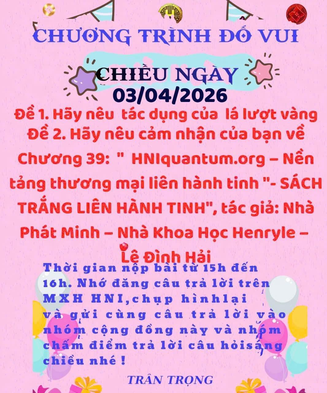HNI 03/4/2026:Trả lời câu đố chiều: Đề 1: Tác dụng của lá lược vàng: Lá lượt vàng là một loại dược liệu dân gian được nhiều người sử dụng nhờ những công dụng tốt cho sức khỏe. Lá có tính mát, giúp thanh nhiệt, giải độc cơ thể, hỗ trợ làm mát gan và cải thiện chức năng tiêu hóa. Ngoài ra, nước sắc từ lá lượt vàng còn có thể giúp giảm viêm, hỗ trợ làm lành vết thương và tăng cường sức đề kháng. Một số người còn dùng lá để nấu nước uống giúp ngủ ngon và giảm căng thẳng. Tuy nhiên, cần sử dụng đúng liều lượng và tham khảo ý kiến chuyên gia để đảm bảo an toàn. Đề 2: Cảm nhận về Chương 39: "HNIquantum.org - Nền tảng thương mại liên hành tinh" trong " Sách trắng liên hành tinh". Chương 39 về “HNIquantum.org - Nền tảng thương mại liên hành tinh” mang đến một góc nhìn mới mẻ và đầy sáng tạo về tương lai kinh tế. Tôi cảm nhận đây không chỉ là một ý tưởng công nghệ mà còn thể hiện khát vọng kết nối toàn cầu và xa hơn nữa là liên hành tinh. Nội dung gợi mở về việc ứng dụng công nghệ tiên tiến, kết hợp tài chính, thương mại và tư duy đổi mới để kiến tạo hệ sinh thái phát triển bền vững. Chương sách truyền cảm hứng mạnh mẽ, khuyến khích con người dám nghĩ lớn, hành động vì tương lai chung của nhân loại.