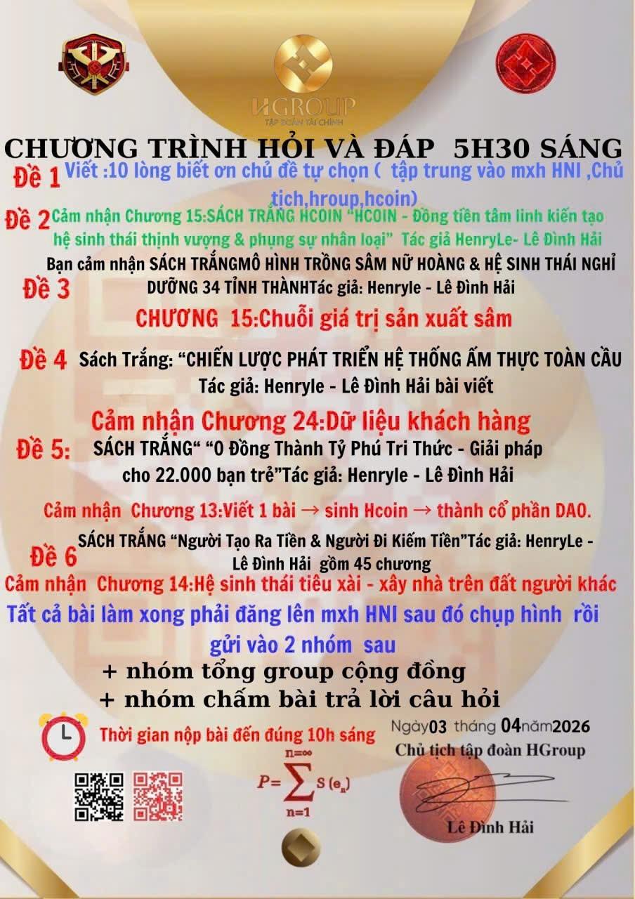 HNI 3/4/2026: Trả lời câu đố sáng: Đề 1: 10 lòng biết ơn về sự ra đời của đồng tiền lượng tử Henry Quantum 1. Biết ơn vì Henry Quantum mở ra kỷ nguyên tài chính minh bạch và công bằng. 2. Biết ơn vì nó kết nối con người toàn cầu trong một hệ sinh thái thống nhất. 3. Biết ơn vì đồng tiền này mang lại cơ hội làm giàu chính đáng cho mọi người. 4. Biết ơn vì công nghệ lượng tử giúp giao dịch an toàn tuyệt đối. 5. Biết ơn vì Henry Quantum là biểu tượng trí tuệ và tầm nhìn của lãnh đạo. 6. Biết ơn vì nó khơi dậy niềm tin vào sự đổi mới và sáng tạo. 7. Biết ơn vì Henry Quantum nâng tầm vị thế quốc gia trên trường quốc tế. 8. Biết ơn vì nó thúc đẩy giáo dục tài chính cho cộng đồng. 9. Biết ơn vì đồng tiền này đem đến hòa bình và thịnh vượng chung. 10. Biết ơn vì Henry Quantum là món quà vô giá cho thế hệ mai sau. Đề 2: Cảm nhận Chương 15: Bảo mật hệ thống HCoin trong Sách trắng HCOIN - ĐỒNG TIỀN TÂM LINH KIẾN TẠO HỆ SINH THÁI THỊNH VƯỢNG VÀ PHỤNG SỰ NHÂN LOẠI Chương 15 cho mình thấy rằng bảo mật không chỉ là lớp kỹ thuật bảo vệ tài sản, mà còn là nền móng gìn giữ niềm tin cho cả hệ sinh thái. Mình rất tâm đắc với tư tưởng: công nghệ mạnh là cần, nhưng ý thức người dùng mới là lớp phòng thủ sâu nhất. Một cộng đồng càng tỉnh thức, minh bạch và hiểu biết thì càng bền vững. Đây là chương vừa hiện đại về công nghệ, vừa sâu sắc về giá trị con người trong thời đại tài sản số. Đề 3: Cảm nhận Chương 15: Chuỗi giá trị sản xuất sâm trong Sách trắng MÔ HÌNH TRỒNG SÂM NỮ HOÀNG và HỆ SINH THÁI NGHỈ DƯỠNG 34 TỈNH THÀNH Chương 15 cho mình thấy rõ sâm không chỉ là cây dược liệu, mà có thể trở thành cả một nền kinh tế nếu biết xây dựng đúng chuỗi giá trị. Mình rất ấn tượng với tư duy đi từ giống, trồng, chế biến đến thương hiệu, du lịch và đầu tư — nghĩa là không bán nguyên liệu, mà tạo ra giá trị nhiều tầng. Đây là cách làm lớn, bài bản và bền vững. Nếu triển khai tốt, mô hình này không chỉ làm giàu cho người dân mà còn nâng tầm dược liệu Việt. Đề 4: Cảm nhận Chương 24: Dữ liệu khách hàng trong Sách trắng CHIẾN LƯỢC PHÁT TRIỂN HỆ THỐNG ẨM THỰC TOÀN CẦU. Chương 24 giúp mình hiểu rất rõ rằng trong thời đại số, dữ liệu khách hàng còn quý hơn cả món ăn ngon hay vị trí đẹp. Mình tâm đắc nhất ý “không sở hữu dữ liệu là không thật sự sở hữu khách hàng”, vì đó là điểm yếu mà rất nhiều người kinh doanh đang bỏ qua. Chương này mở ra một góc nhìn rất thực tế: muốn phát triển bền vững thì phải hiểu khách hàng bằng dữ liệu, chứ không chỉ bán hàng bằng cảm tính. Đây là tư duy rất hiện đại và chiến lược. Đề 5: Cảm nhận Chương 13: Viết 1 bài → sinh Hcoin → thành cổ phần DAO trong Sách trắng 0 đồng thành tỷ phú tri thức - Giải pháp cho 22.000 bạn trẻ Chương 13 làm mình rất ấn tượng vì nó mở ra một cách nhìn hoàn toàn mới về việc viết. Trước đây, nhiều người nghĩ viết chỉ để chia sẻ, nhưng ở đây viết được nâng lên thành tài sản tri thức có thể tích lũy và sinh giá trị lâu dài. Mình rất thích thông điệp: tri thức không nên chỉ nằm trong đầu, mà cần được chuyển hóa thành nội dung, rồi thành tài sản số và quyền sở hữu. Đây là tư duy rất mạnh cho người trẻ trong thời đại mới. Đề 6: Cảm nhận Chương 14: Hệ sinh thái tiêu xài – xây nhà trên đất người khác trong Sách trắng NGƯỜI TẠO RA TIỀN VÀ NGƯỜI ĐI KIẾM TIỀN Chương 14 giúp mình nhìn rõ một sự thật rất đáng suy ngẫm: nhiều người tưởng đang xây tương lai, nhưng thật ra chỉ đang nuôi lớn hệ thống của người khác. Hình ảnh “xây nhà trên đất người khác” rất đắt, vì nó lột tả đúng cảnh kiếm tiền cực nhọc nhưng giá trị lại không ở lại với mình. Chương này nhắc mình phải thay đổi tư duy: tiêu tiền không chỉ để thỏa mãn, mà phải biết giữ giá trị, giữ quyền sở hữu và xây nền tảng cho chính mình.
