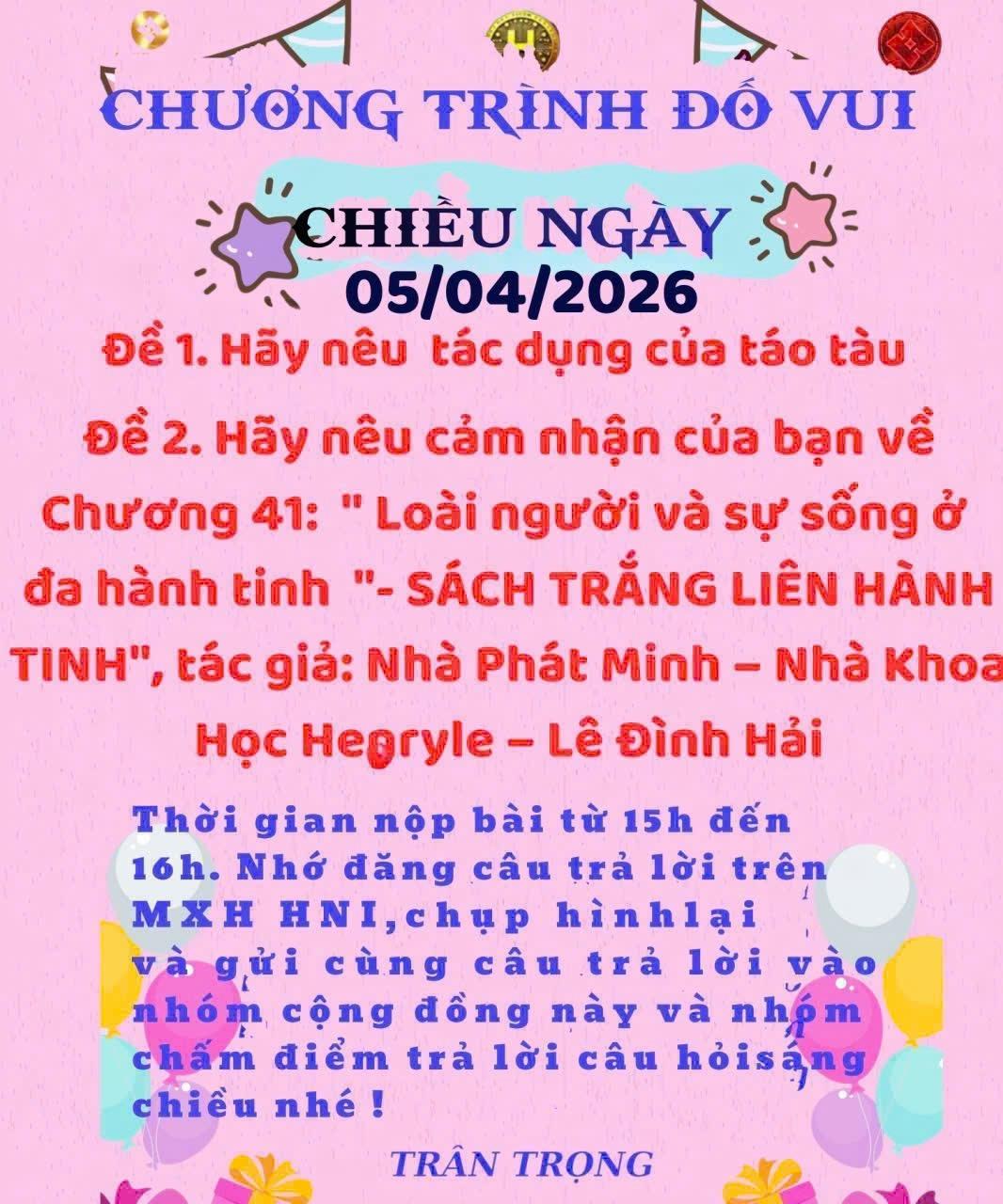 CÂU ĐỐ CHIỀU 05/04. Đề 1: Tác dụng của Táo tàu: Táo tàu là một loại quả rất quen thuộc trong Đông y và ẩm thực, đặc biệt phổ biến trong các món chè, hầm và thuốc bổ. Dưới đây là những tác dụng chính của táo tàu: 1. Bổ khí, tăng cường sức khỏe: * Bổ tỳ, ích khí (tăng năng lượng cho cơ thể) * Giúp người suy nhược, mệt mỏi, ăn uống kém phục hồi nhanh hơn * Thường dùng cho người mới ốm dậy hoặc lao lực. 2. Dưỡng huyết, tốt cho tim mạch: * Giúp tăng cường lưu thông máu * Hỗ trợ giảm cholesterol xấu * Có lợi cho tim và huyết áp * Phù hợp với người thiếu máu, chóng mặt, da xanh 3. An thần, cải thiện giấc ngủ: * Táo tàu có tác dụng làm dịu thần kinh * Giúp ngủ ngon, giảm lo âu, căng thẳng *Người mất ngủ nhẹ, ngủ không sâu rất nên dùng. 4. Tốt cho tiêu hóa: * Hỗ trợ hoạt động dạ dày, kích thích ăn ngon * Giảm tình trạng đầy hơi, khó tiêu *Hay được dùng nấu cháo, hầm gà, nấu nước uống. 5. Tăng cường miễn dịch: * Chứa nhiều vitamin C và chất chống oxy hóa * Giúp cơ thể chống lại bệnh tật 6. Làm đẹp da, chống lão hóa: * Giúp da hồng hào, giảm khô sạm * Làm chậm quá trình lão hóa *Cách sử dụng phổ biến: * Nấu nước uống (5–10 quả/ngày) * Hầm với gà, chim, hoặc thuốc bắc * Nấu chè, cháo * Ăn trực tiếp (loại khô) Lưu ý khi dùng: * Không nên ăn quá nhiều (dễ gây nóng, đầy bụng) * Người bị tiểu đường nên dùng ít vì có vị ngọt tự nhiên * Người đang bị cảm, đầy bụng nặng nên hạn chế dùng Đề 2: Cảm nhận Chương 41 “Loài người và sự sống ở đa hành tinh” Nội dung Bài viết mở ra một tầm nhìn mạnh mẽ và đầy cảm hứng về tương lai đa hành tinh của nhân loại. Điểm nổi bật là sự chuyển dịch tư duy từ “sinh tồn” sang “mở rộng sự sống”, thể hiện một bước tiến lớn trong nhận thức. Ba giai đoạn phát triển được trình bày rõ ràng, logic, giúp người đọc hình dung lộ trình cụ thể. Đặc biệt, vai trò của nông nghiệp và công nghệ sinh học được nhấn mạnh như nền tảng cốt lõi. Tuy nhiên, một số ý tưởng vẫn mang tính khái niệm cao, cần thêm dẫn chứng khoa học để tăng tính thuyết phục và khả thi.