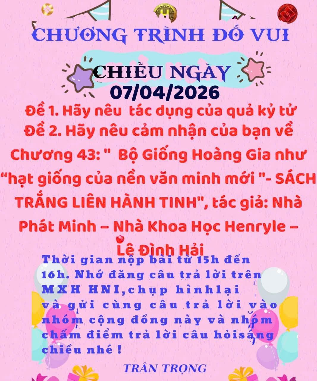 HNI 7/4/2026- CÂU ĐỐ CHIỀU Đề 1: Tác dụng của quả kỷ tử: Quả kỷ tử là một vị thuốc – thực phẩm rất nổi tiếng trong Đông y và dinh dưỡng hiện đại. Tên khoa học phổ biến là kỷ tử. Dưới đây là những tác dụng chính của kỷ tử: 1. Bổ gan, sáng mắt: Kỷ tử thường được dùng để dưỡng gan, cải thiện thị lực Hỗ trợ các vấn đề như: -Mờ mắt, khô mắt -Mỏi mắt do dùng điện thoại, máy tính nhiều 2. Tăng cường miễn dịch: * Giàu chất chống oxy hóa (đặc biệt là polysaccharides) * Giúp cơ thể: -Tăng sức đề kháng -Chống viêm, chống lão hóa 3. Tốt cho não và trí nhớ: * Hỗ trợ bảo vệ tế bào thần kinh * Giúp: -Cải thiện trí nhớ -Giảm căng thẳng, ngủ ngon hơn 4. Bổ thận, tăng sinh lực: * Theo Đông y: kỷ tử bổ thận, ích tinh * Thường dùng cho: -Người suy nhược -Nam giới yếu sinh lý -Người lớn tuổi 5. Hỗ trợ ổn định đường huyết: * Có thể giúp: -Điều hòa lượng đường trong máu -Phù hợp người có nguy cơ tiểu đường (dùng đúng liều) 6. Tốt cho tim mạch: * Giúp giảm cholesterol xấu * Hỗ trợ tuần hoàn máu tốt hơn 7. Làm đẹp da, chống lão hóa: * Chống oxy hóa mạnh → giúp: -Da sáng hơn -Giảm nếp nhăn -Làm chậm quá trình lão hóa *Lưu ý khi dùng: -Không nên dùng quá nhiều (khoảng 10–20g/ngày là hợp lý) -Người đang: * Sốt, viêm cấp * Tiêu chảy → nên hạn chế dùng * Phụ nữ mang thai hoặc người đang dùng thuốc nên hỏi ý kiến bác sĩ. Đề 2: Cảm nhận Chương 43 “Bộ Giống Hoàng Gia như “hạt giống của nền văn minh mới” trong " Sách trắng liên hánh tịnh". Nội dung Bài viết mang tầm nhìn lớn, giàu tính biểu tượng và khơi gợi cảm hứng về một nền văn minh mới bắt đầu từ “hạt giống”. Cách bạn mở rộng khái niệm hạt giống từ nông nghiệp sang sinh học – công nghệ – hệ sinh thái là rất sáng tạo. Tuy nhiên, nội dung hiện nghiêng nhiều về tính triết lý và giả tưởng, cần bổ sung cơ sở khoa học, dữ liệu thực nghiệm để tăng độ thuyết phục. Nếu cân bằng tốt giữa tầm nhìn và tính khả thi, đây có thể trở thành một концеп mạnh, độc đáo trong lĩnh vực nông nghiệp tương lai và đa hành tinh.