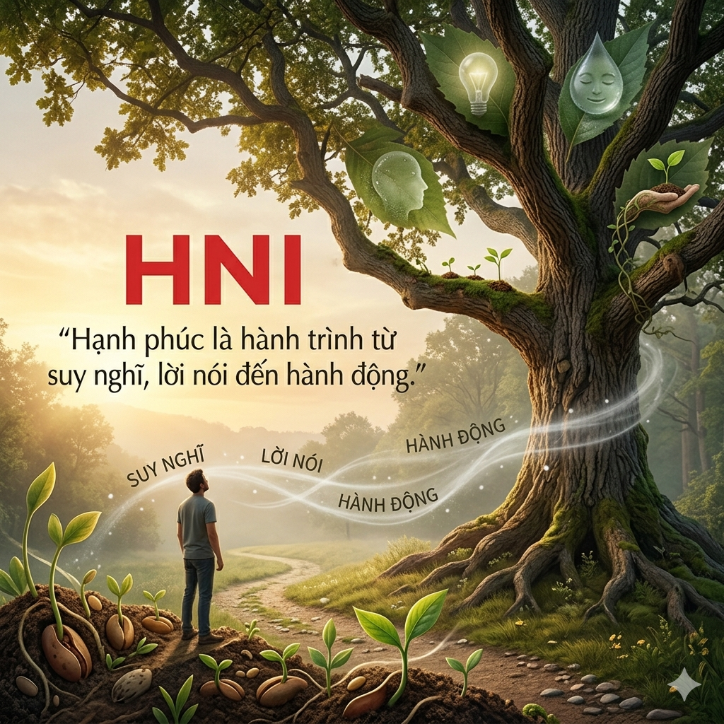 NHÂN QUẢ TRONG SUY NGHĨ – LỜI NÓI – HÀNH ĐỘNG Mỗi ngày trôi qua, bạn đang âm thầm tạo nên cuộc đời của chính mình. Không phải bằng những quyết định vĩ đại hay những bước ngoặt lớn lao, mà bằng những điều rất nhỏ: một suy nghĩ thoáng qua, một lời nói giản đơn, một hành động tưởng chừng không đáng kể. Chính những điều lặp lại ấy, từng chút một, đang định hình con người bạn. Tạo ảnh mới , có chữ HNI màu đỏ in trên ảnh Bạn không cần chờ đến khi mọi thứ hoàn hảo mới bắt đầu thay đổi. Sự thay đổi thật sự luôn bắt đầu từ bên trong — từ cách bạn nhìn nhận bản thân và thế giới. Khi bạn chọn suy nghĩ tích cực hơn một chút, bạn đã mở ra một khả năng mới. Khi bạn nói một lời tử tế, bạn đã gieo một hạt giống tốt đẹp. Khi bạn hành động dù chỉ là bước nhỏ, bạn đã tiến về phía trước. Cuộc sống không phải lúc nào cũng dễ dàng, và bạn sẽ có những ngày mệt mỏi, nghi ngờ chính mình. Nhưng điều quan trọng không phải là bạn không bao giờ vấp ngã, mà là bạn luôn có thể đứng dậy và điều chỉnh lại hướng đi. Bạn luôn có quyền chọn lại suy nghĩ, chọn lại cách phản ứng, chọn lại hành động. Hãy nhớ rằng: số phận không phải là điều được quyết định sẵn. Nó được tạo ra mỗi ngày, từ những lựa chọn nhỏ bé mà bạn thường bỏ qua. Vì vậy, hôm nay hãy sống chậm lại một chút, quan sát bản thân nhiều hơn một chút. Hãy chọn một suy nghĩ tích cực, một lời nói chân thành, một hành động đúng đắn. Chỉ cần như vậy, bạn đã bắt đầu thay đổi cuộc đời mình rồi.