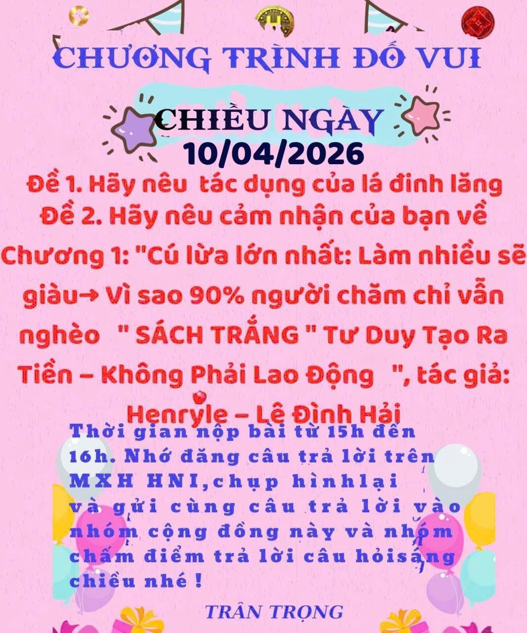 CÂU ĐỐ CHIỀU 10/04 Đề 1: Tác dụng của lá đinh lăng: Lá đinh lăng là một loại thảo dược quen thuộc trong y học dân gian Việt Nam, mang lại nhiều lợi ích cho sức khỏe. Lá giúp bồi bổ cơ thể, tăng cường sức đề kháng và cải thiện tuần hoàn máu. Ngoài ra, đinh lăng còn hỗ trợ giảm mệt mỏi, lợi sữa cho phụ nữ sau sinh và giúp ngủ ngon hơn. Lá có thể dùng để nấu canh, làm gỏi hoặc sắc nước uống. Bên cạnh đó, đinh lăng còn có tác dụng giải độc, giảm đau nhức xương khớp và hỗ trợ tiêu hóa hiệu quả. Đề 2: Cảm nhận Chương 1: "Cú lừa lớn nhất : Làm nhiều sẽ giàu -> Vì sao 90% người chăm chỉ vẫn nghèo" trong sách trắng "Tư duy tạo ra tiền - Không phải lao động". Chương 1 mang đến góc nhìn mới về sự giàu có, nhấn mạnh rằng làm nhiều chưa chắc đã giàu nếu thiếu tư duy đúng. Thông điệp “90% người chăm chỉ vẫn nghèo” khiến tôi suy ngẫm sâu sắc về cách làm việc của bản thân. Tác giả khuyến khích chuyển từ tư duy lao động sang tư duy tạo giá trị, biết tận dụng hệ thống và đòn bẩy. Tôi nhận ra rằng muốn thay đổi tài chính, cần học hỏi, đổi mới suy nghĩ và làm việc thông minh hơn, không chỉ chăm chỉ. Đây là bài học rất thực tế và truyền cảm hứng mạnh mẽ.