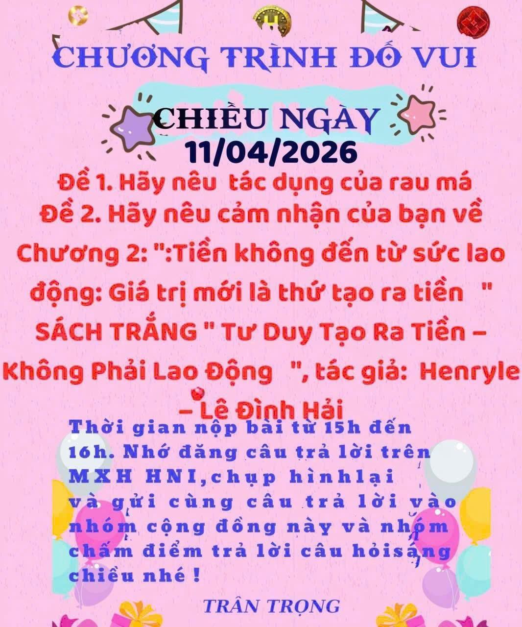 TRẢ LỜI CÂU ĐỐ BUỔI CHIỀU NGÀY 11/04/2026 Đề 1: Tác dụng của rau má Rau má là loại thảo dược quen thuộc, mang lại nhiều lợi ích cho sức khỏe. Trước hết, rau má có tác dụng thanh nhiệt, giải độc, giúp làm mát cơ thể, đặc biệt hữu ích trong những ngày nóng. Ngoài ra, rau má còn hỗ trợ cải thiện làn da, giúp giảm mụn, làm sáng và mịn da nhờ khả năng chống viêm. Bên cạnh đó, rau má giúp tăng cường tuần hoàn máu, hỗ trợ trí nhớ và giảm căng thẳng. Không chỉ vậy, nó còn tốt cho gan và giúp lợi tiểu. Tuy nhiên, cần sử dụng với liều lượng hợp lý để đạt hiệu quả tốt nhất. Đề 2: Cảm nhận Chương 2 Chương 2 của “Sách Trắng – Tư Duy Tạo Ra Tiền” mang đến một góc nhìn mới mẻ: tiền không đến từ việc lao động chăm chỉ mà đến từ giá trị tạo ra. Điều này giúp tôi nhận ra rằng chỉ làm việc nhiều chưa chắc đã giàu, mà cần tư duy sáng tạo và tạo ra giá trị cho xã hội. Khi con người giải quyết được vấn đề của người khác, tiền sẽ tự nhiên đến như một hệ quả. Tư duy này khuyến khích mỗi người phát triển bản thân, học hỏi và đổi mới liên tục. Đây là bài học quan trọng để thay đổi cách nhìn về công việc và thành công. Đọc thêm