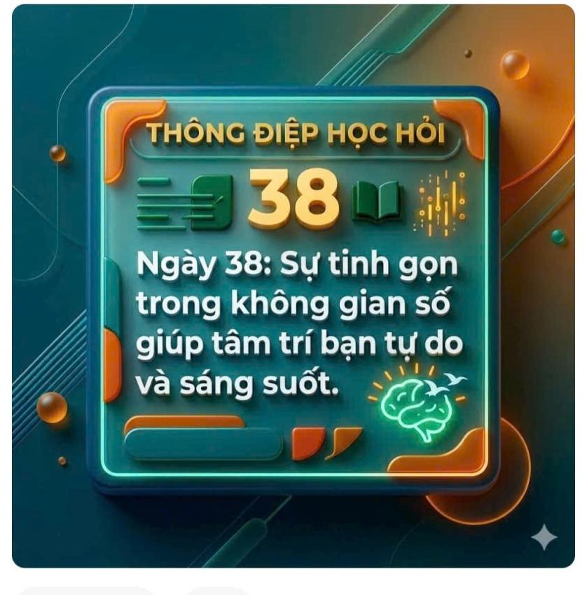 HNI 12/4 Chào các bạn, chúc các bạn một ngày mới thật nhiều niềm vui và làm việc hiệu quả nhé! THÔNG ĐIỆP HỌC HỎI NGÀY 38 Sự tinh gọn trong không gian số giúp tâm trí bạn tự do và sáng suốt. Hãy Dọn dẹp các tệp tin cũ và tắt những thông báo không cần thiết. THÌ Khi ĐÓ không gian ảo ngăn nắp, tư duy sẽ trở nên sắc bén và tập trung hơn. Đọc thêm
