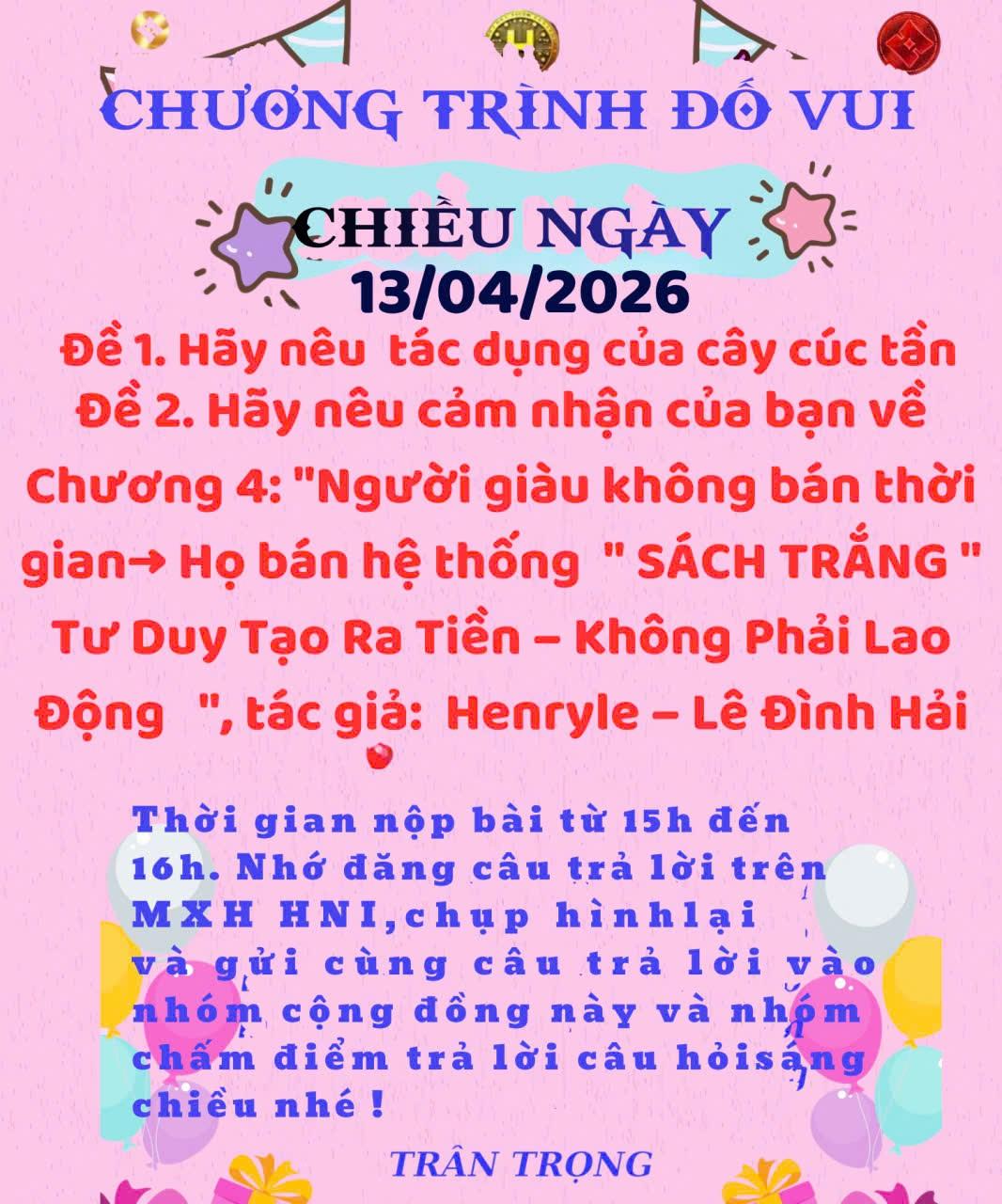 Trả lời câu đố chiều ngày 13/04/2026 Đề 1. Tác dụng của cây cúc tần: Cây cúc tần là một loại dược liệu quen thuộc trong dân gian, có nhiều tác dụng tốt cho sức khỏe như: Giải cảm, hạ sốt, đặc biệt khi bị cảm lạnh Giảm đau nhức xương khớp, đau lưng Hỗ trợ tiêu hóa, giảm đầy hơi Dùng xông giúp thông mũi, dễ thở Có tính kháng viêm, giúp làm lành vết thương nhẹ Đề 2. Cảm nhận về Chương 4 “Người giàu không bán thời gian – họ bán hệ thống”: Chương này giúp mình nhận ra một tư duy rất quan trọng: người giàu không kiếm tiền bằng cách đổi thời gian lấy tiền, mà họ xây dựng hệ thống để tiền tự sinh ra. Mình hiểu rằng nếu chỉ làm việc bằng sức lao động thì thu nhập sẽ bị giới hạn theo thời gian và sức lực. Nhưng khi biết tạo ra hệ thống (kinh doanh, đội nhóm, công nghệ…), mình có thể tạo ra thu nhập thụ động và phát triển bền vững hơn. Chương này truyền cảm hứng cho mình thay đổi tư duy: 👉 Từ làm việc chăm chỉ → sang làm việc thông minh 👉 Từ cá nhân → sang xây dựng hệ thống 👉 Từ kiếm tiền ngắn hạn → sang tạo giá trị lâu dài