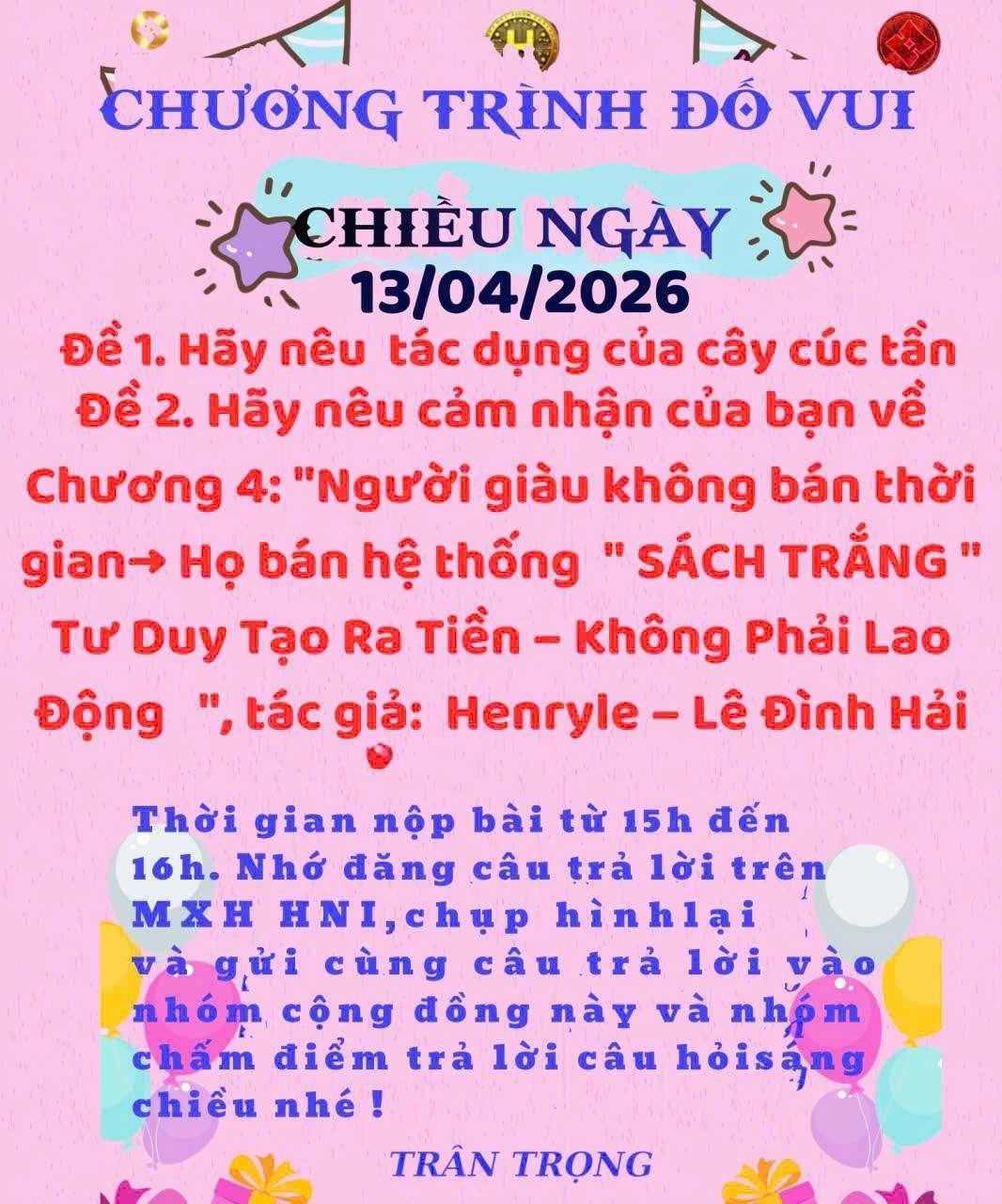 HNI 13/4: Trả lời câu đố chiều: Đề 1: Tác dụng của cây cúc tần: Cây cúc tần (còn gọi là từ bi, đại bi) là một loại cây thuốc nam quen thuộc, có nhiều tác dụng tốt cho sức khỏe. Dưới đây là những công dụng chính:  Tác dụng của cây cúc tần 1. Giảm đau, chống viêm Thường dùng chữa đau nhức xương khớp, đau lưng, đau vai gáy Lá cúc tần rang nóng hoặc nấu nước xông rất hiệu quả 2. Trị cảm lạnh, cảm cúm Nấu nước lá cúc tần để xông giúp ra mồ hôi, giải cảm Có thể kết hợp với sả, gừng, lá bưởi 3. Hỗ trợ tiêu hóa Giúp giảm đầy bụng, khó tiêu Có thể dùng nước sắc lá cúc tần uống 4. Lợi tiểu, thanh nhiệt Giúp cơ thể thải độc, mát gan Hỗ trợ điều trị tiểu tiện khó 5. Chữa bệnh trĩ Lá cúc tần nấu nước xông hoặc rửa giúp giảm đau, giảm sưng búi trĩ 6. Kháng khuẩn, làm lành vết thương Dùng ngoài để rửa vết thương nhẹ, giảm viêm  Lưu ý khi sử dụng Không nên dùng quá nhiều hoặc kéo dài Phụ nữ mang thai nên hỏi ý kiến bác sĩ trước khi dùng Nếu có bệnh nặng, nên kết hợp điều trị y khoa. Đề 2: Cảm nhận Chương 4: “Người giàu không bán thời gian – họ bán hệ thống” trong sách trắng : " Tư duy tạo ra tiền - Không phải lao động" tác giả Henry Lê) Chương 4 giống như một cú “bẻ lái tư duy” mạnh mẽ. Nó đặt ra một sự thật mà nhiều người không muốn đối diện: đa số chúng ta đang bán thời gian để đổi lấy tiền, trong khi người giàu lại xây dựng hệ thống để tiền tự chảy về. Điều khiến mình ấn tượng nhất là cách chương này phân biệt rõ hai con đường: Người bình thường: làm càng nhiều → kiếm càng nhiều → mệt càng nhiều Người giàu: xây hệ thống → tối ưu vận hành → thu nhập tăng mà không cần hiện diện liên tục Đây không chỉ là sự khác biệt về cách kiếm tiền, mà là sự khác biệt về cách nhìn cuộc đời.  1. Thời gian là hữu hạn – hệ thống là vô hạn Chương này chỉ ra một sự thật đơn giản: Bạn có 24 giờ mỗi ngày, dù cố gắng đến đâu cũng không thể vượt qua giới hạn này. Nhưng hệ thống thì khác. Một hệ thống tốt có thể: Hoạt động khi bạn ngủ Mở rộng không giới hạn Nhân bản giá trị ra hàng ngàn người => Đây chính là đòn bẩy (leverage) – thứ mà người giàu luôn tìm kiếm.  2. Người giàu không làm hết – họ thiết kế Một tư duy rất “đắt giá” trong chương này là: “Đừng làm tất cả – hãy tạo ra thứ khiến mọi thứ tự vận hành.”
