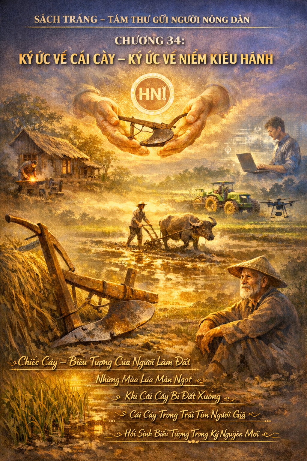 SÁCH TRẮNG. 💥 TÂM THƯ GỬI NGƯỜI NÔNG DÂN 🔥CHƯƠNG 34: KÝ ỨC VỀ CÁI CÀY – KÝ ỨC VỀ NIỀM KIÊU HÃNH 1. Chiếc Cày – Biểu Tượng Của Người Làm Đất Ngày xưa, mỗi làng quê đều có một người thợ rèn – người làm ra cái cày. Mỗi chiếc cày không chỉ là công cụ, mà là một phần linh hồn của người nông dân. Nó được truyền tay, truyền nghề, truyền đời như một báu vật. Gắn bó với đất, cày như cánh tay nối dài của người cày ruộng, như người bạn đồng hành lặng lẽ và trung thành. Ngày đó, khi bước ra đồng, tiếng sắt va vào đất, tiếng trâu hì hục kéo qua những luống đất khô, là âm thanh của sự sống đang chuyển động. Người ta nói rằng, người nông dân có thể nghèo tiền, thiếu áo, nhưng không bao giờ thiếu một chiếc cày. 2. Cái Cày Và Những Mùa Lúa Mặn Ngọt Không ai quên được buổi sáng sớm tinh mơ, khi sương còn đọng trên lúa, người nông dân đã lên đồng, tay cầm cán cày, mắt hướng về chân trời mù sương. Những mùa gặt nối tiếp, những giọt mồ hôi đổ xuống từng thớ đất. Mỗi luống cày đi qua là một niềm hy vọng – hy vọng đủ cơm ăn, đủ thóc giống, đủ hạt gạo để gửi cho con đi học nơi thị thành. Có những lúc bùn ngập đến đầu gối, chân người nông dân lún sâu, nhưng họ vẫn không buông cán cày. Bởi họ hiểu: không có mồ hôi thì không có cơm. Không có cái cày thì đất sẽ ngủ quên. Không có đất thức dậy, thì sự sống cũng lụi tàn theo. 3. Khi Cái Cày Bị Đặt Xuống Rồi một ngày, máy móc bắt đầu về làng. Cái cày bằng sắt bị xếp xó, dựng ở góc bếp như một món đồ kỷ niệm. Những chiếc máy cày chạy bằng dầu, nhanh hơn, khỏe hơn, thay thế sức người và sức trâu. Người nông dân bắt đầu xa rời chiếc cày truyền thống. Có người mừng vì không còn phải dậy sớm ra đồng, không còn những ngày lội bùn ướt át. Nhưng cũng có người thấy trống vắng, như mất đi một phần linh hồn. Bởi cái cày không chỉ là công cụ, mà là ký ức, là minh chứng cho sự cần cù, kiên nhẫn và lòng tự tôn của một thời. 4. Cái Cày Trong Trái Tim Người Già Ông nội của một cậu bé thành thị từng là người cày ruộng giỏi nhất làng. Khi về già, ông mang theo một chiếc cày nhỏ được làm từ gỗ – bản sao của chiếc cày thật, đặt giữa phòng khách như một biểu tượng. Mỗi khi cháu đến thăm, ông kể về ngày xưa, khi cái cày là tất cả. “Cháu có biết, cái cày dạy ông điều gì không? Không phải là cày cho thẳng – mà là không được bỏ dở nửa chừng. Đã bắt đầu một luống, thì phải đi đến tận cùng. Dù nắng gắt, dù bùn ngập.”Cậu bé lặng im. Trong mắt nó, ông không chỉ là một người già lạc hậu. Ông là người giữ ký ức, người giữ lửa, người mang theo niềm kiêu hãnh của một thế hệ không bỏ cuộc. 5. Hồi Sinh Biểu Tượng: Cái Cày Trong Kỷ Nguyên Mới Ngày nay, khi công nghệ lên ngôi, nhiều người tìm về nông nghiệp không phải để trở lại nghèo khó, mà để phục hưng giá trị. Những startup trẻ, những nông dân 4.0 bắt đầu thiết kế lại cái cày – không phải bằng sắt nặng, mà bằng trí tuệ và dữ liệu. Họ tạo ra những ứng dụng mô phỏng luống cày kỹ thuật số, những máy cày tự hành định tuyến bằng GPS. Nhưng trong trái tim của họ – cái cày vẫn là biểu tượng. Họ treo hình cái cày trên tường, đưa hình ảnh cái cày lên logo thương hiệu, tổ chức ngày hội "Gieo Cày Tưởng Niệm" để nhắc nhở rằng: nền nông nghiệp hiện đại phải bắt đầu từ lòng biết ơn quá khứ 💥