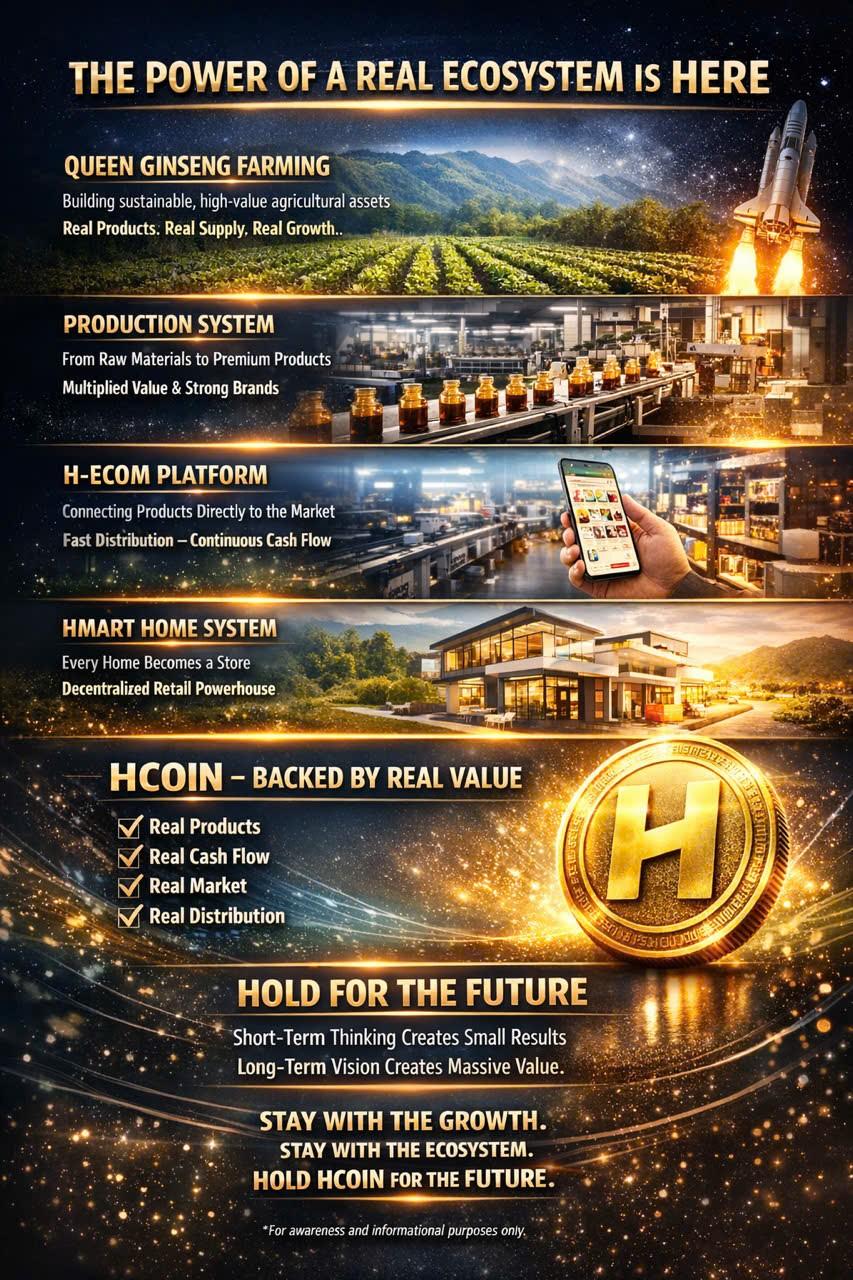 🚀 KHI HỆ SINH THÁI BẮT ĐẦU VẬN HÀNH – GIÁ TRỊ THẬT SẼ LÊN TIẾNG Trong giai đoạn đầu, mọi tài sản đều được định giá bằng niềm tin. Nhưng khi hệ sinh thái bắt đầu vận hành thực tế, giá trị sẽ được quyết định bởi dòng tiền – sản phẩm – thị trường. Và đó chính là thời điểm quan trọng của Hcoin. ⸻ 🌱 TRỤ CỘT 1: VÙNG TRỒNG SÂM NỮ HOÀNG – GIÁ TRỊ TỪ NỀN TẢNG THẬT Việc phát triển vùng trồng sâm nữ hoàng quy mô lớn không chỉ đơn thuần là nông nghiệp, mà là xây dựng: • Chuỗi cung ứng dược liệu giá trị cao • Nguồn nguyên liệu bền vững, lâu dài • Tài sản thật gắn liền với đất và sản xuất Sâm không chỉ là sản phẩm – mà là dòng tiền lặp lại theo chu kỳ, tạo nền móng vững chắc cho toàn bộ hệ sinh thái. ⸻ 🏭 TRỤ CỘT 2: HỆ THỐNG SẢN XUẤT – CHỦ ĐỘNG GIÁ TRỊ Khi có nhà máy sản xuất: • Chủ động chế biến sâu (trà sâm, cafe sâm, thực phẩm chức năng…) • Gia tăng giá trị sản phẩm gấp nhiều lần • Kiểm soát chất lượng & thương hiệu Đây là bước chuyển từ nguyên liệu thô → sản phẩm thương hiệu → lợi nhuận cao. ⸻ 🛒 TRỤ CỘT 3: SÀN THƯƠNG MẠI ĐIỆN TỬ H-ECOM Sự ra đời của H-Ecom giúp: • Kết nối trực tiếp sản phẩm đến người tiêu dùng • Giảm phụ thuộc trung gian • Tạo dòng tiền nhanh và liên tục Đây chính là “đường cao tốc” đưa sản phẩm ra thị trường toàn quốc và quốc tế. ⸻ 🏪 TRỤ CỘT 4: HỆ THỐNG SIÊU THỊ TẠI NHÀ HMART Hmart không chỉ là điểm bán, mà là: • Mạng lưới phân phối phủ rộng • Mô hình “mỗi nhà là một cửa hàng” • Gia tăng tốc độ tiêu thụ sản phẩm Khi hàng triệu điểm bán nhỏ được kết nối, sức mạnh sẽ trở nên khổng lồ. ⸻ 💎 HCOIN – GIÁ TRỊ ĐƯỢC HẬU THUẪN BỞI HỆ SINH THÁI Khi 4 trụ cột cùng vận hành: • Có sản phẩm thật • Có dòng tiền thật • Có thị trường thật • Có hệ thống phân phối thật ➡️ Hcoin không còn là kỳ vọng, mà trở thành tài sản gắn liền với tăng trưởng thực tế. ⸻ 📈 THÔNG ĐIỆP DÀNH CHO CỘNG ĐỒNG Giai đoạn này không còn là lúc nhìn ngắn hạn. Đây là thời điểm của tầm nhìn dài hạn và sự kiên định. • Người bán sớm sẽ nhìn vào hiện tại • Người nắm giữ sẽ nhìn vào tương lai 👉 Giá trị lớn nhất không đến từ việc “lướt sóng”, mà đến từ việc đồng hành cùng một hệ sinh thái đang tăng trưởng. ⸻ 🔥 KẾT LUẬN